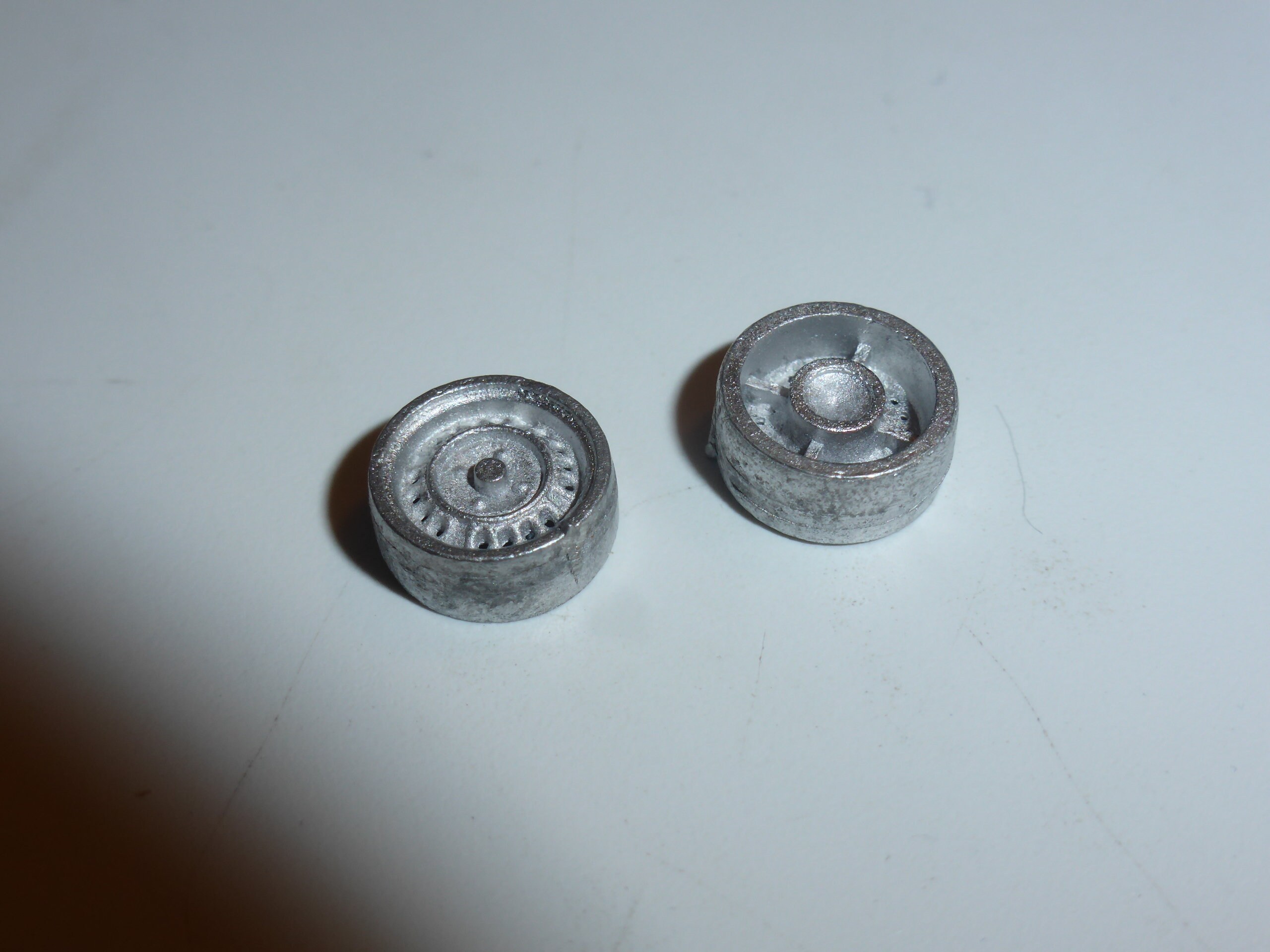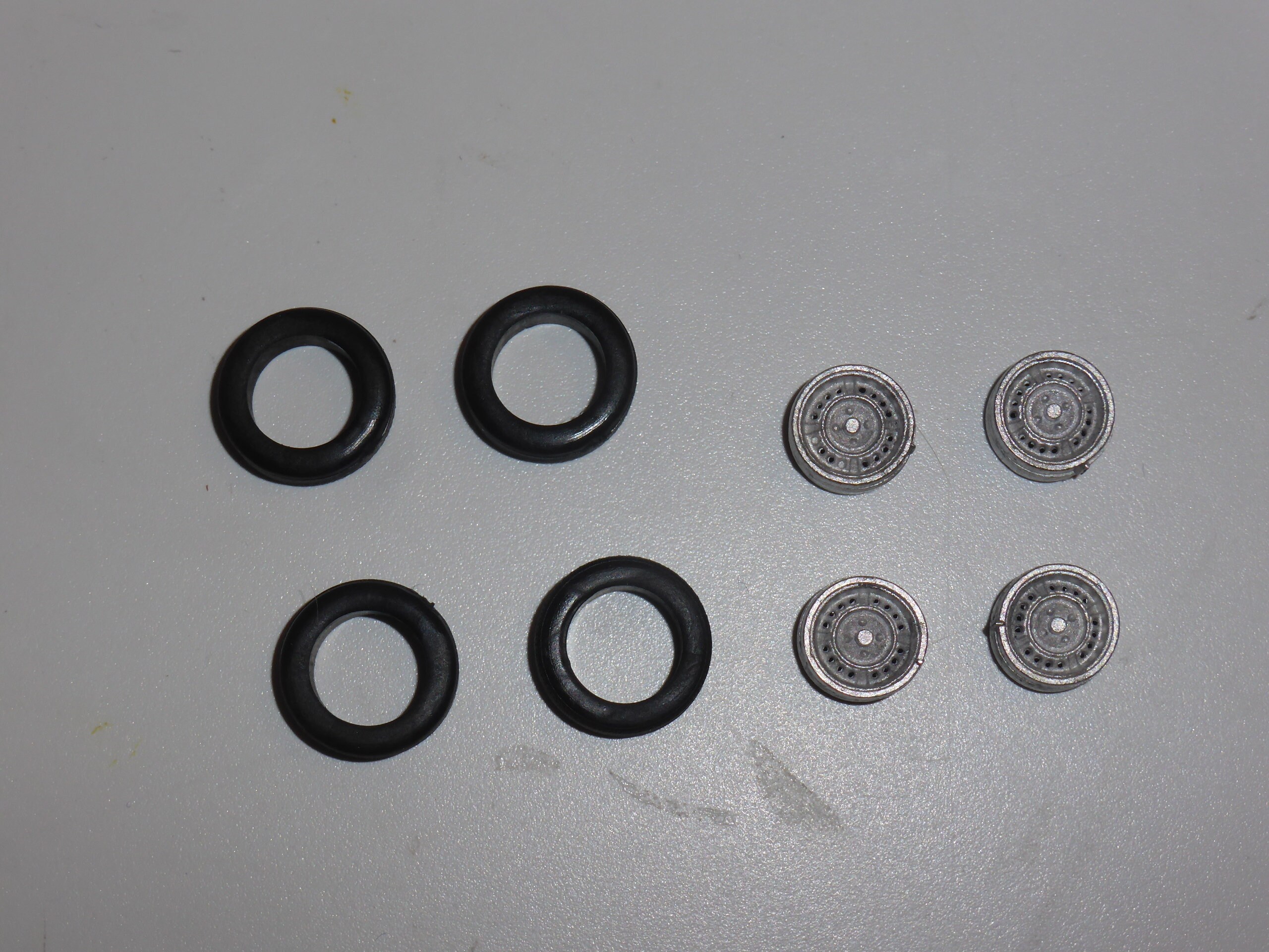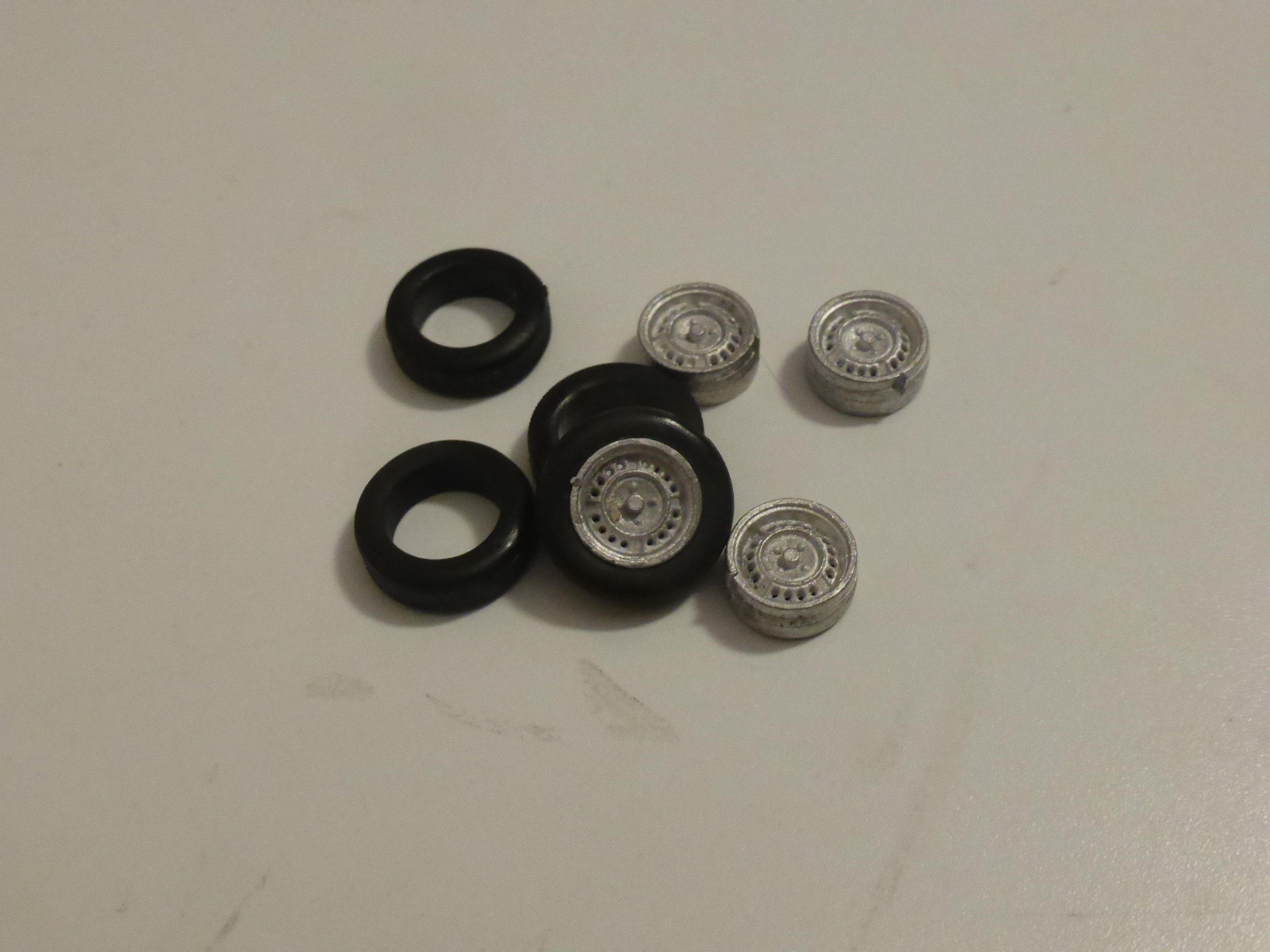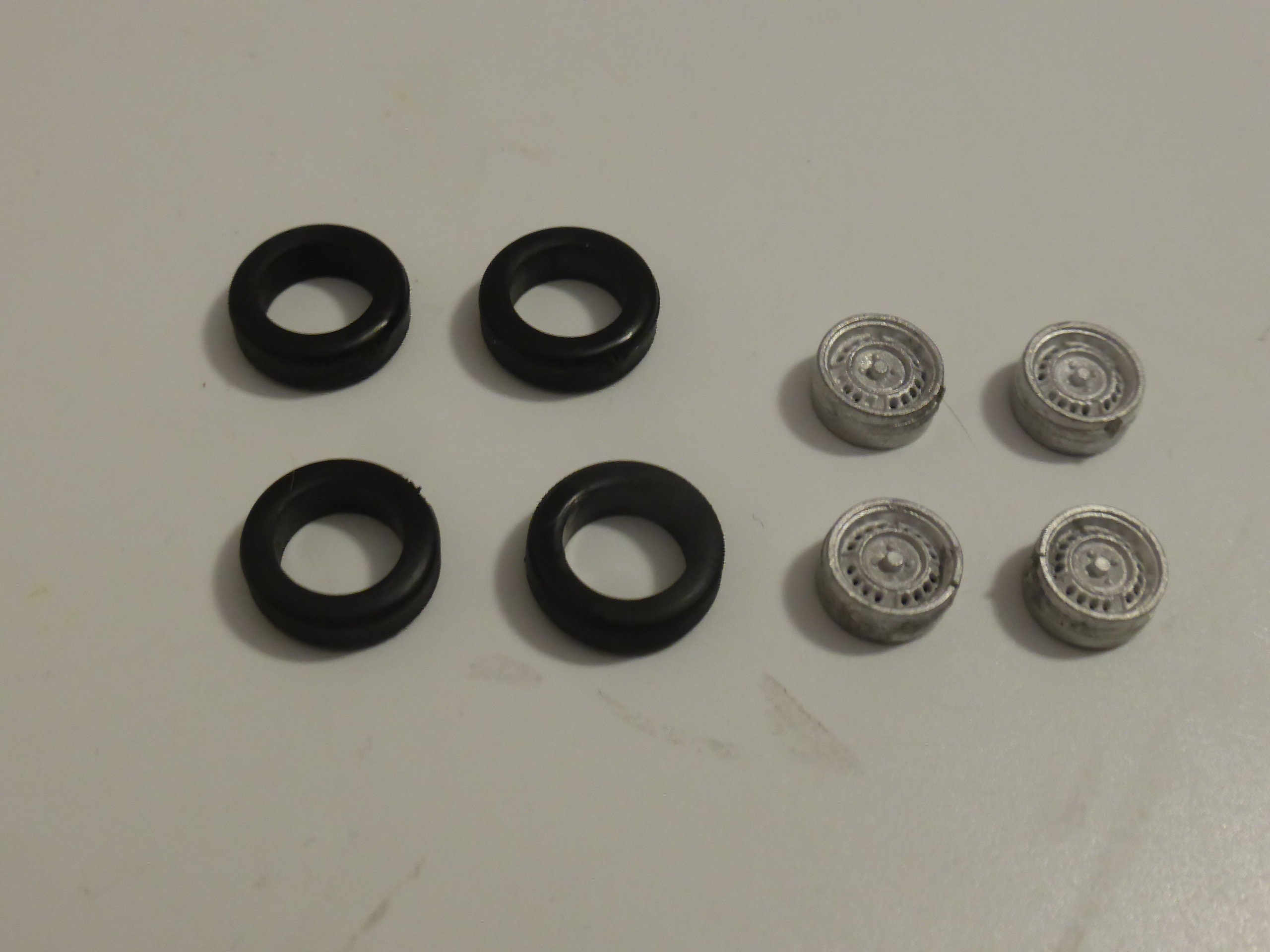 High definition white metal rims with treaded tires.