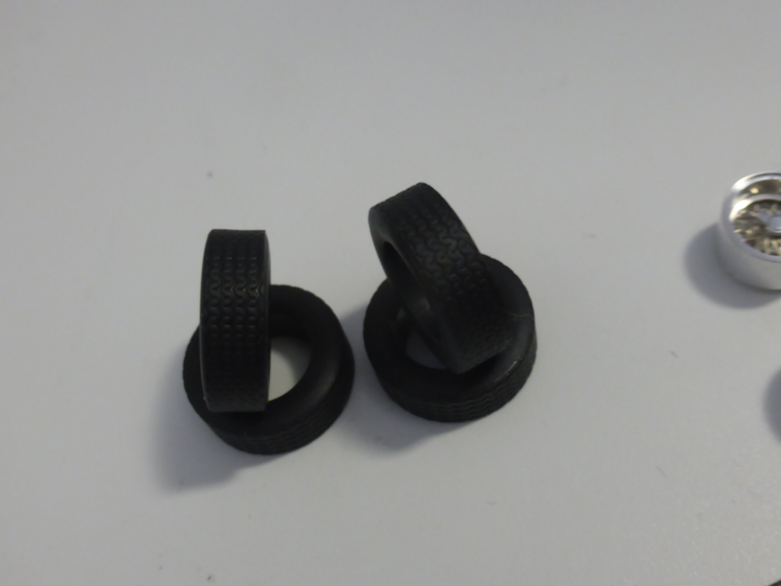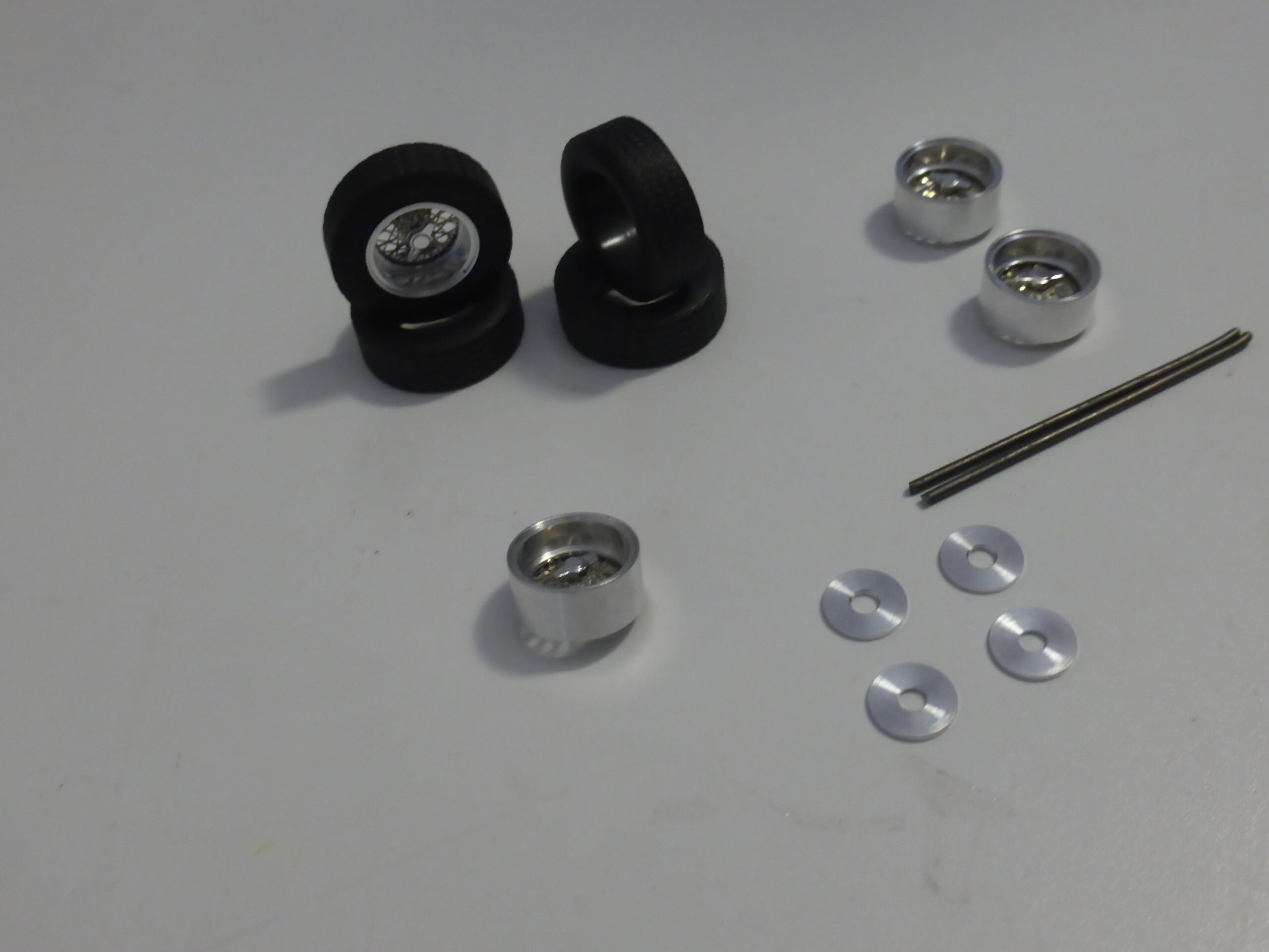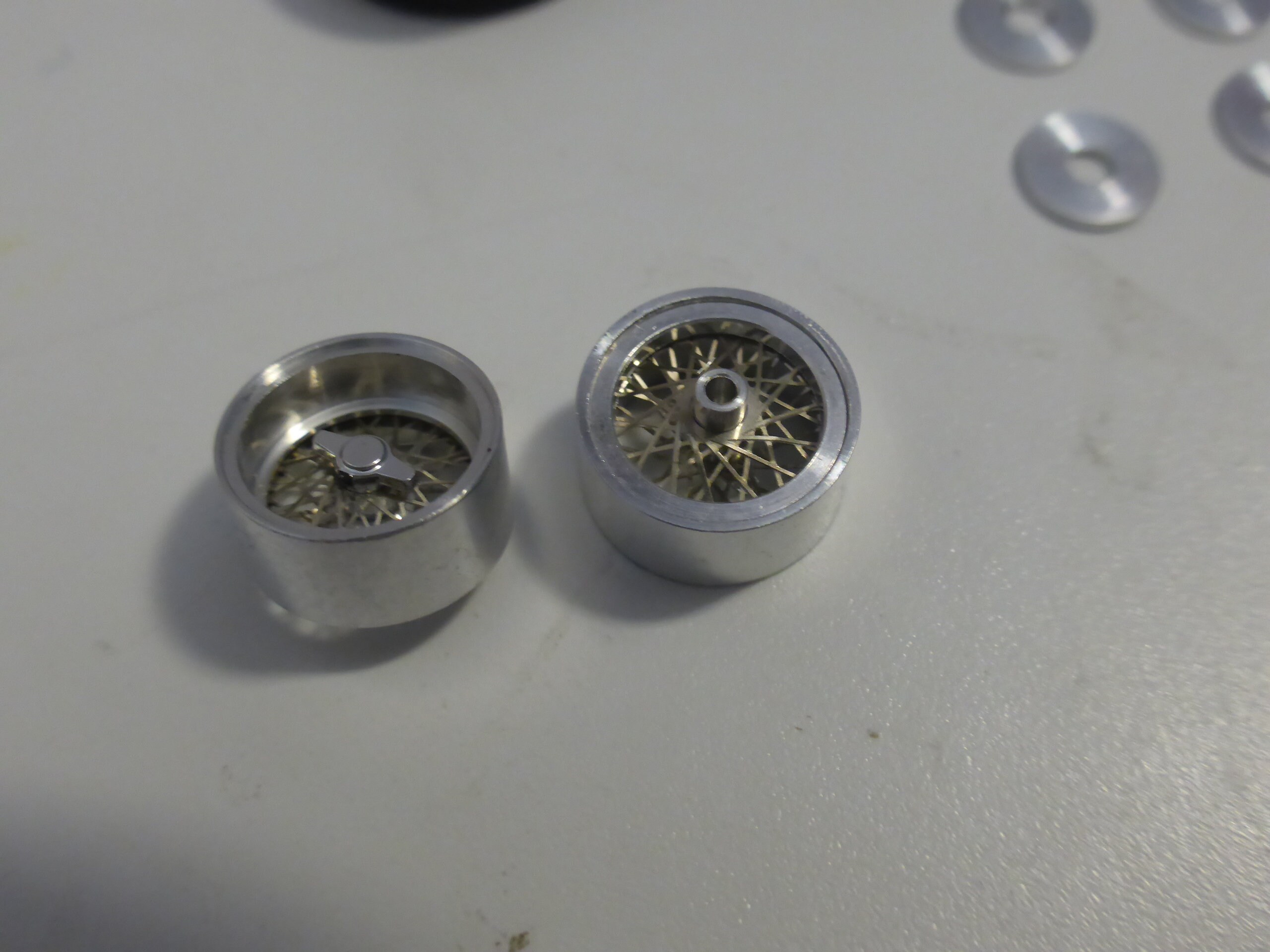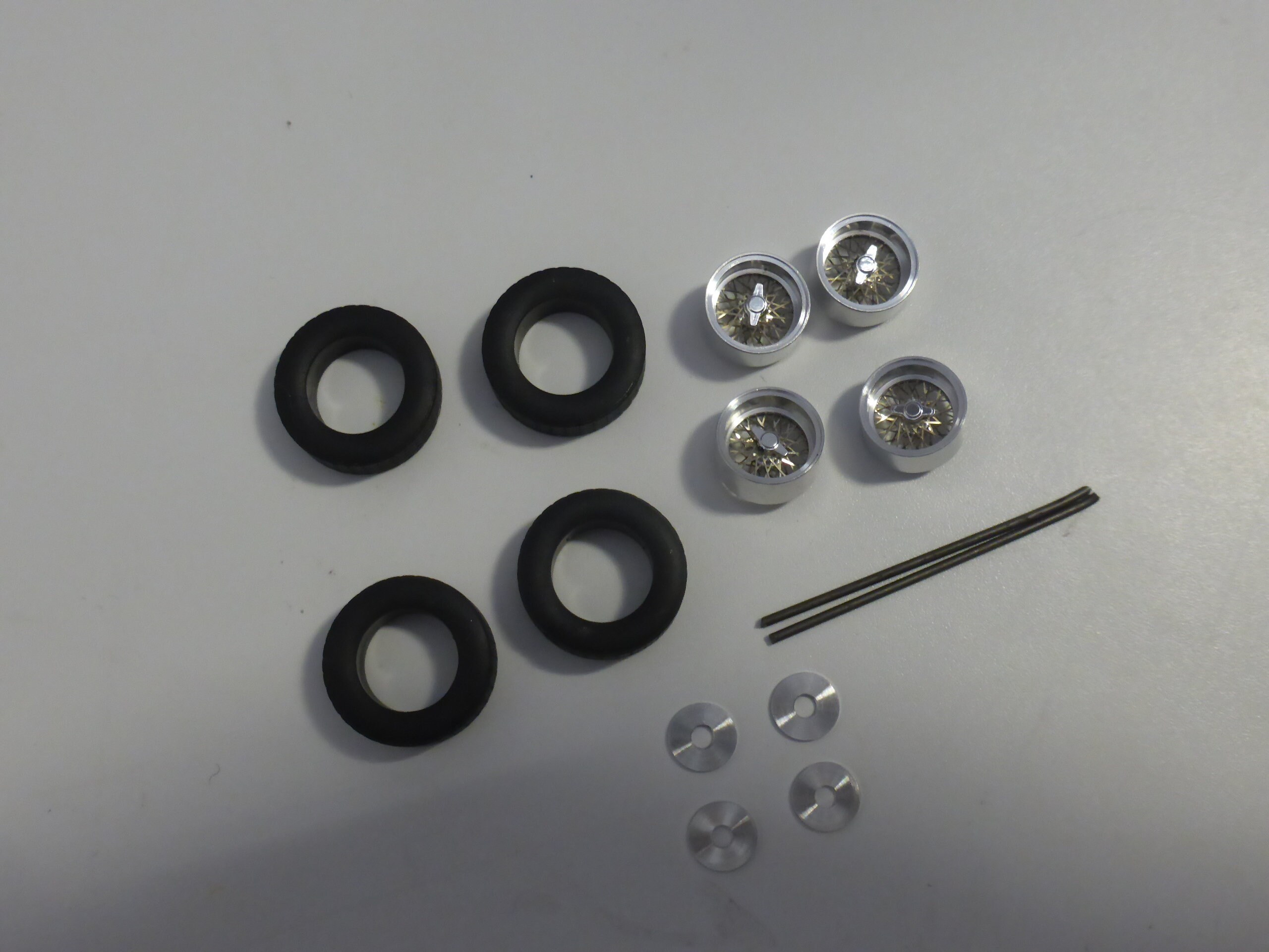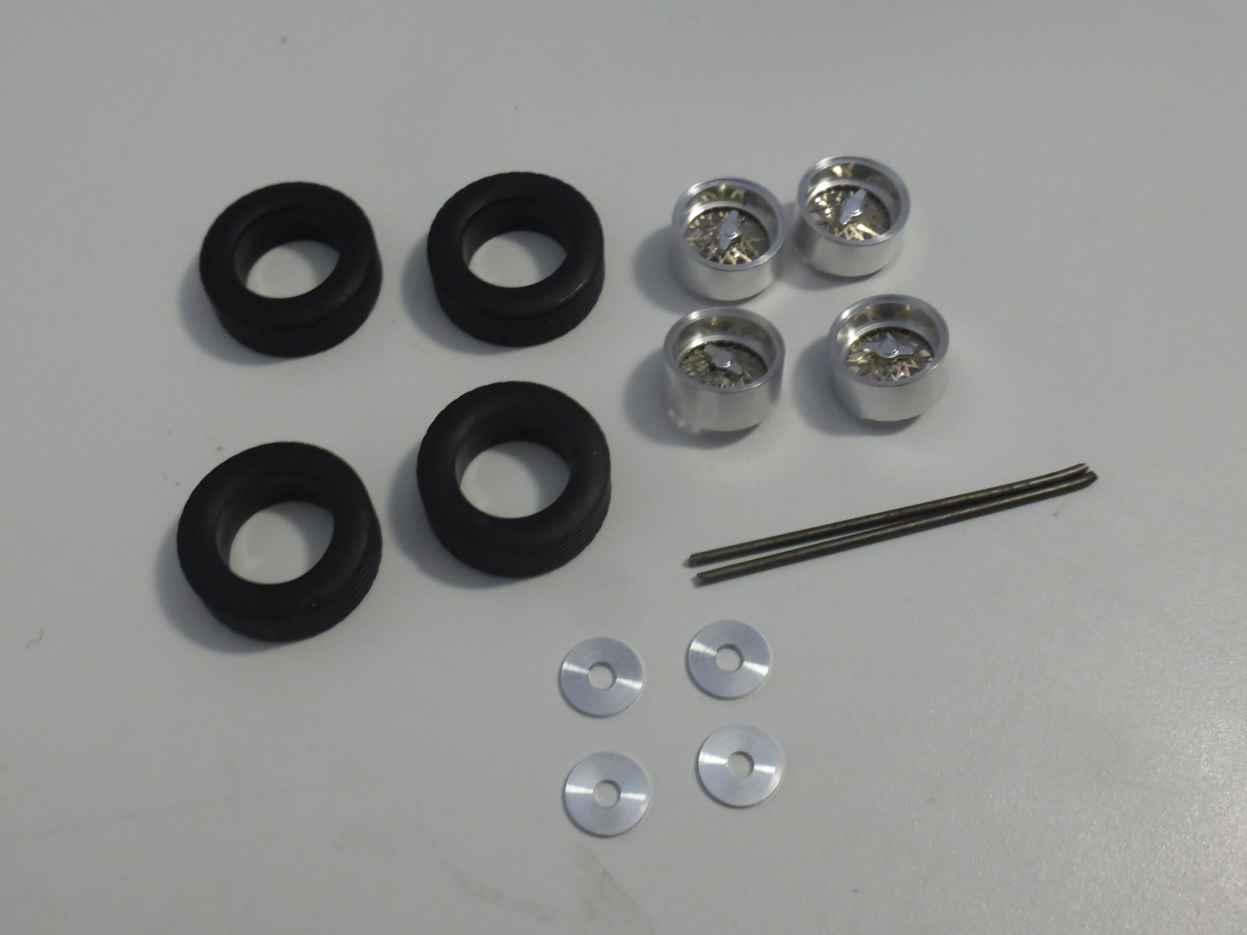 Turned aluminium rims, rubber high definition tires, photo-etched wires.