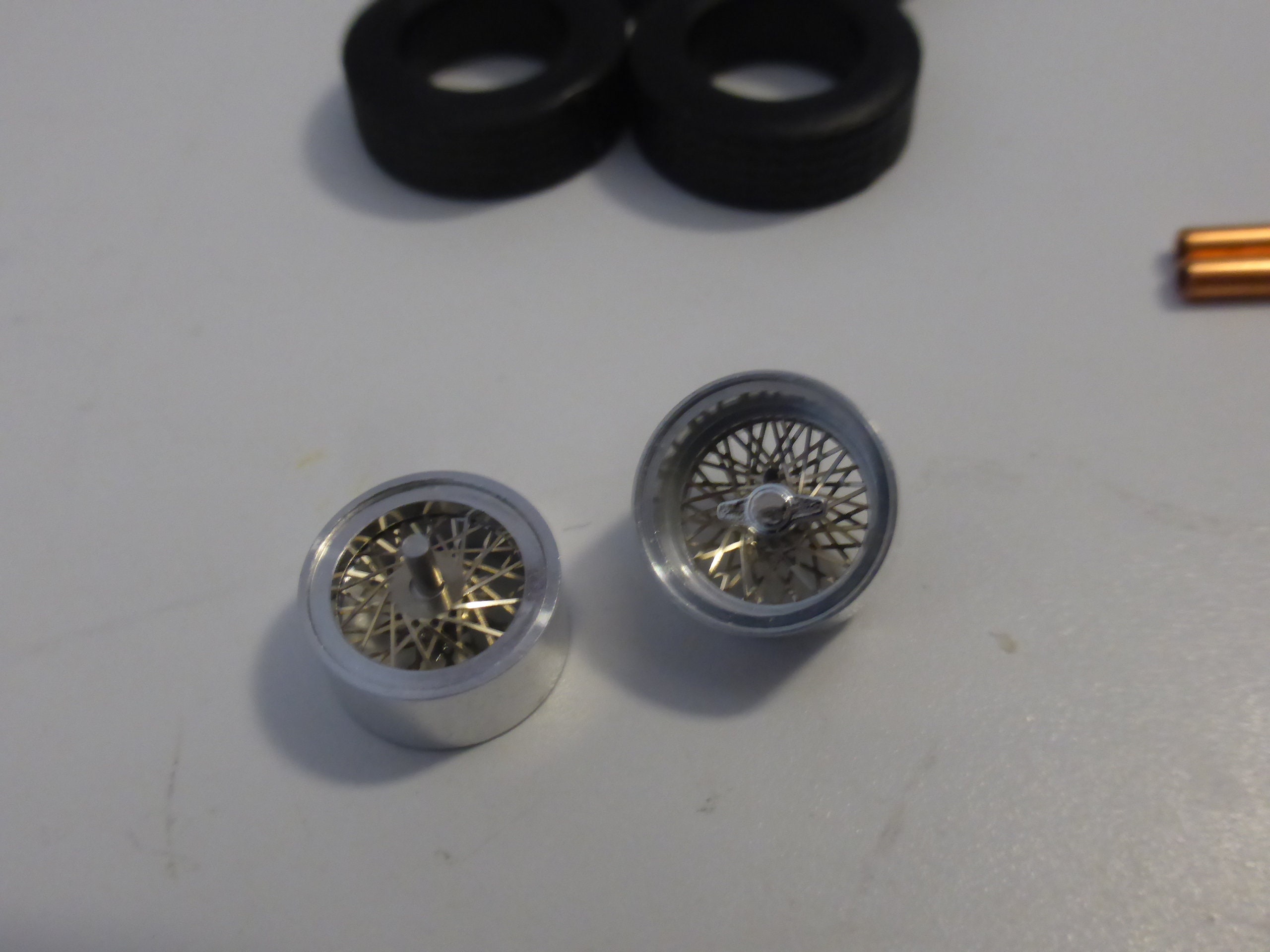Turned aluminium rims, rubber high definition tires, photo-etched wires.