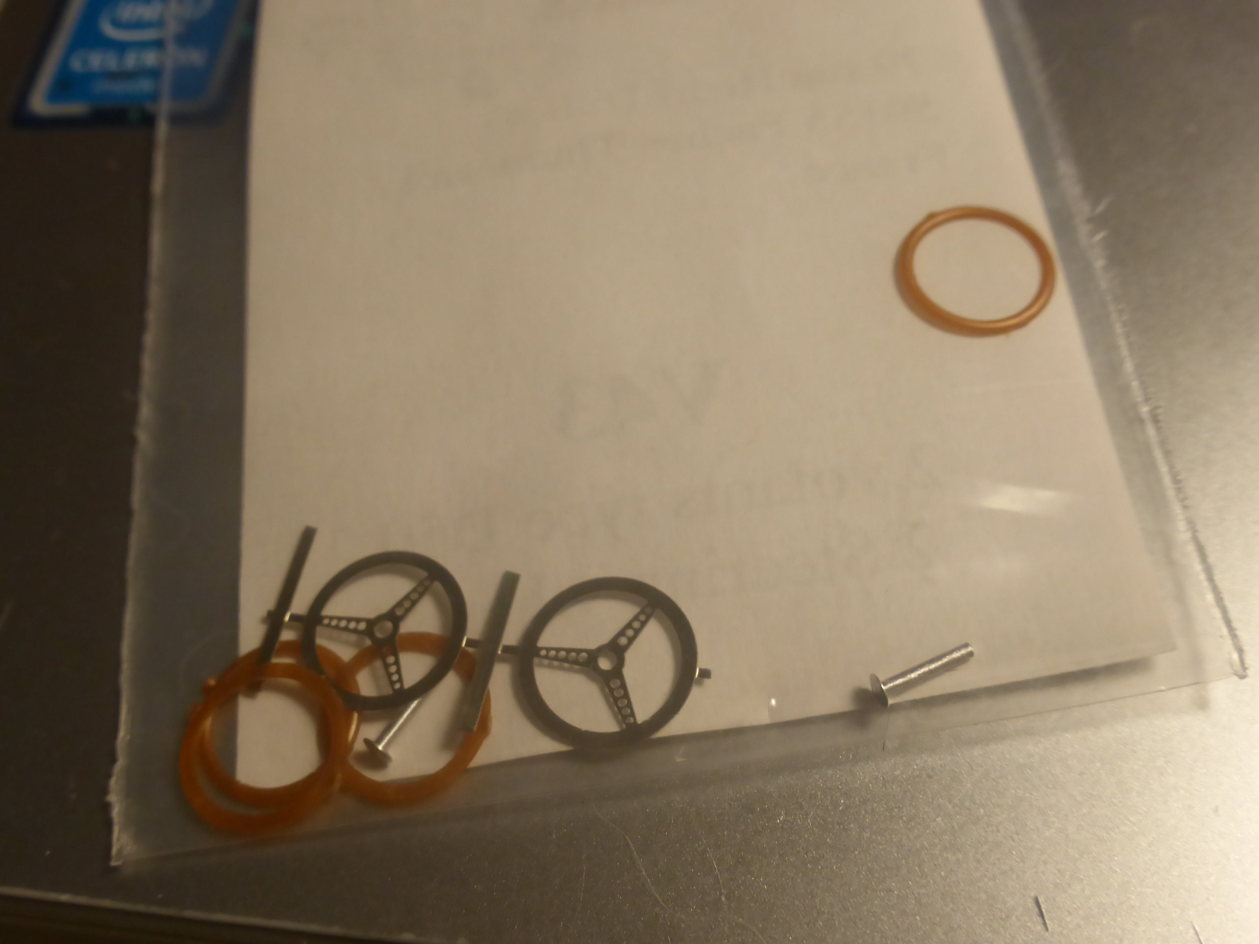 Photetched central part (see photos for reference), plastic crown, machined aluminium support.
