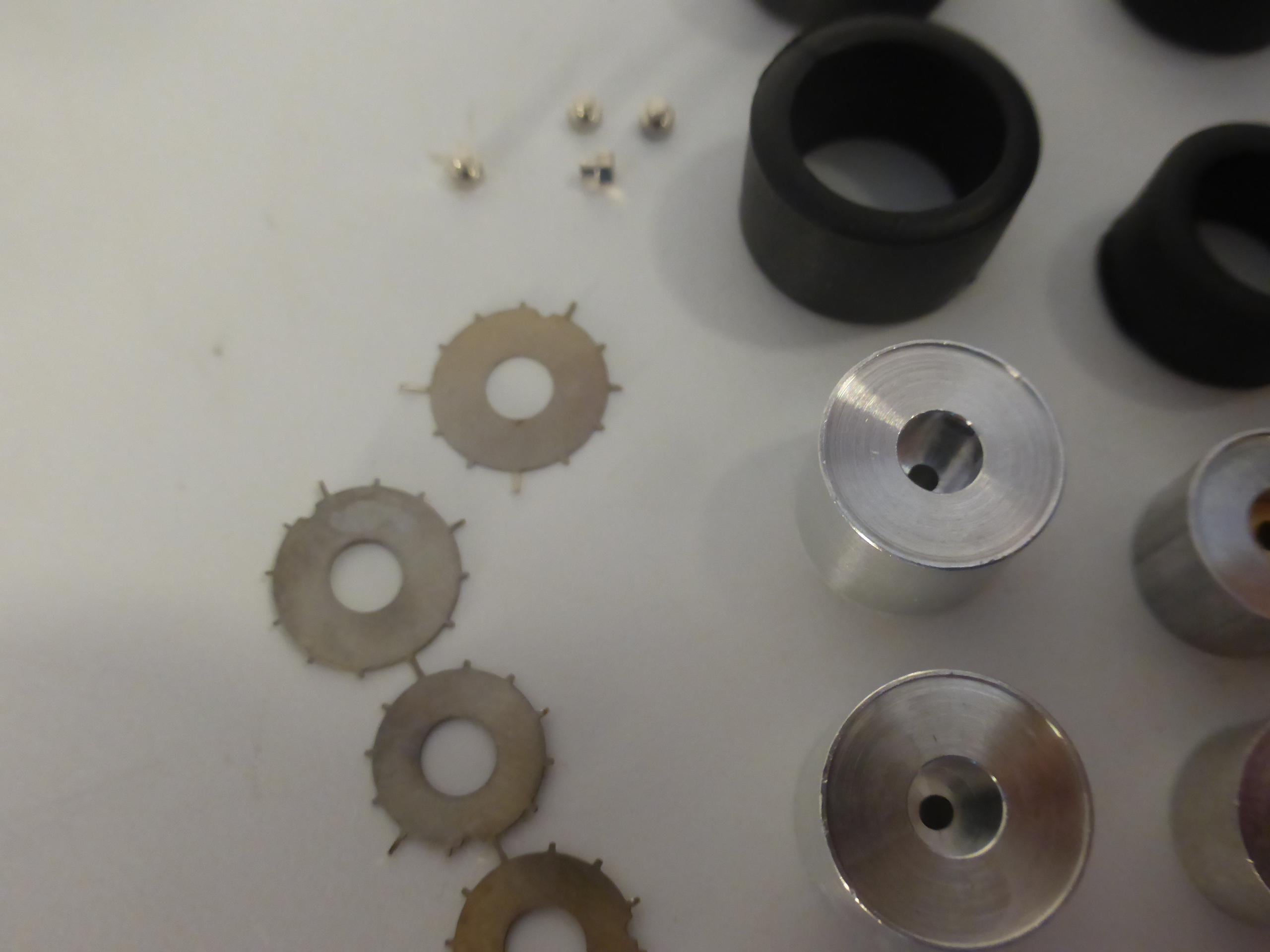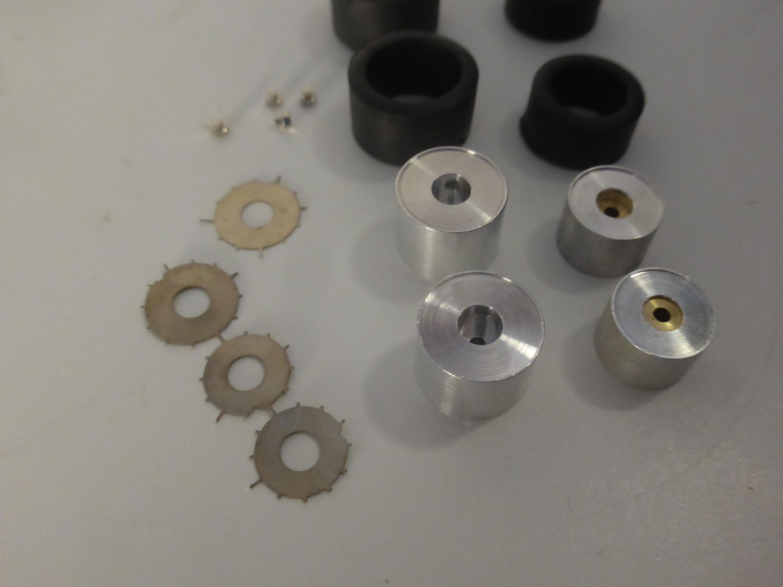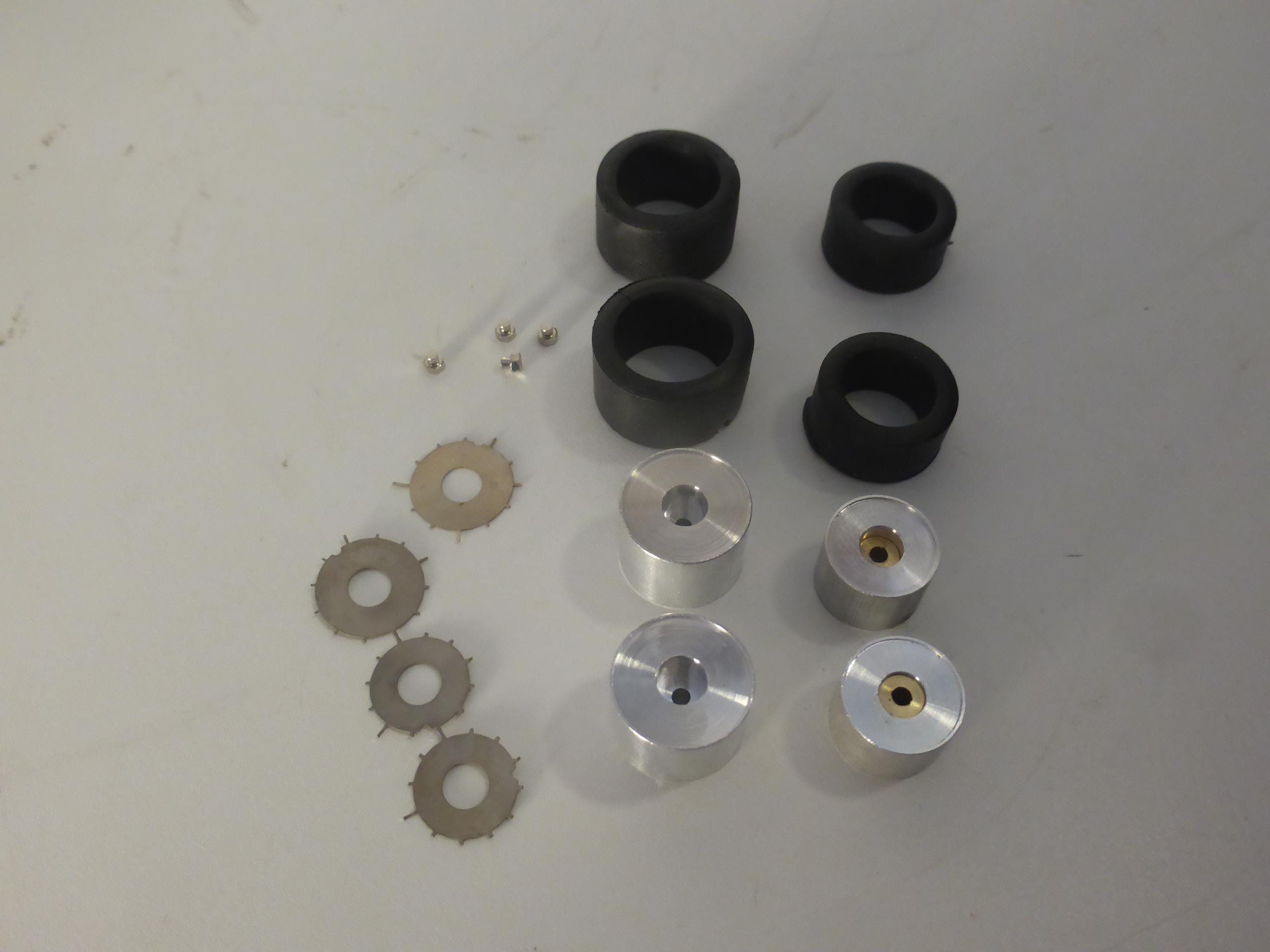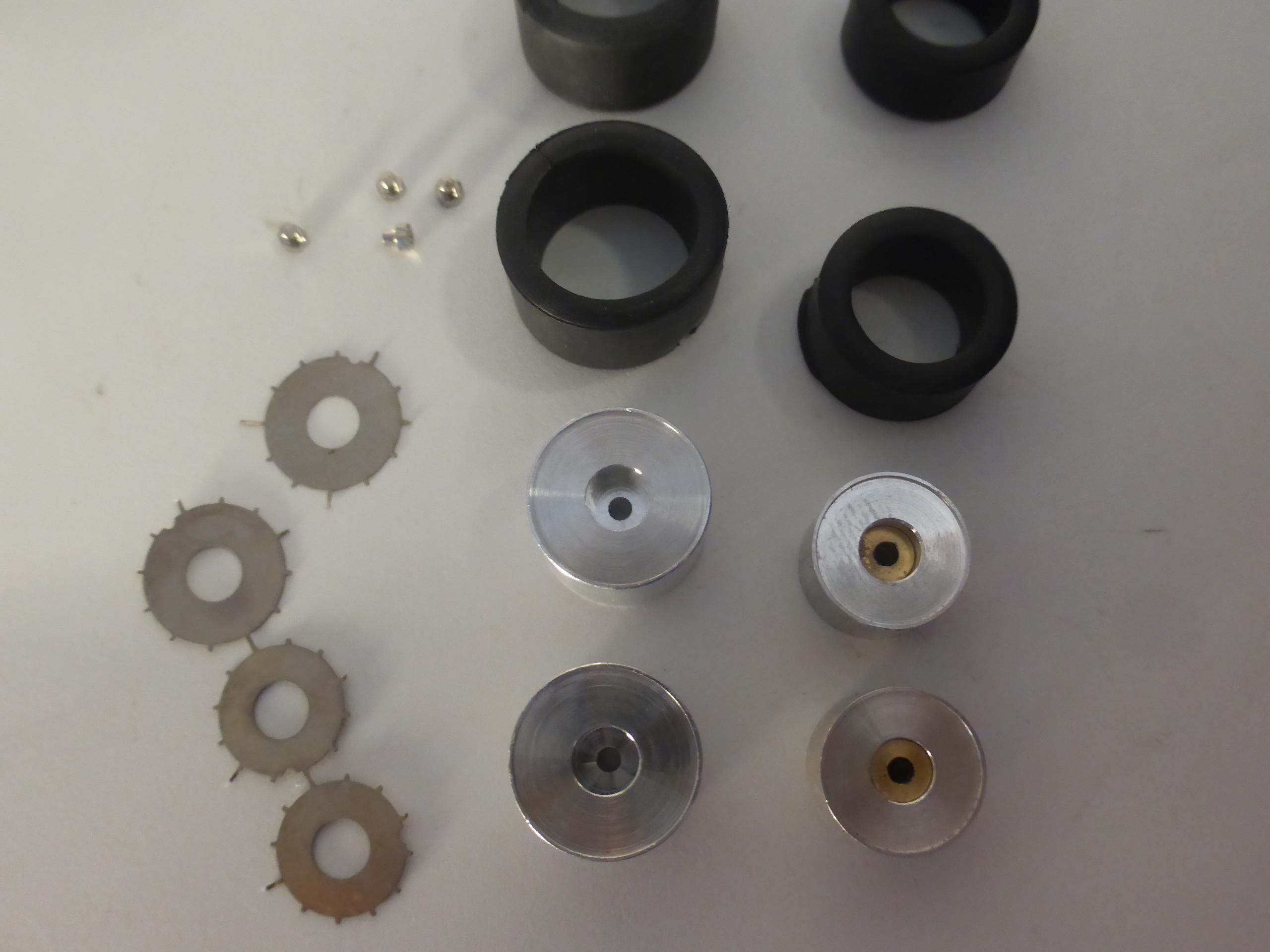 Turned aluminium rim, plus photoetched part and machined aluminium hubs. Slick rubber tires.
