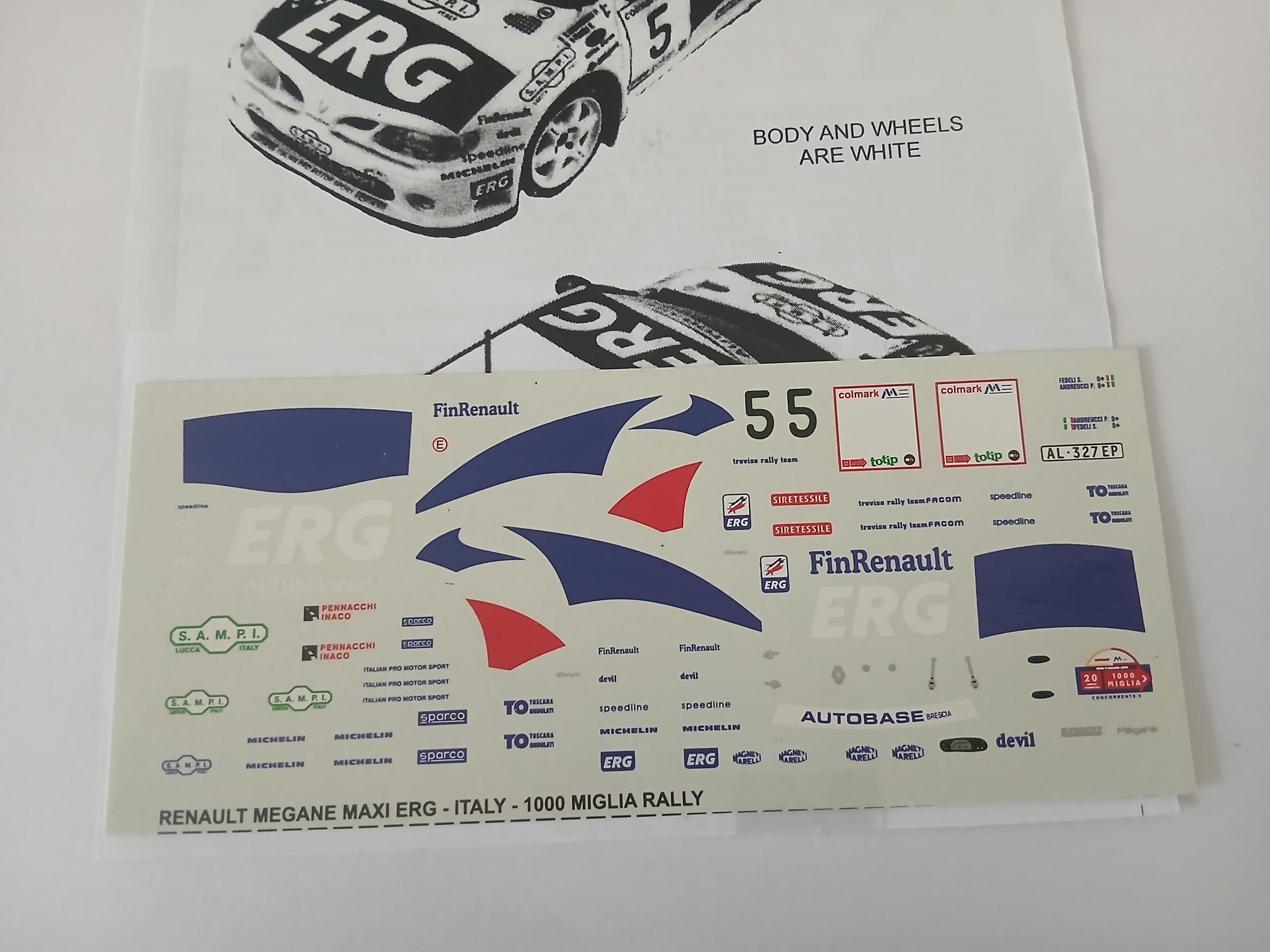 1:43 waterslide decals sheet for Renault Mégane Maxi Rally Mille Miglia 1998 #5 Andreucci Carpena 43.121