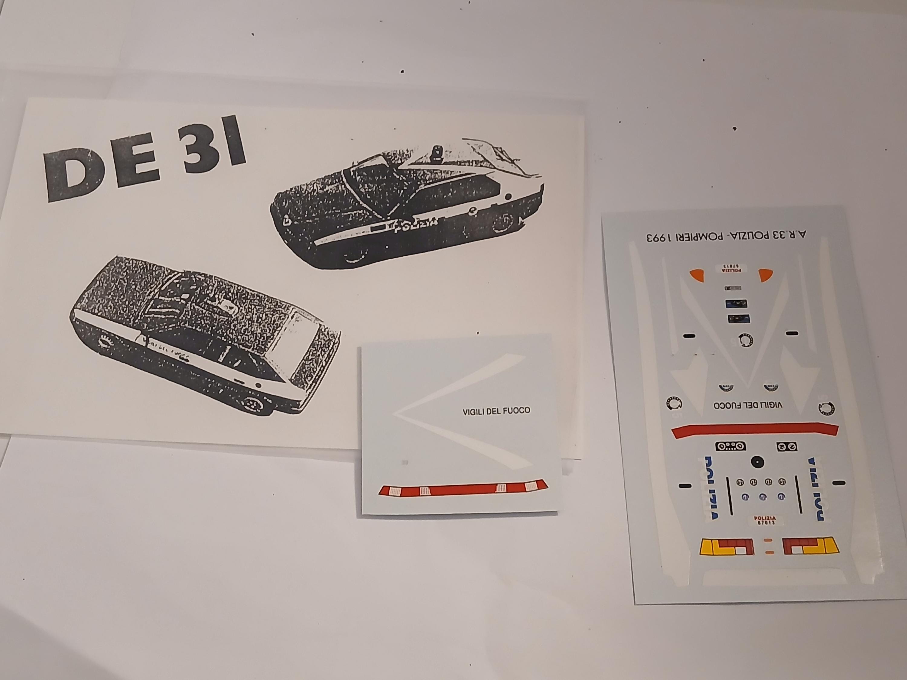 1:43 waterslide decals sheet for Alfa Romeo 33 1993 Polizia and Vigili del Fuoco (Italy) Tron DE31