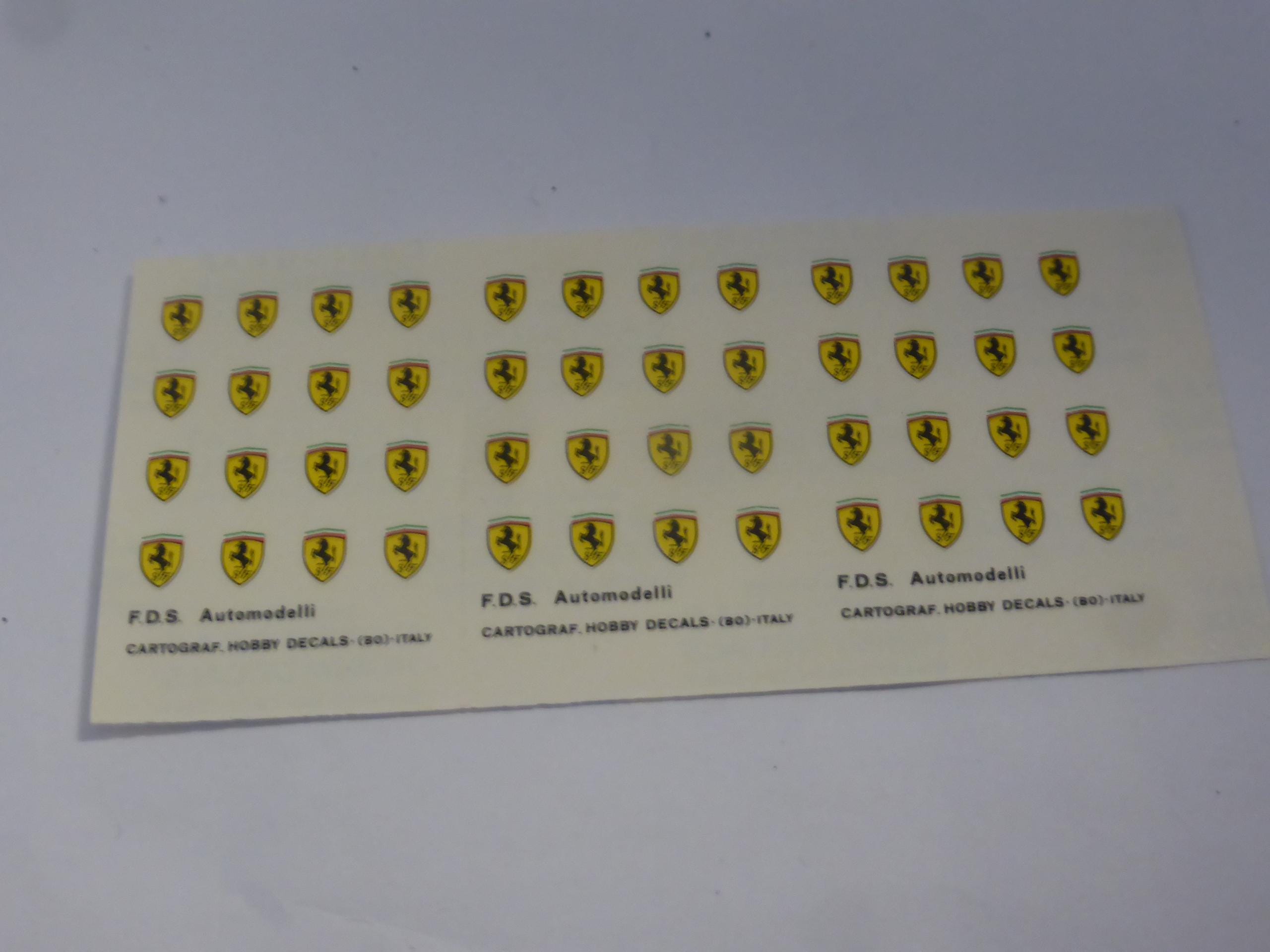 48 side Ferrari badges, fit 1:43 scale modelcars. Sizes: height mm 4.55 (approx) / width mm 3.30 (approx)