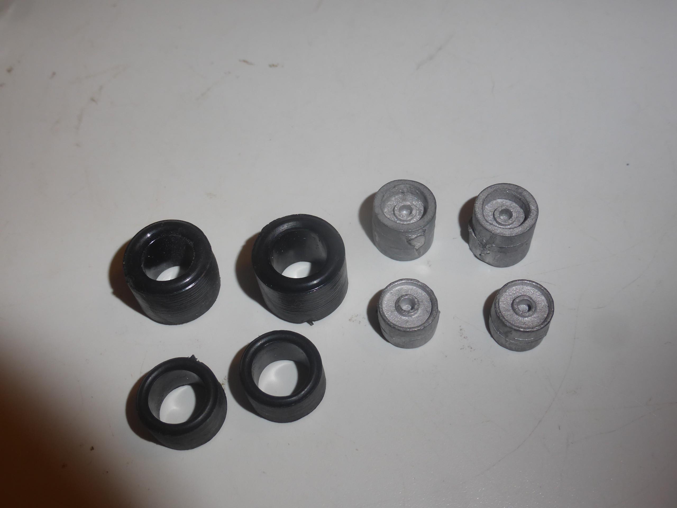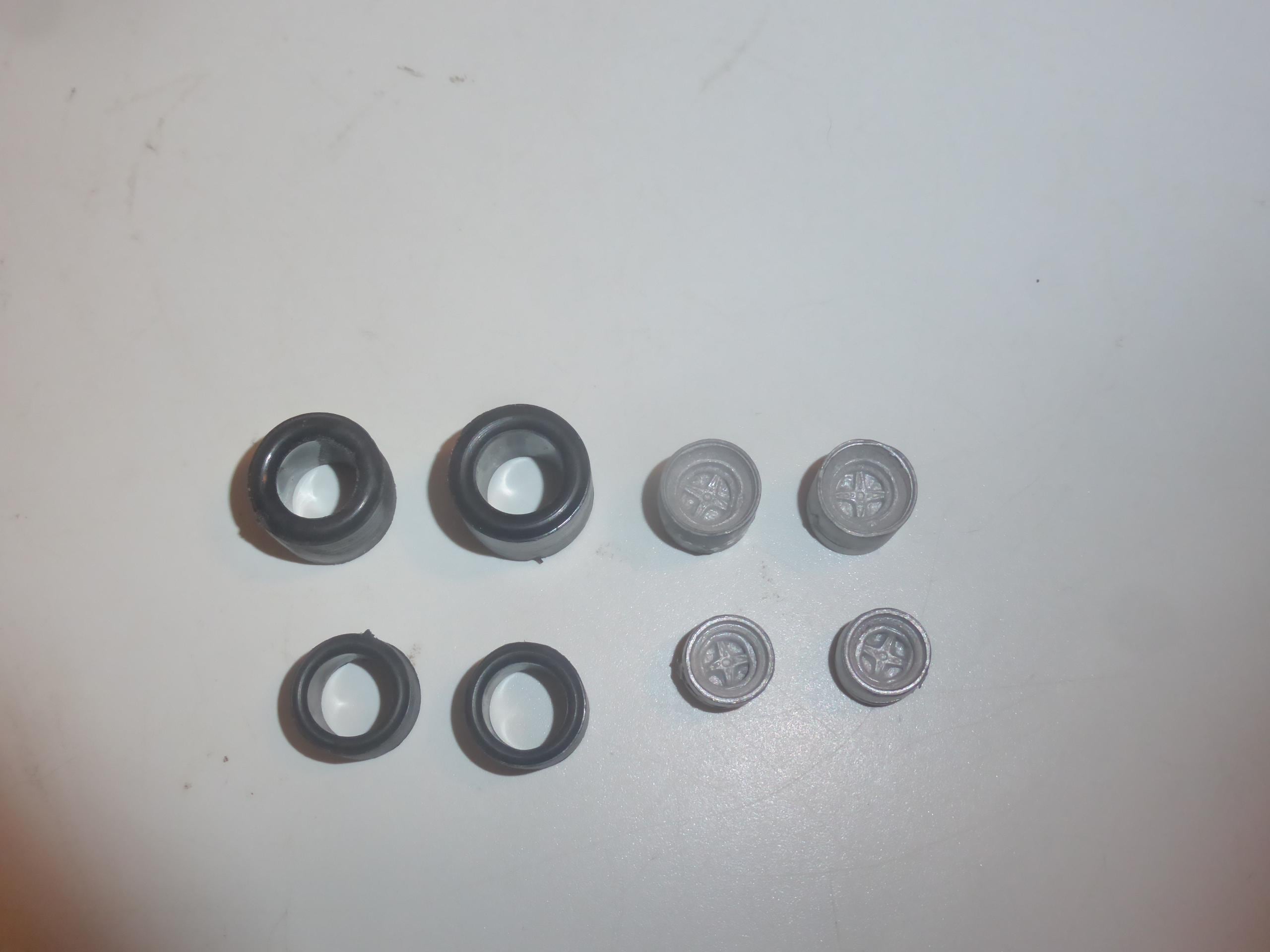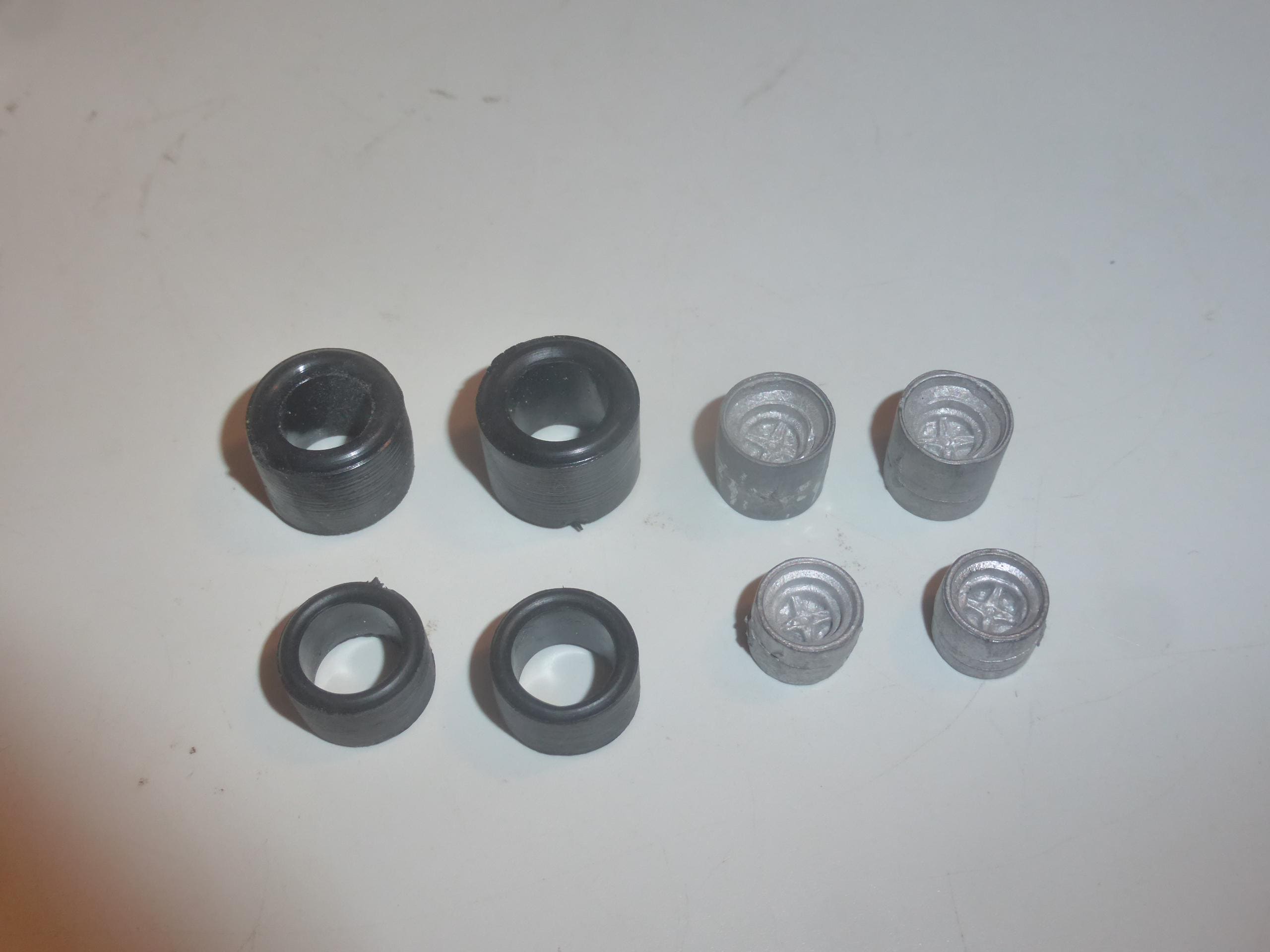 Set of white metal wheels and rubber slick tires. See photo for shape.