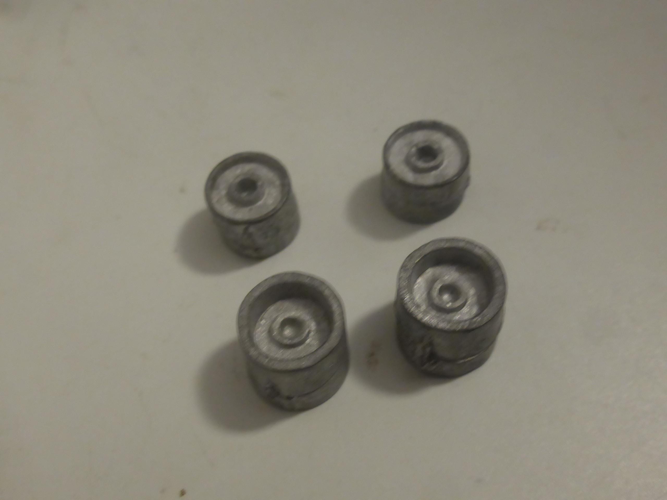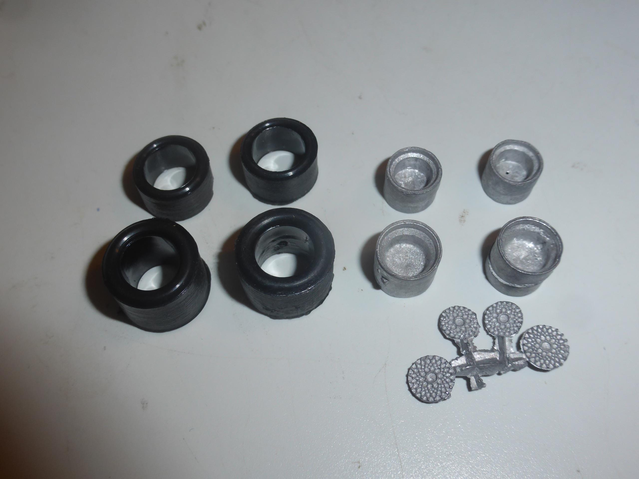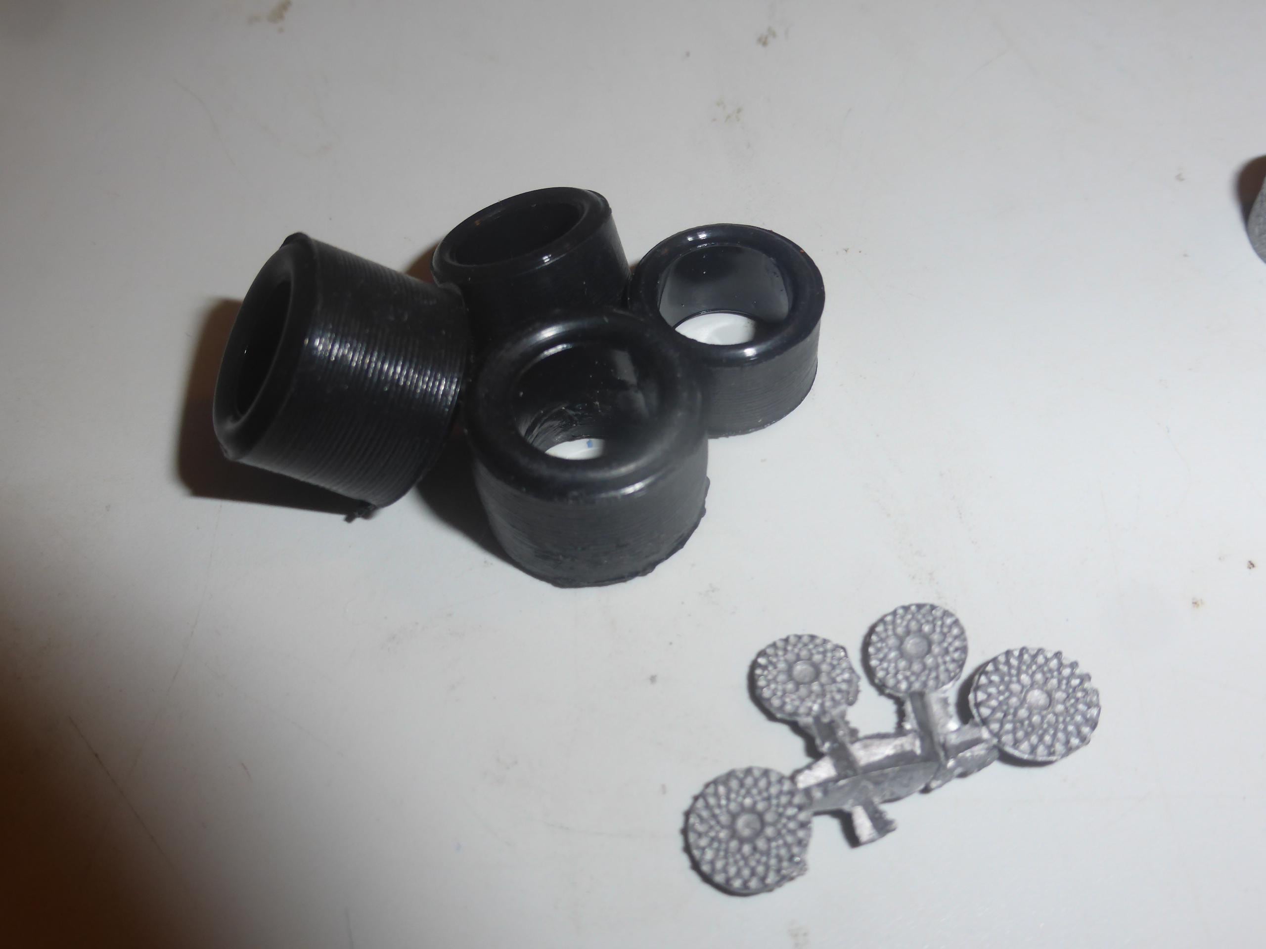 Set of white metal wheels and rubber slick tires.