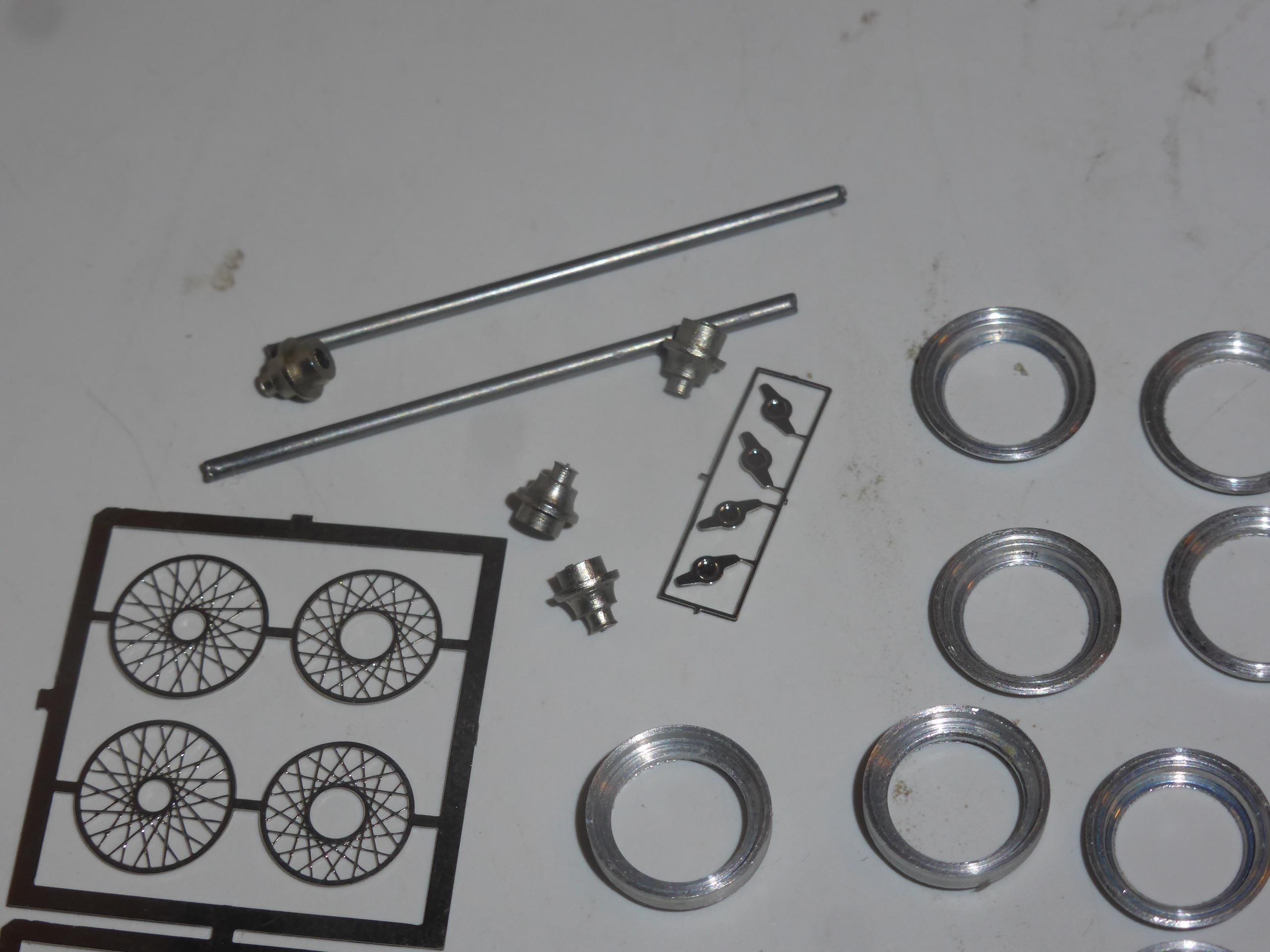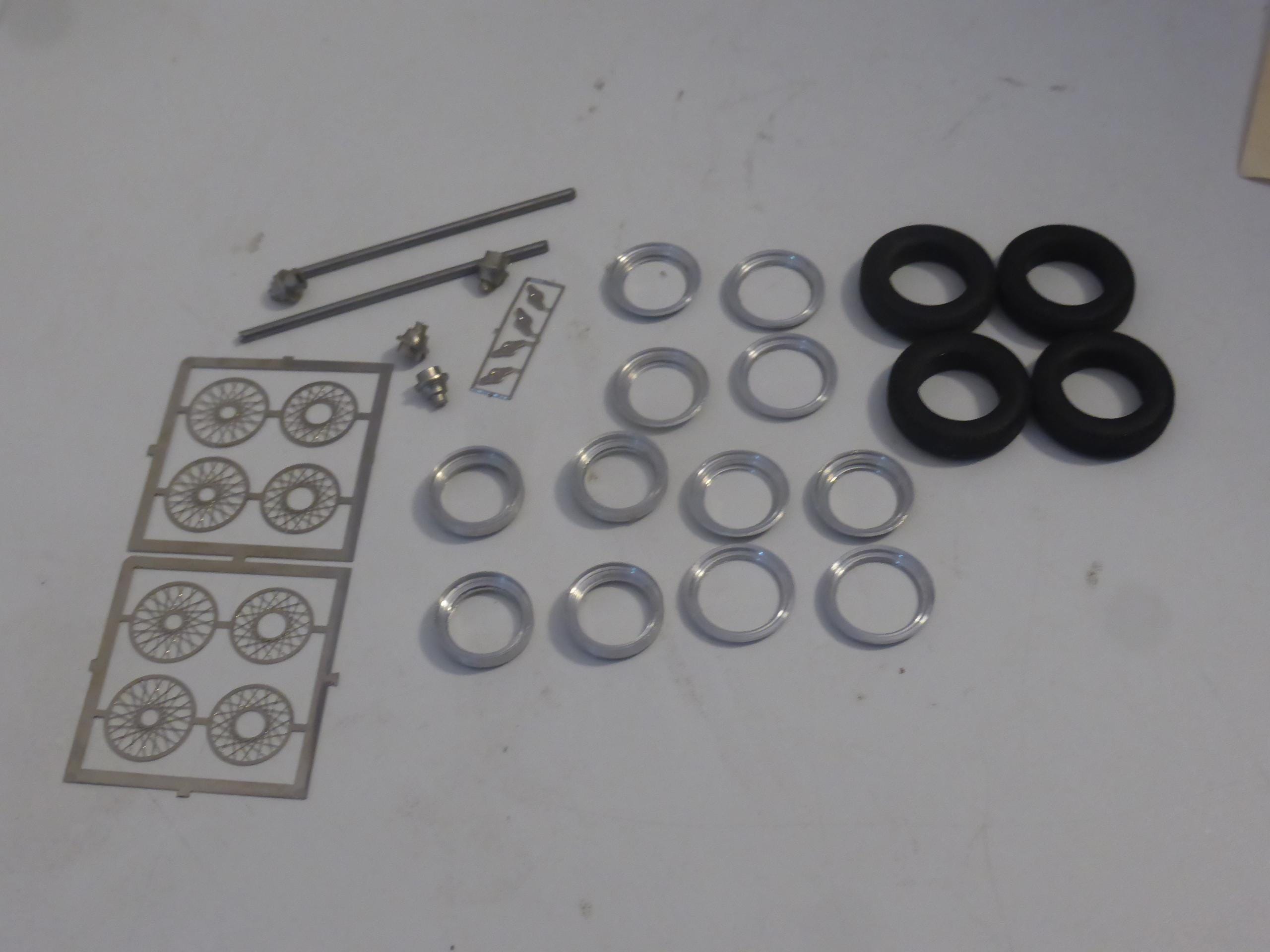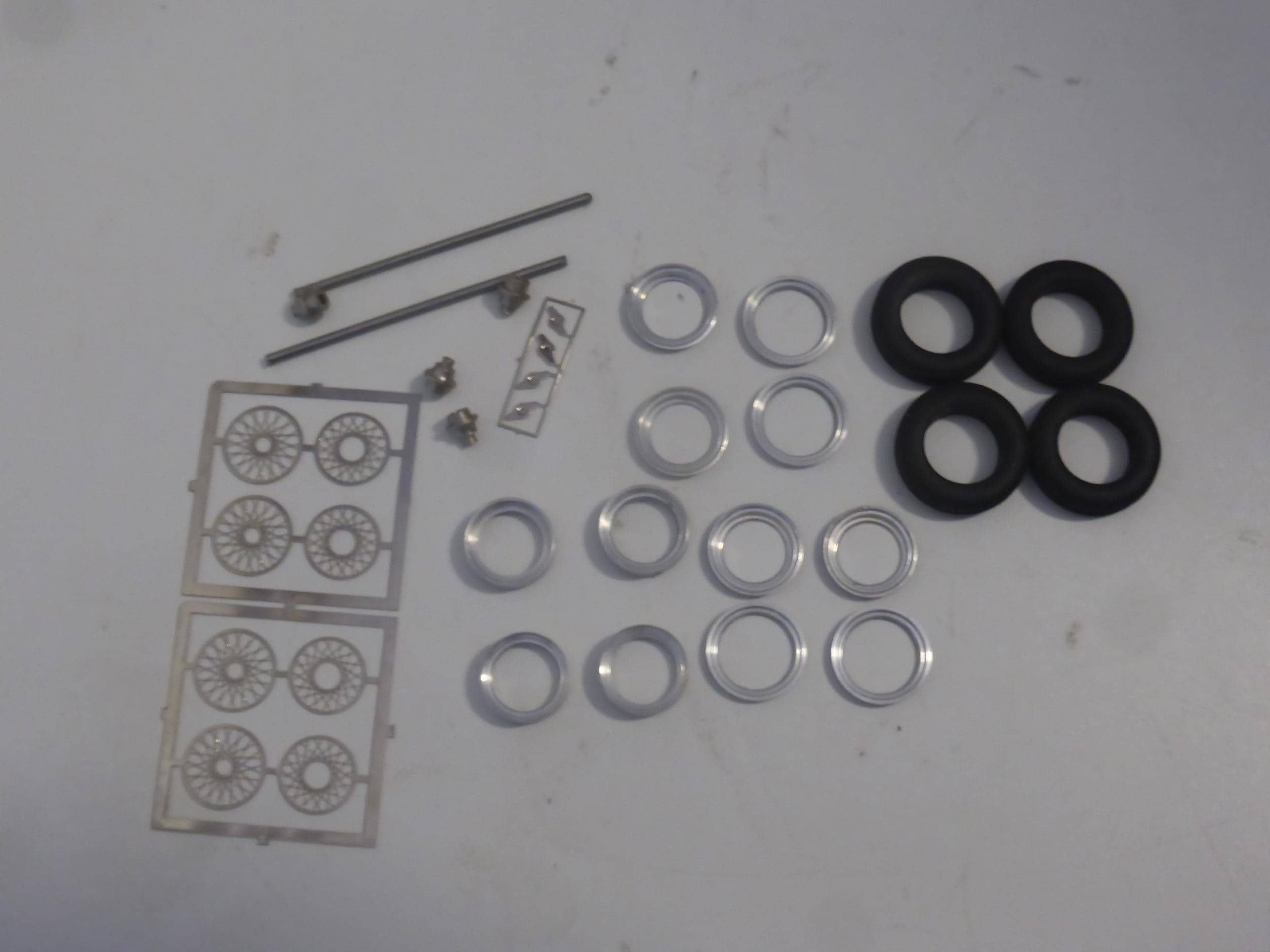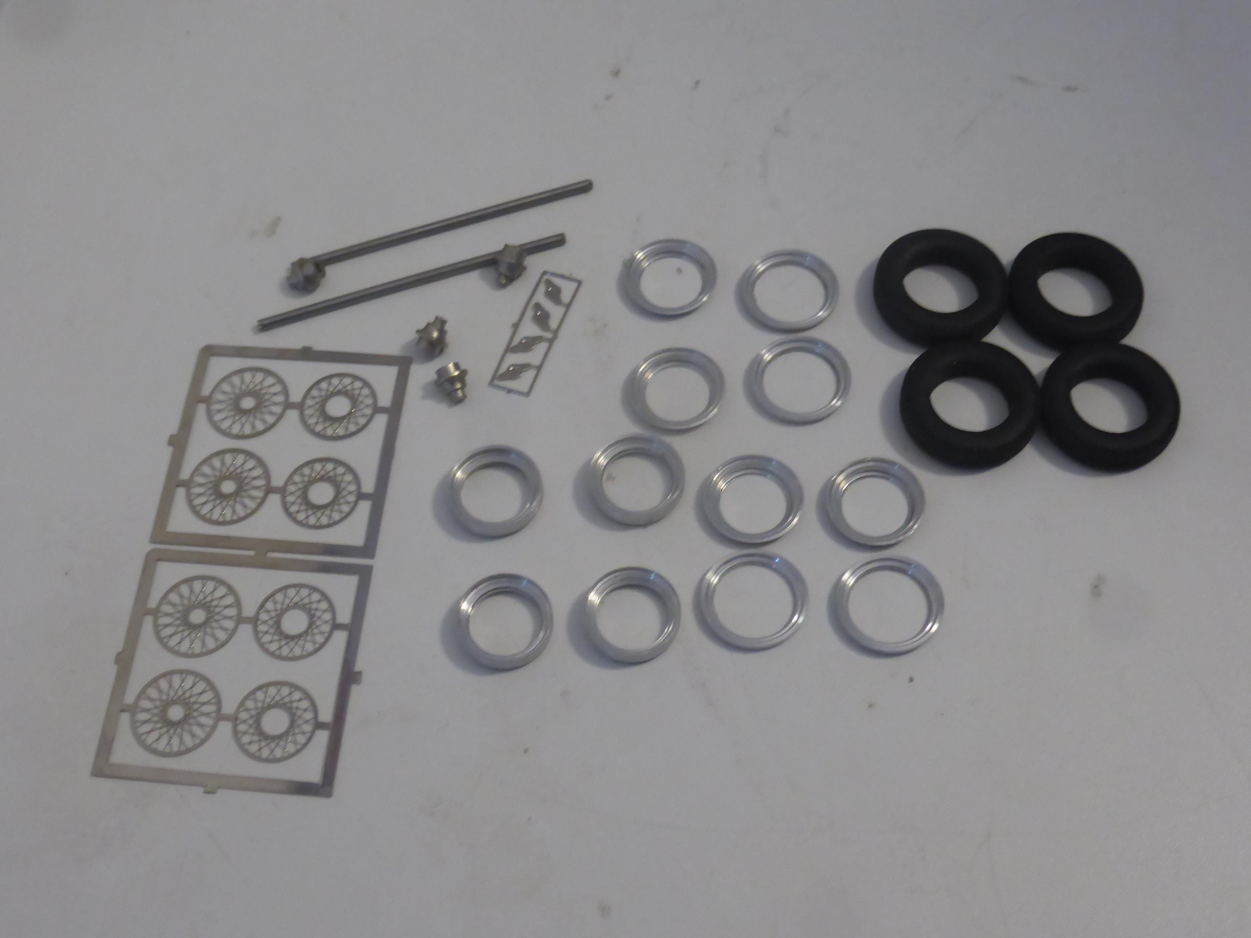Turned aluminium rims, rubber high tires, photo-etched wires, 2-ears photoetched wheelspins.