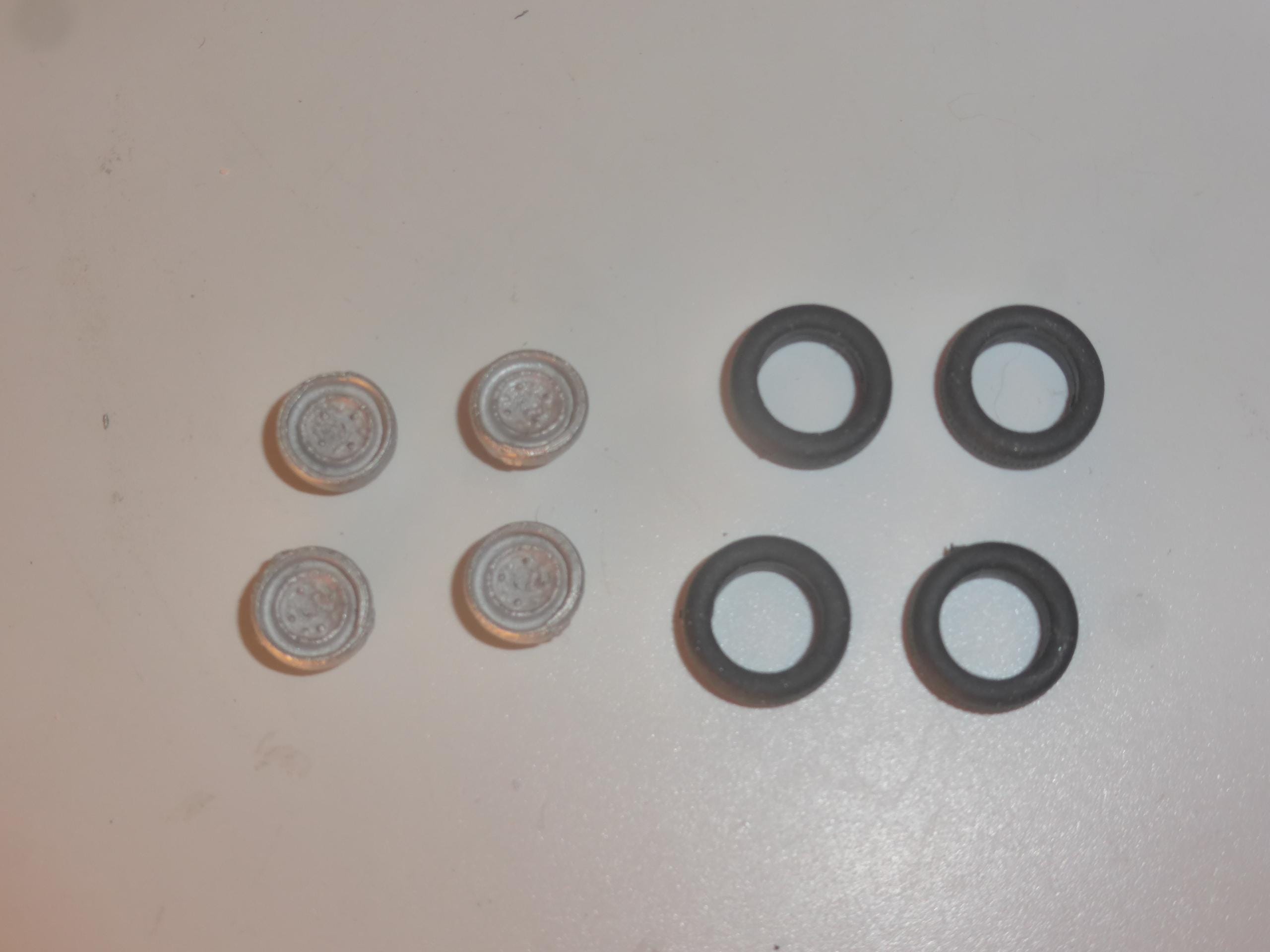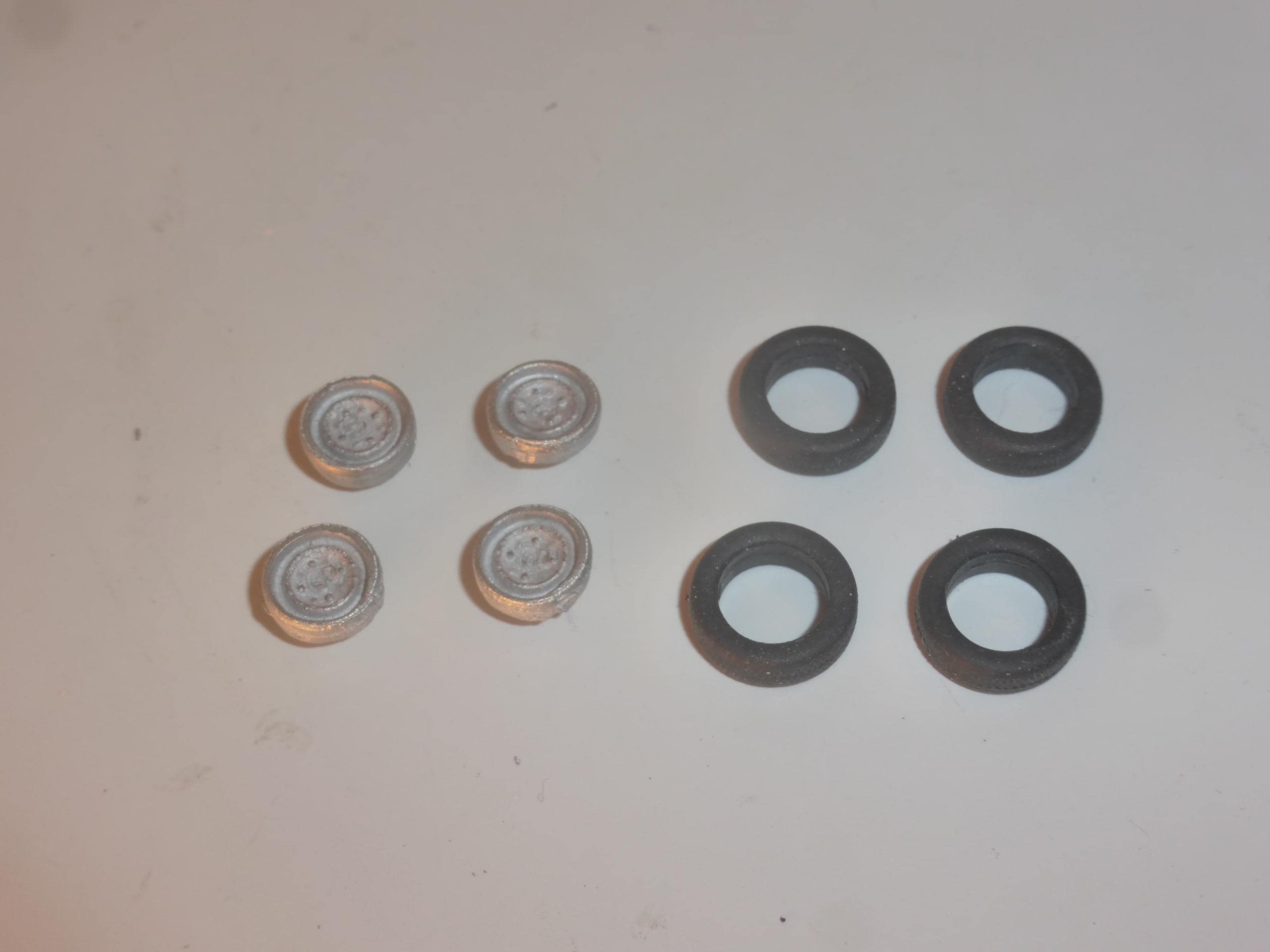 Set of white metal wheels with rubber tires.