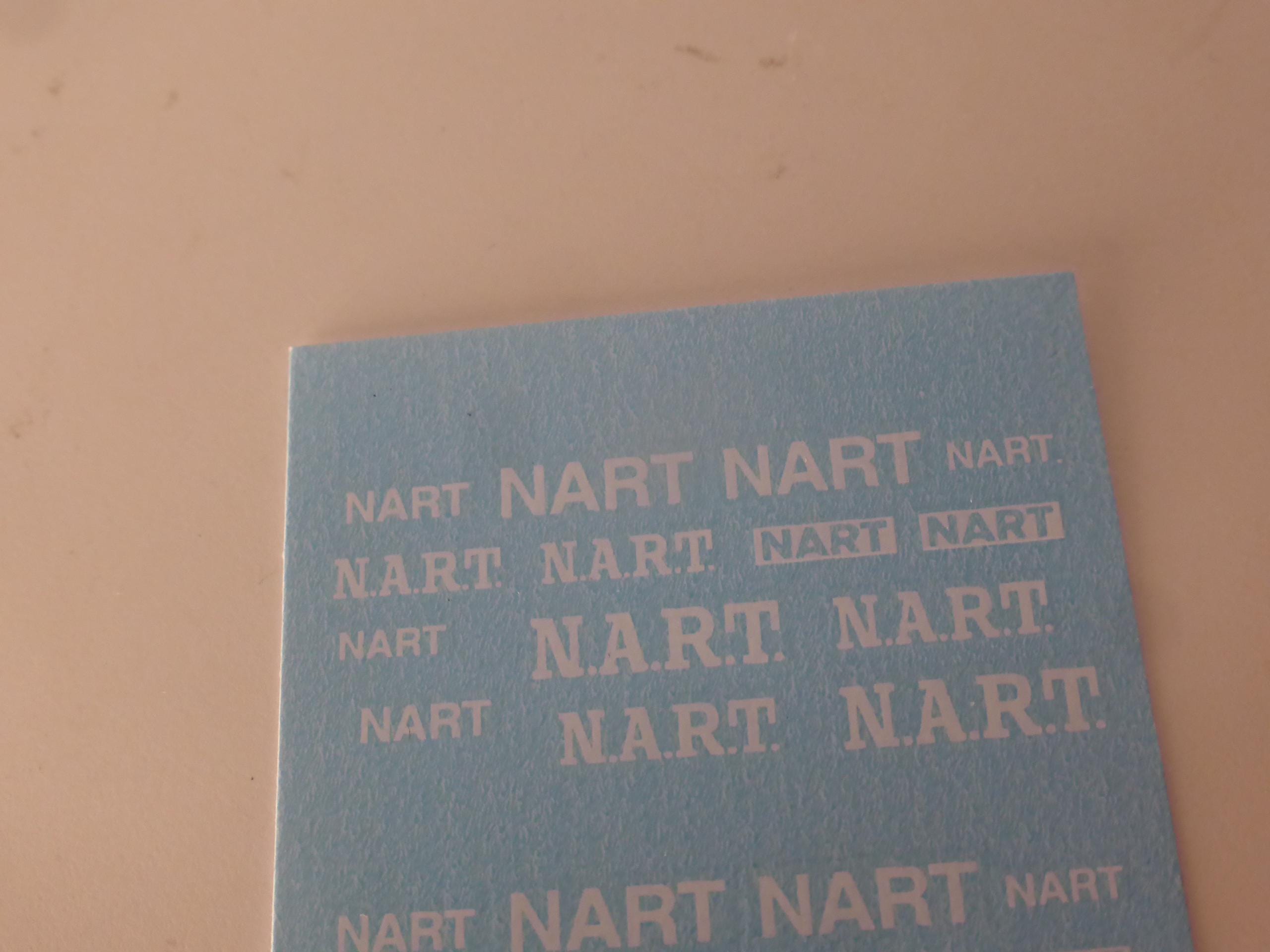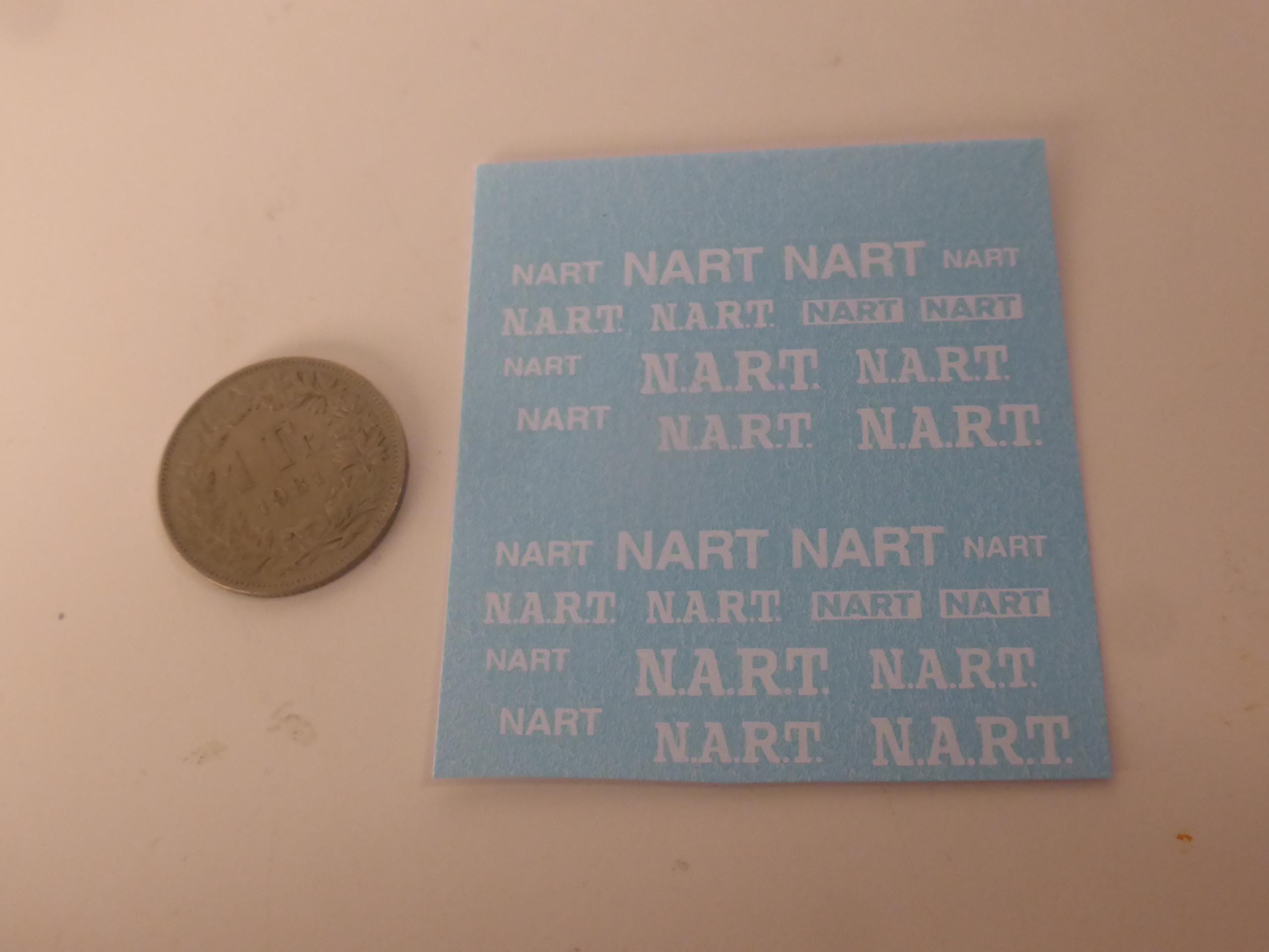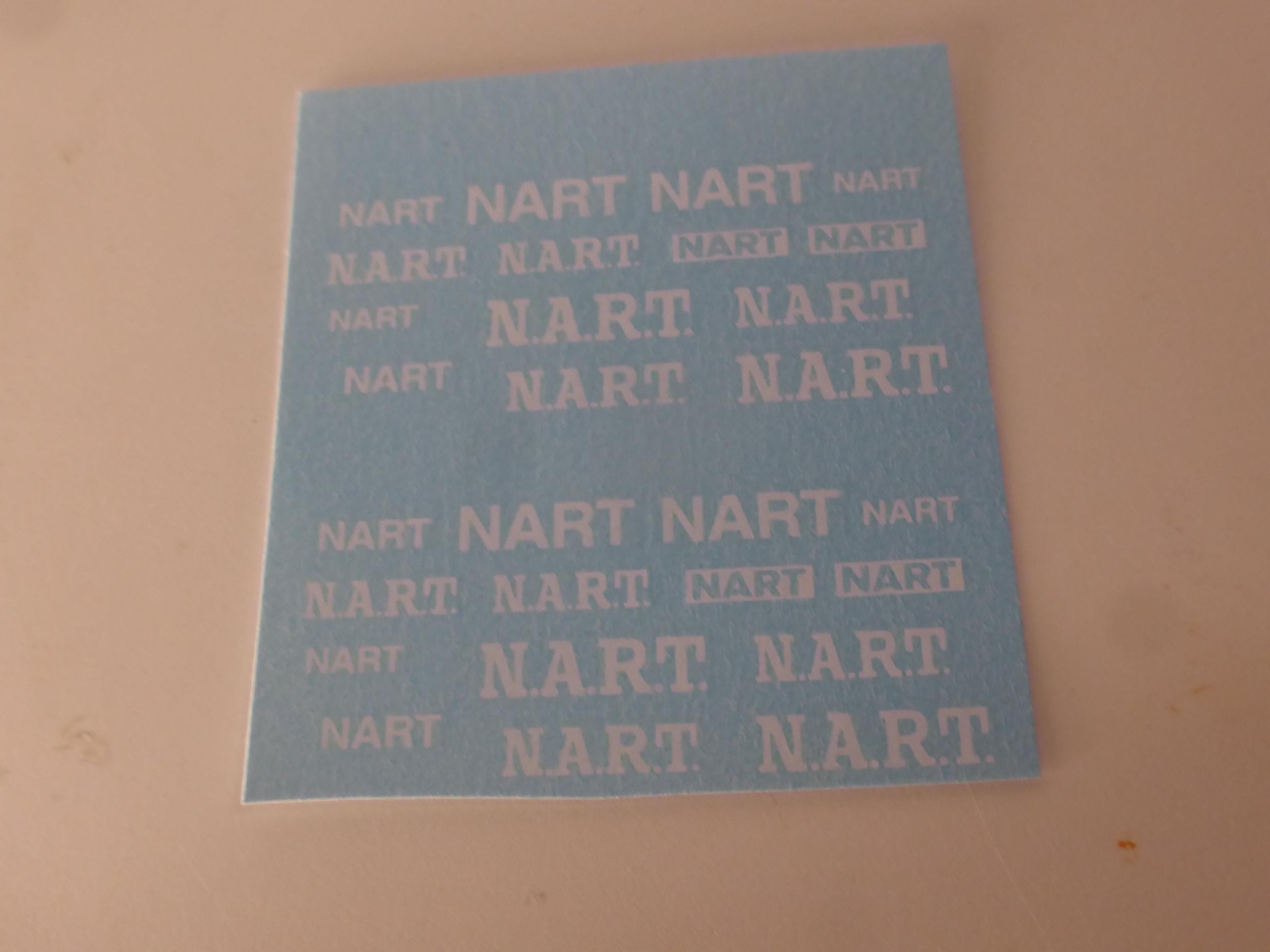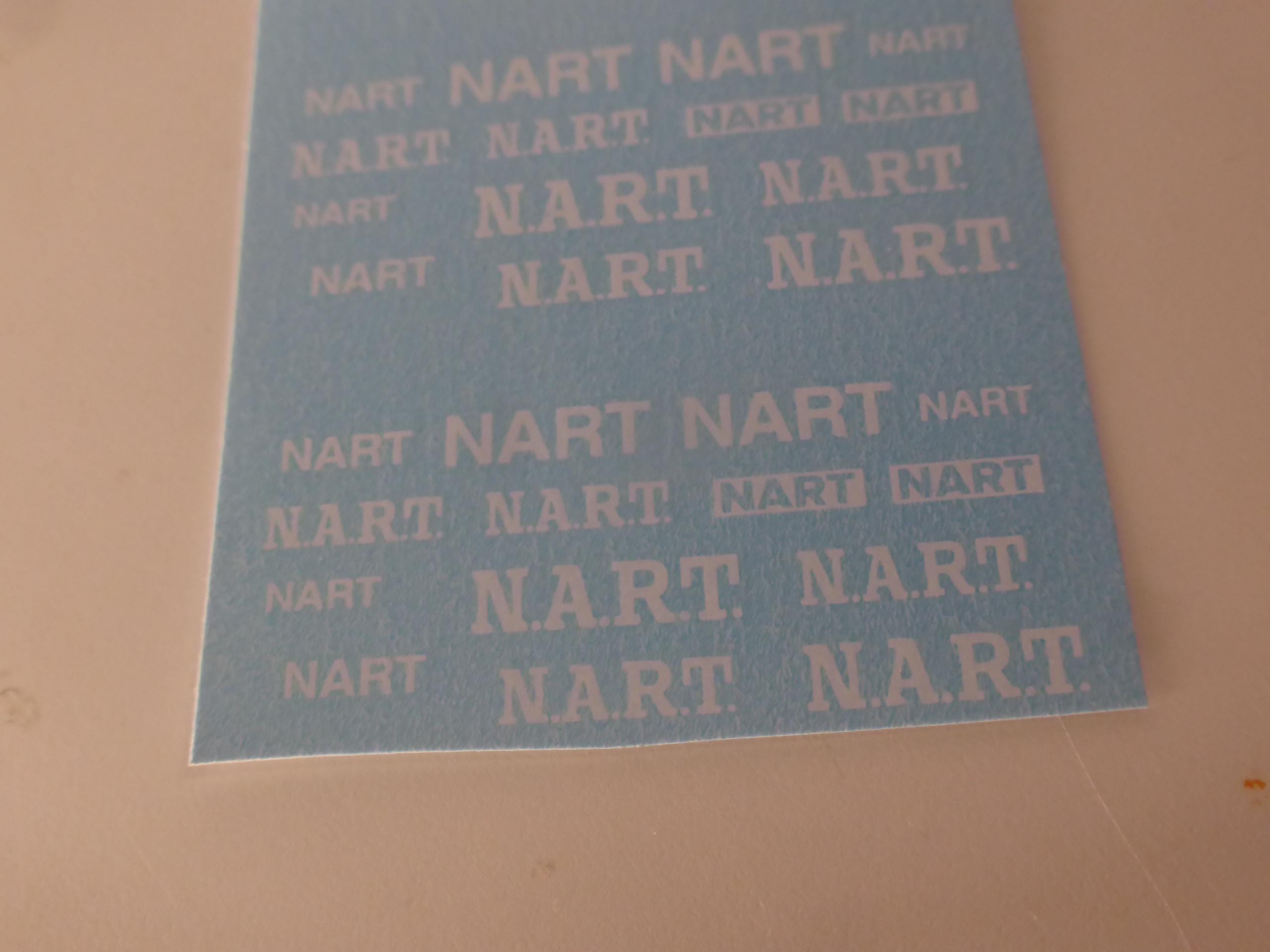 Waterslide serigraphed decals sheet with white NART (North American Racing Team) for 1:43 and 1:24 scale modelcars. Various fonts and sizes.