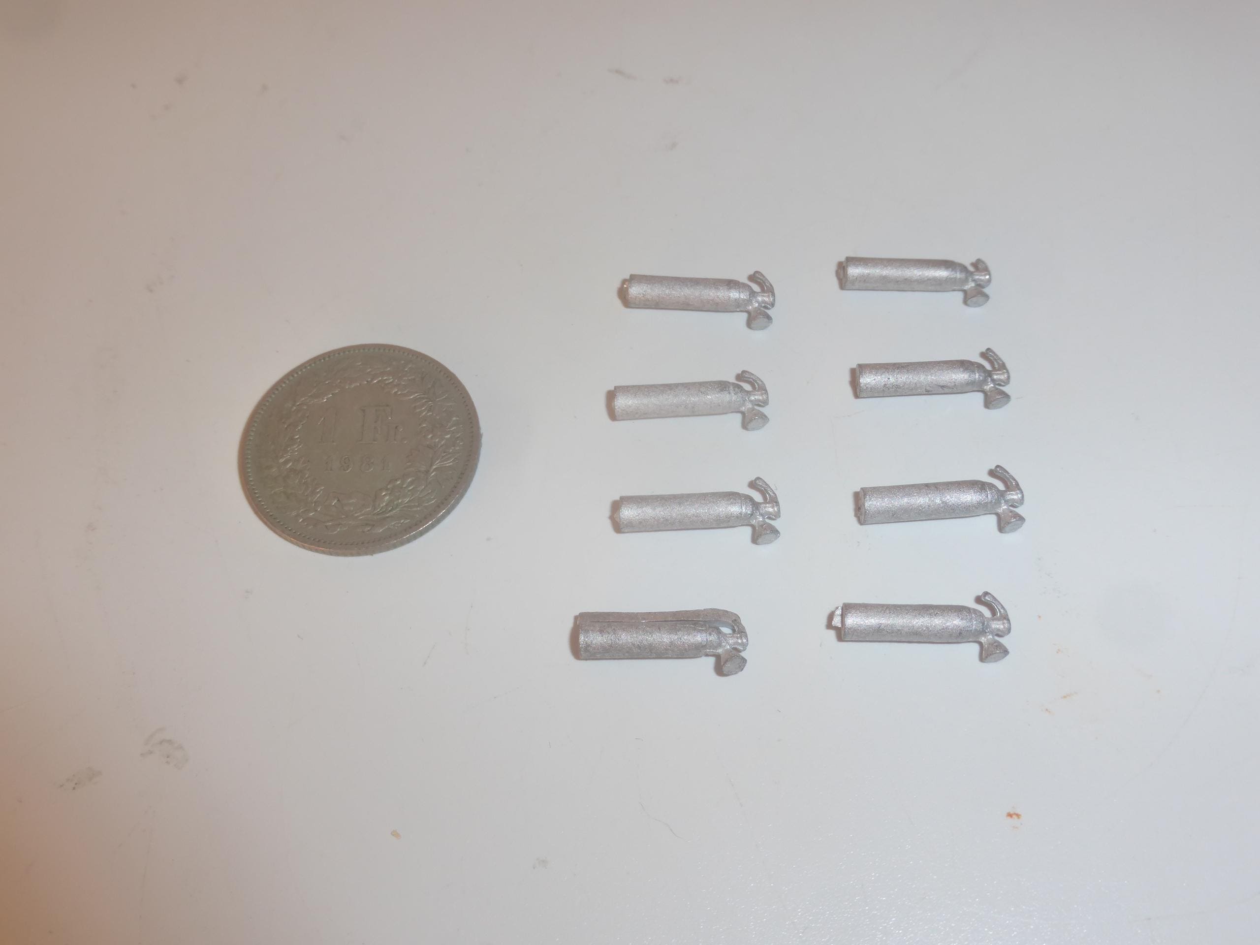 1:43 white metal fire extinguishers (8 pieces) for fire trucks, vans, etc. To paint.