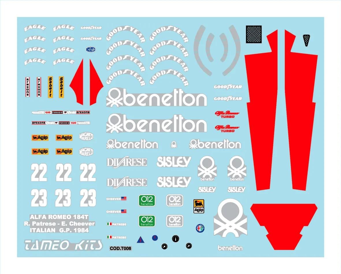 1:43 waterslide serigraphed decals Alfa Romeo 184T F1 Italian GP 1984 Patrese/Cheever Tameo TMK012