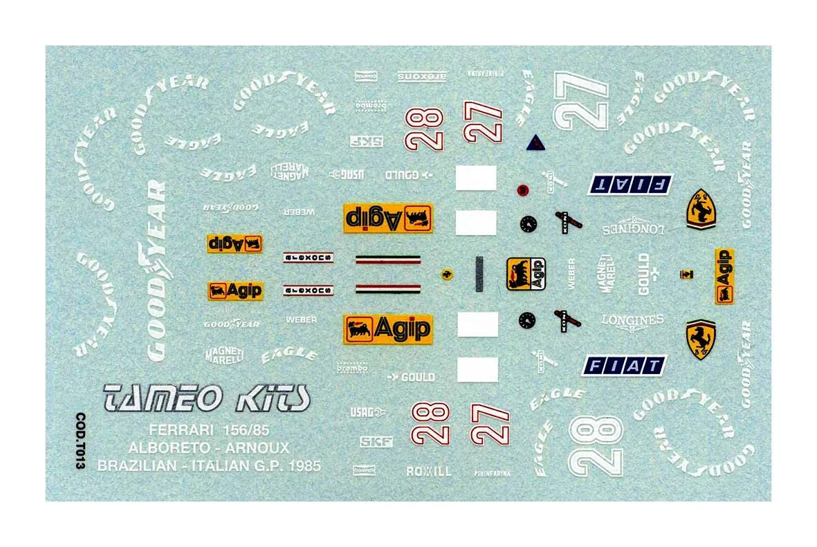 1:43 waterslide serigraphed decals Ferrari 156/85 F1 Brazilian GP 1985 Alboreto/Arnoux Tameo TMK019