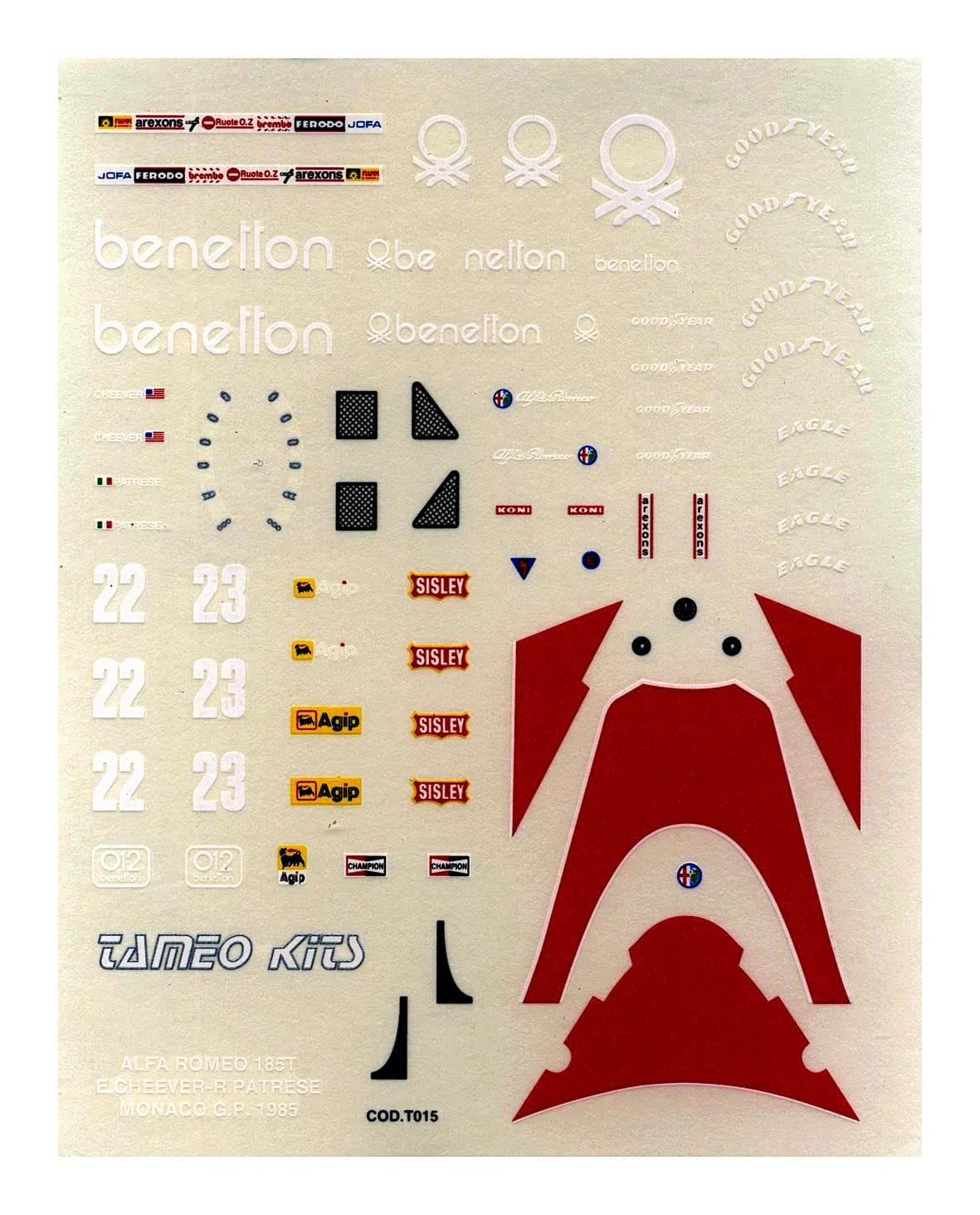 1:43 waterslide serigraphed decals Alfa Romeo 185T F1 Monaco GP 1985 Patrese/Cheever Tameo TMK021