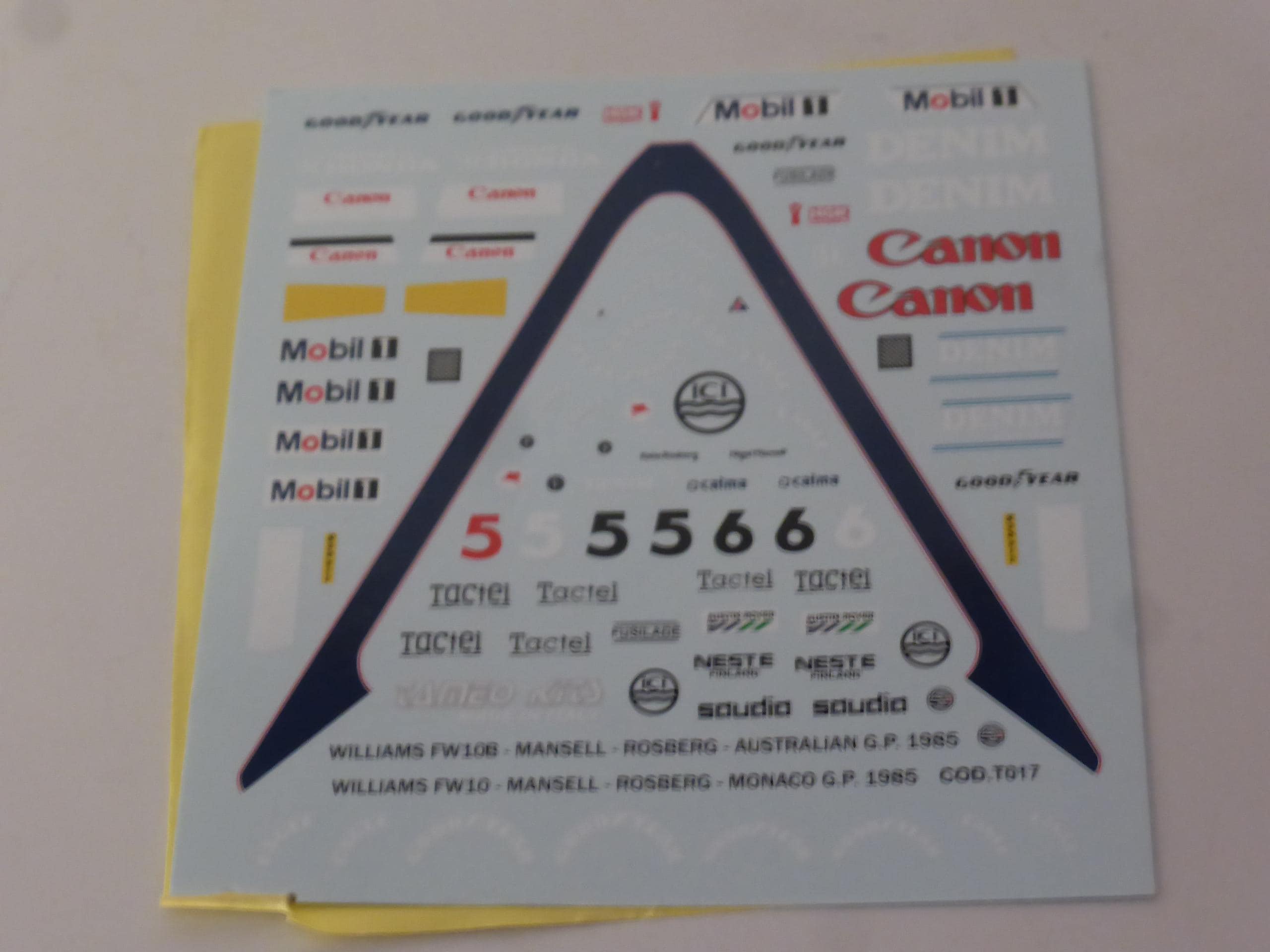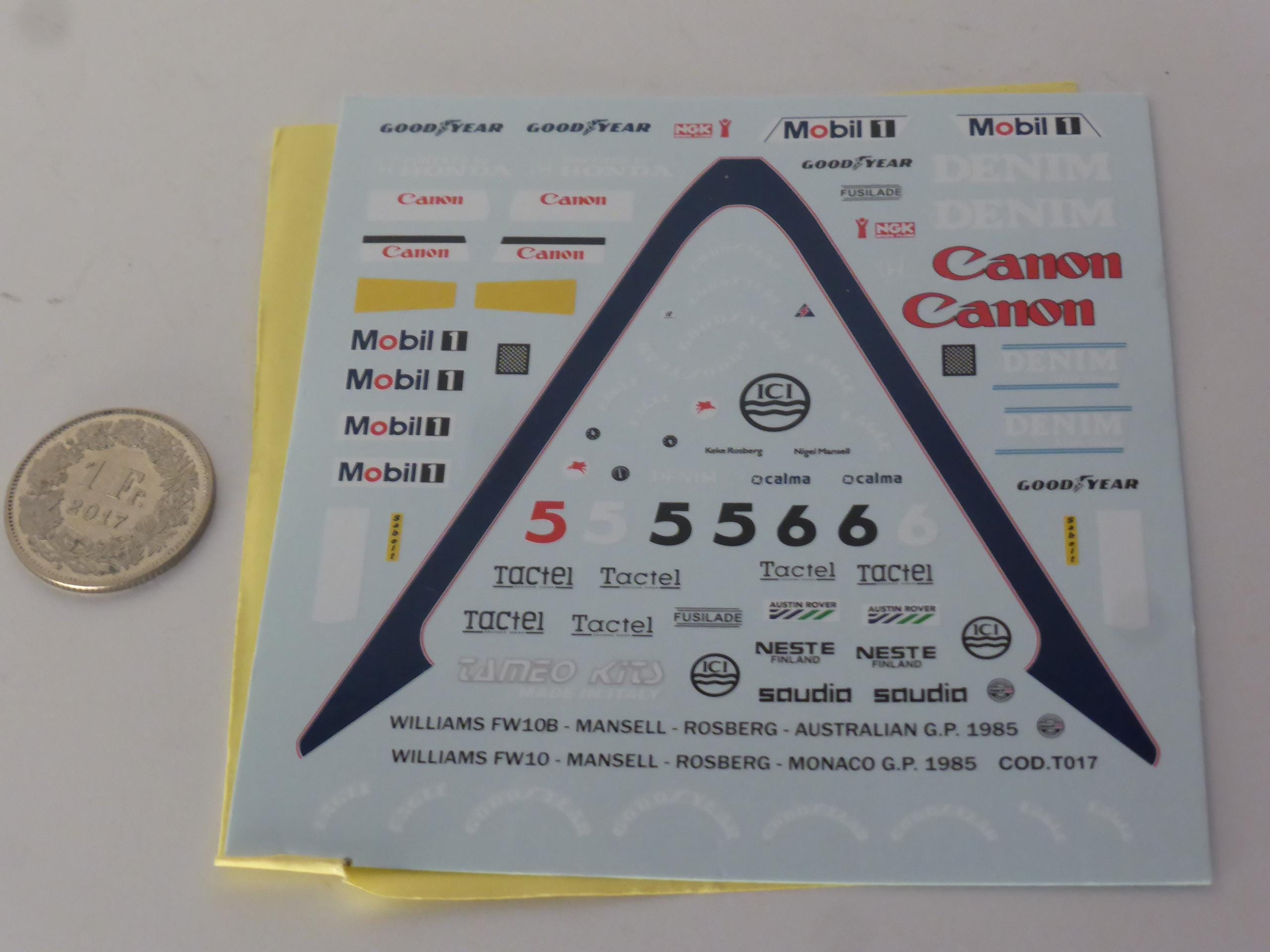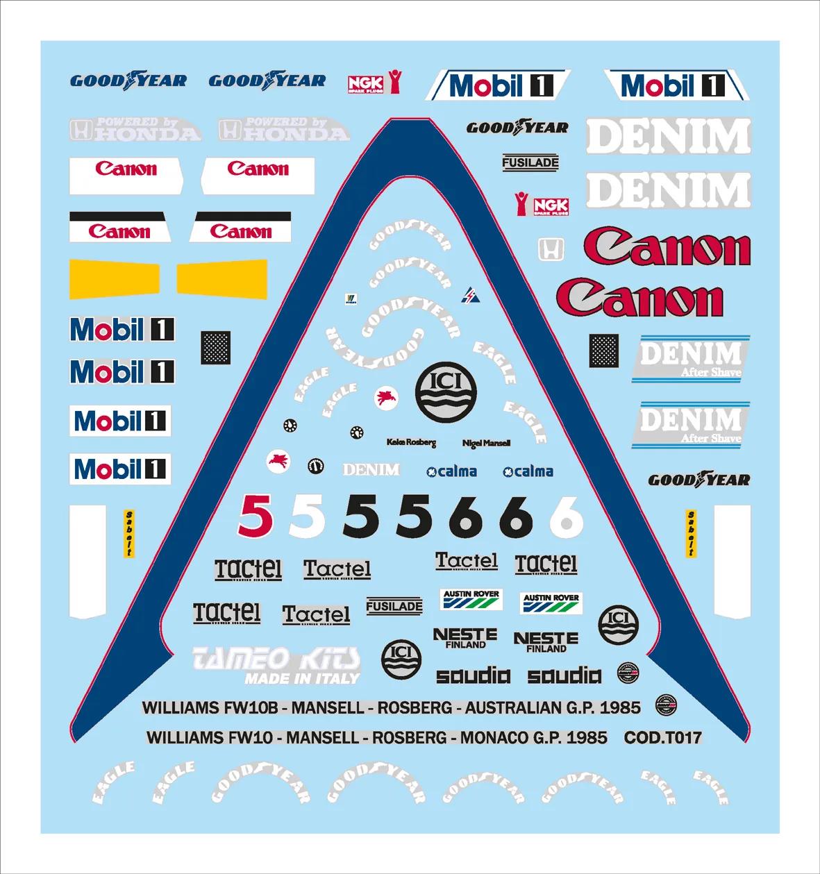 1:43 waterslide serigraphed decals Williams Honda FW10 F1 Monaco GP 1985 Mansell/Rosberg Tameo TMK023