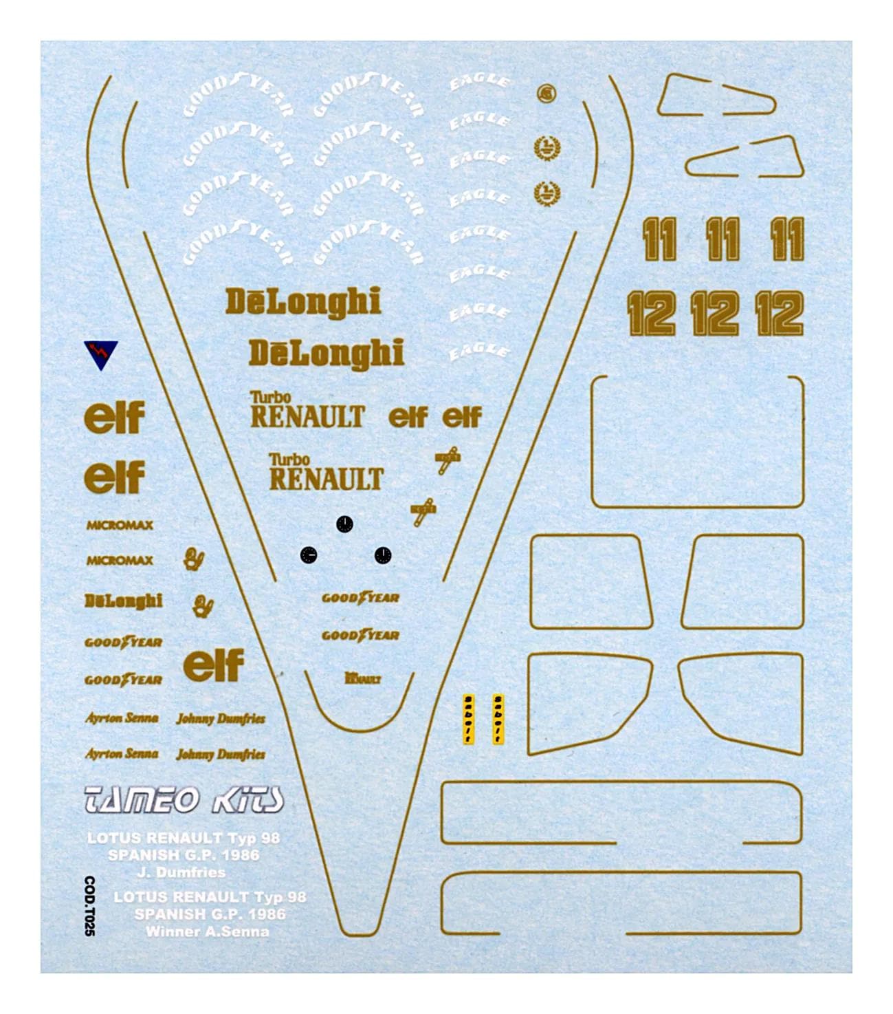 1:43 waterslide serigraphed decals Lotus Renault 98T F1 Spanish GP 1986 Senna/Dumfries Tameo TMK040