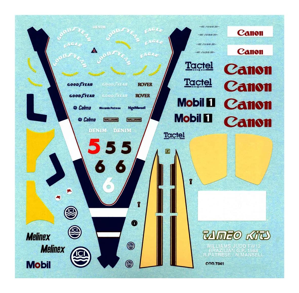 1:43 waterslide serigraphed decals Williams Judd FW12 Brazilian GP 1988 Patrese/Mansell Tameo TMK071