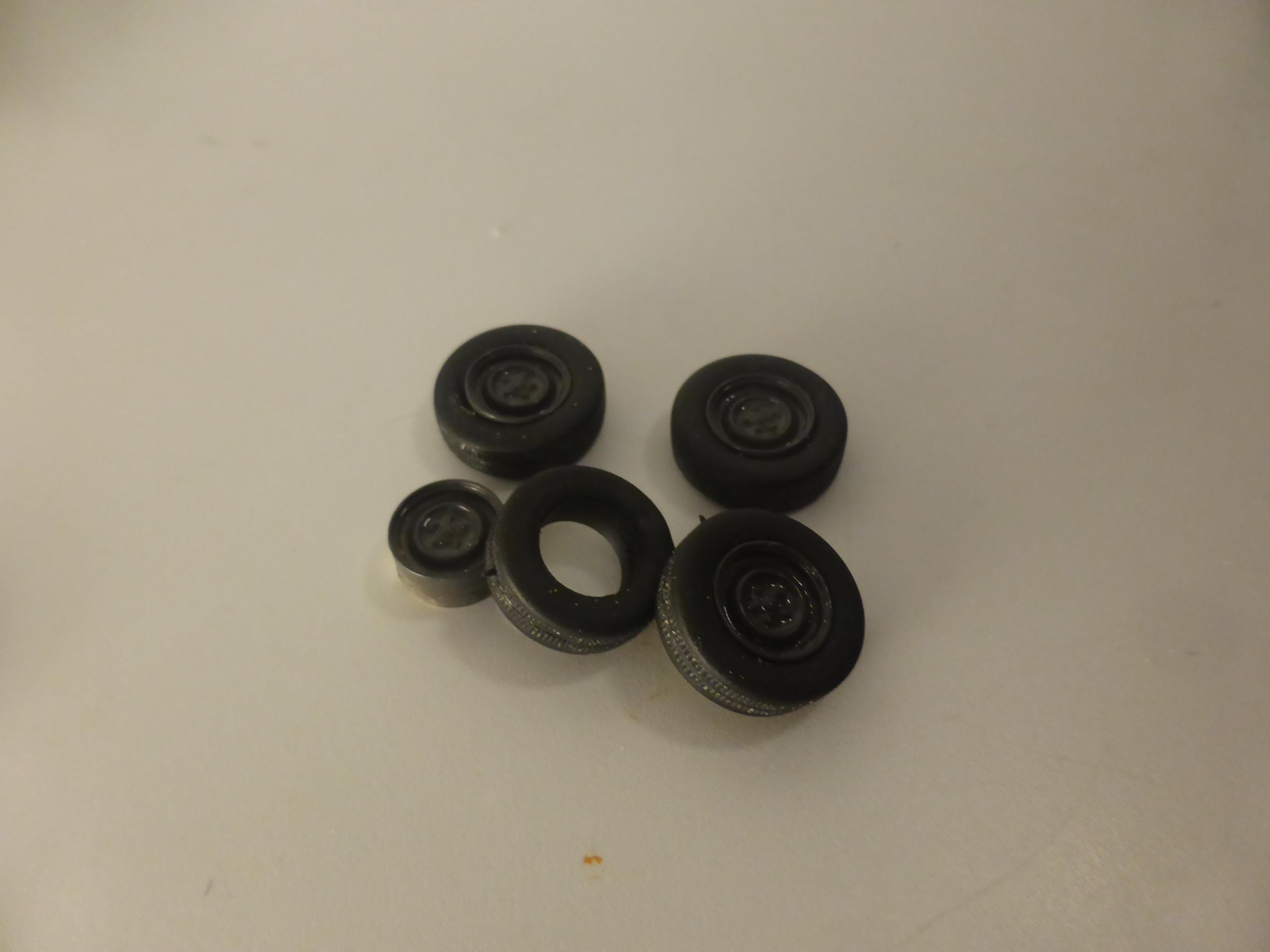 Resin wheels (professionally airbrush-painted) with treaded rubber tires.