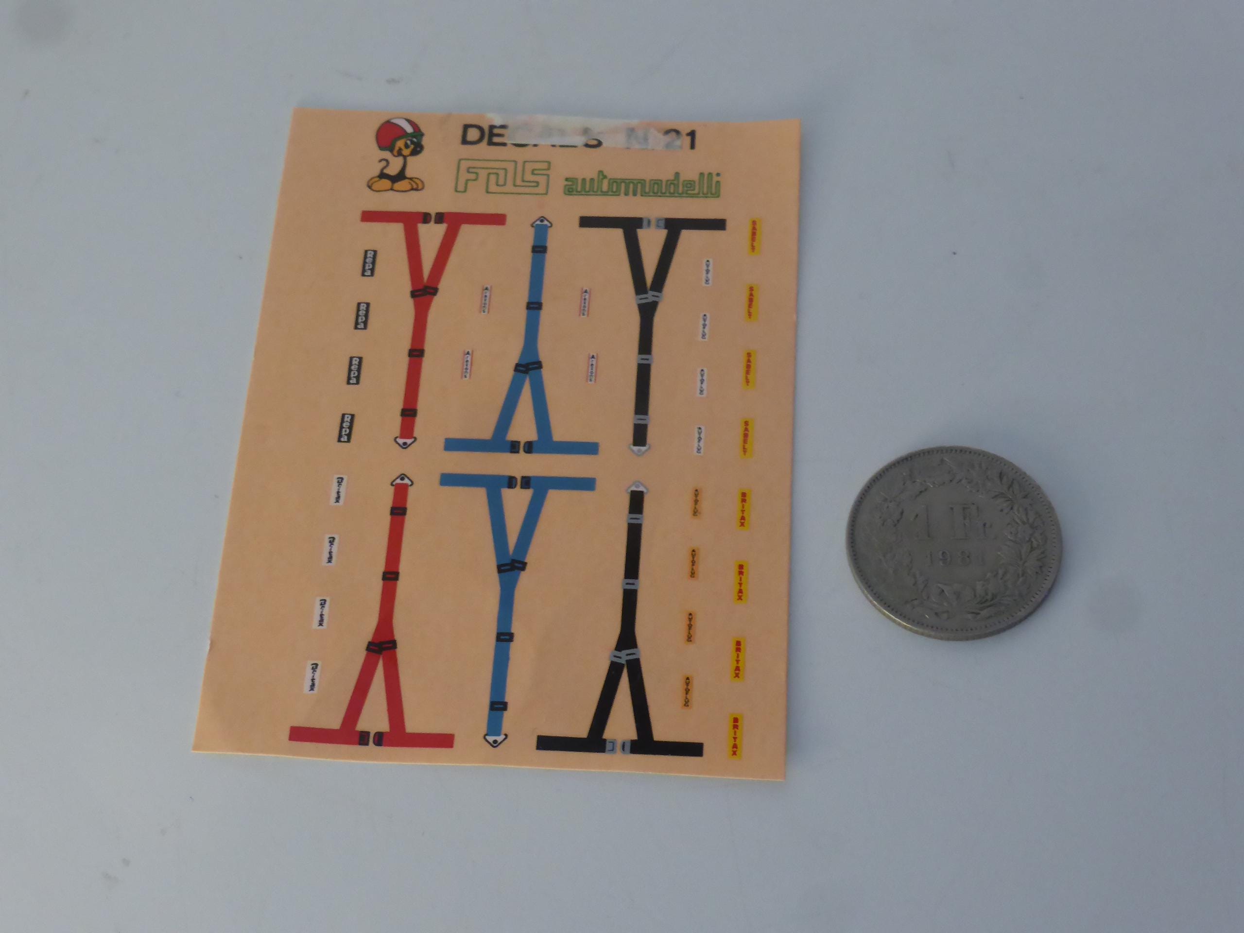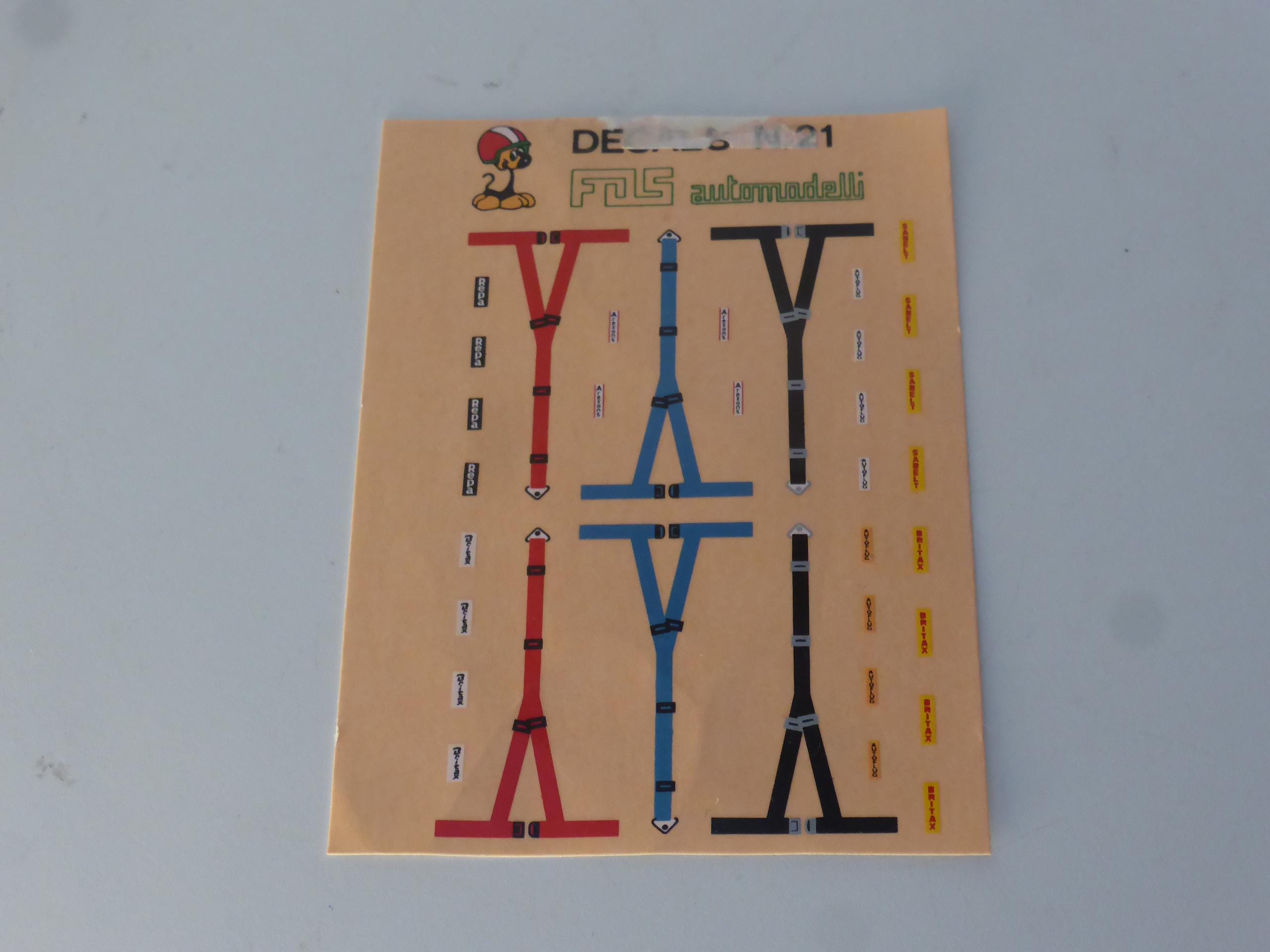 Serigraphed waterslide decals (see photos). Red, blue and black racing seatbelts for modelcars. Fit 1:43 scale.