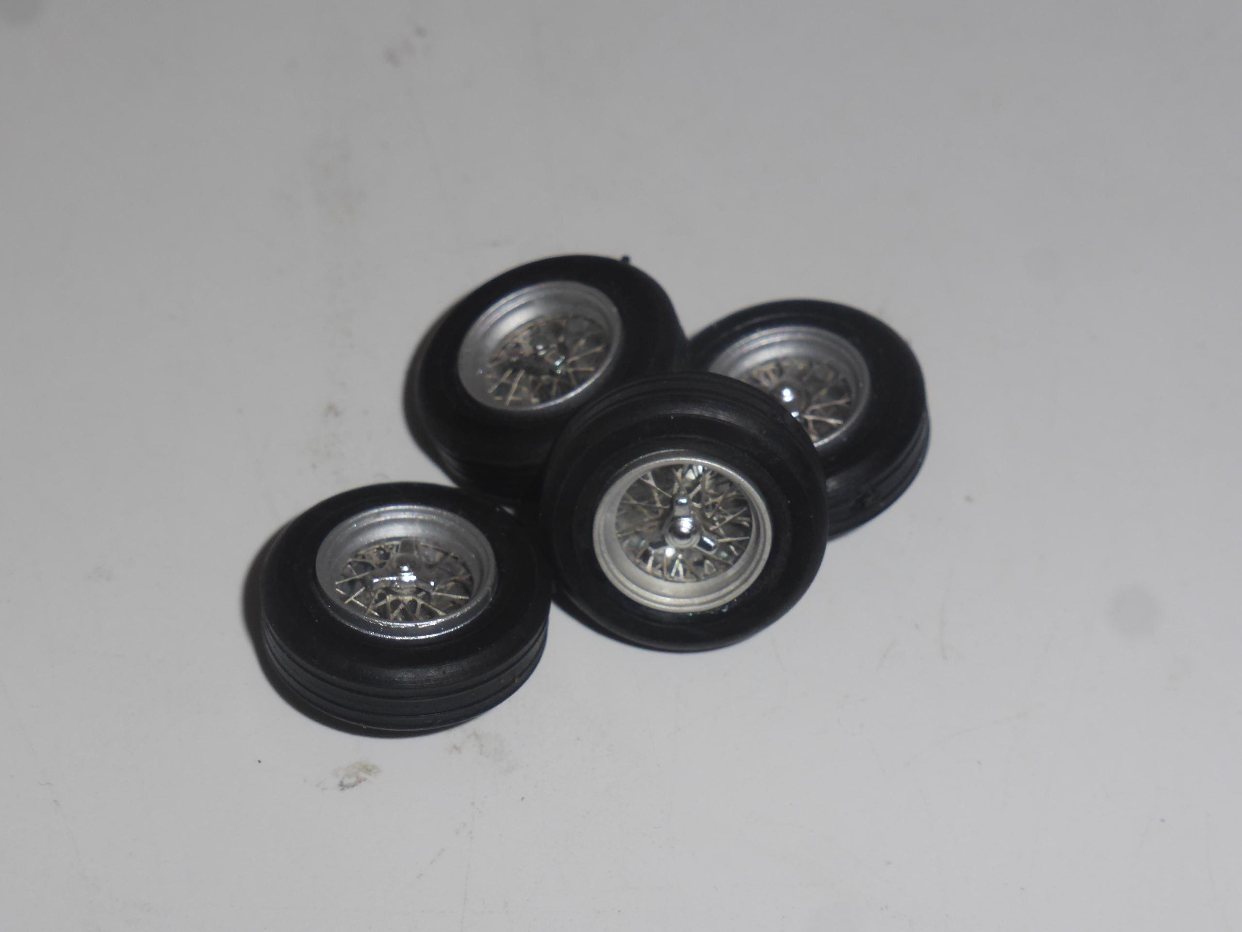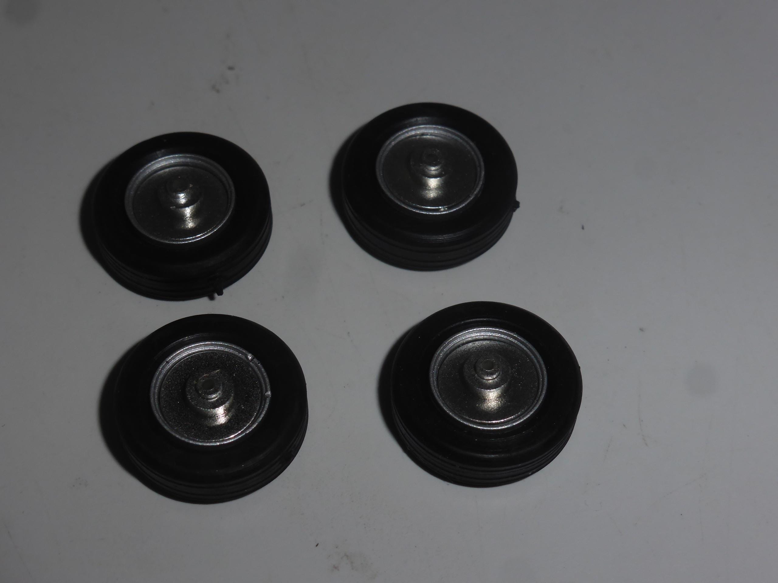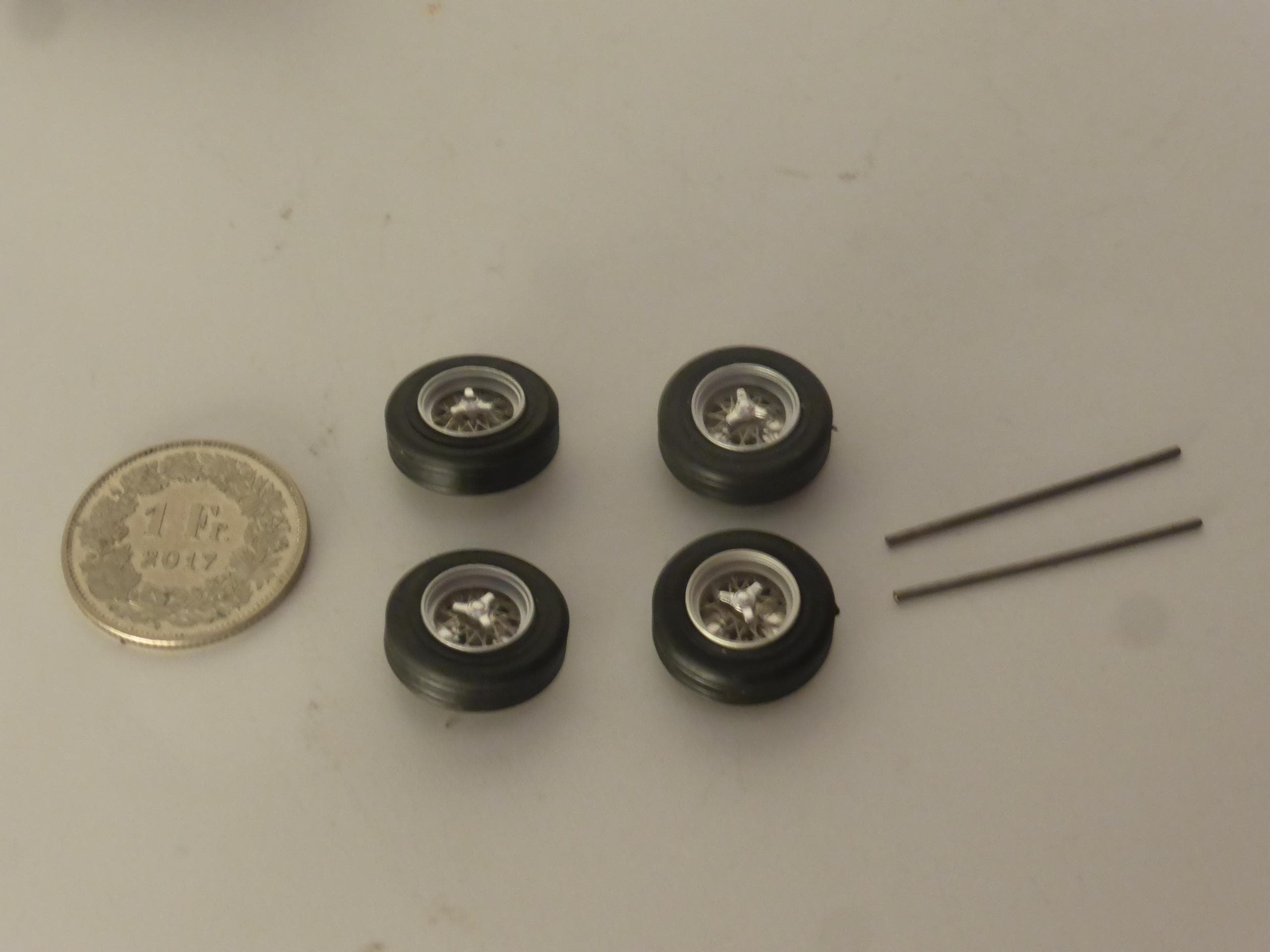 1:43 scale plastic rims with photoetched wires and chromed wheelspin. Brake drum mounted-in. Included the two axes. Treaded rubber tires.
