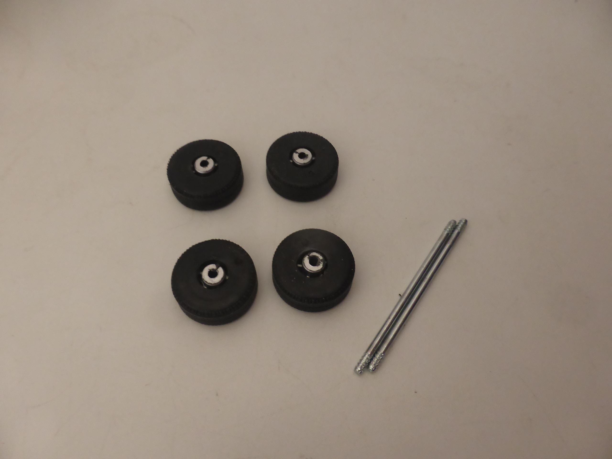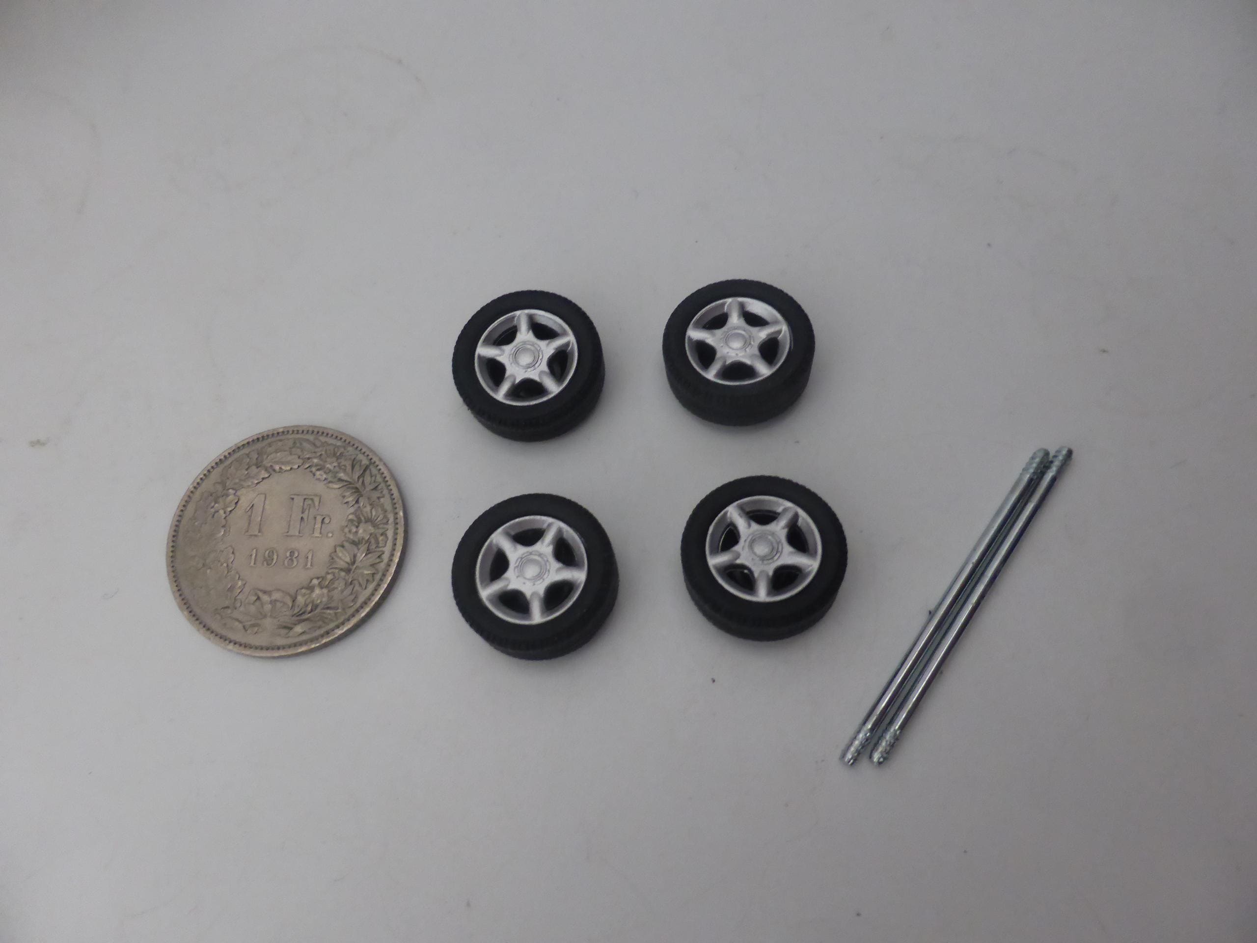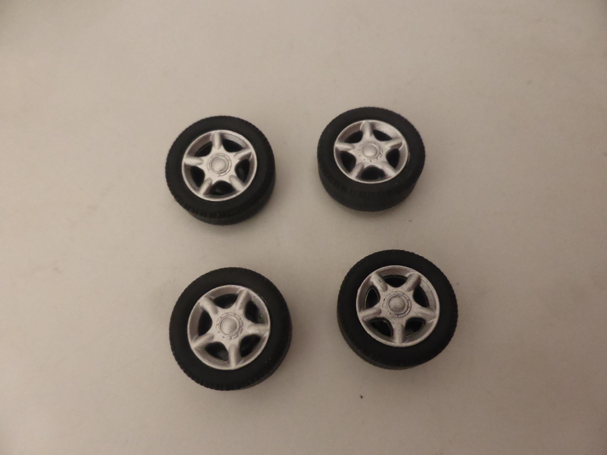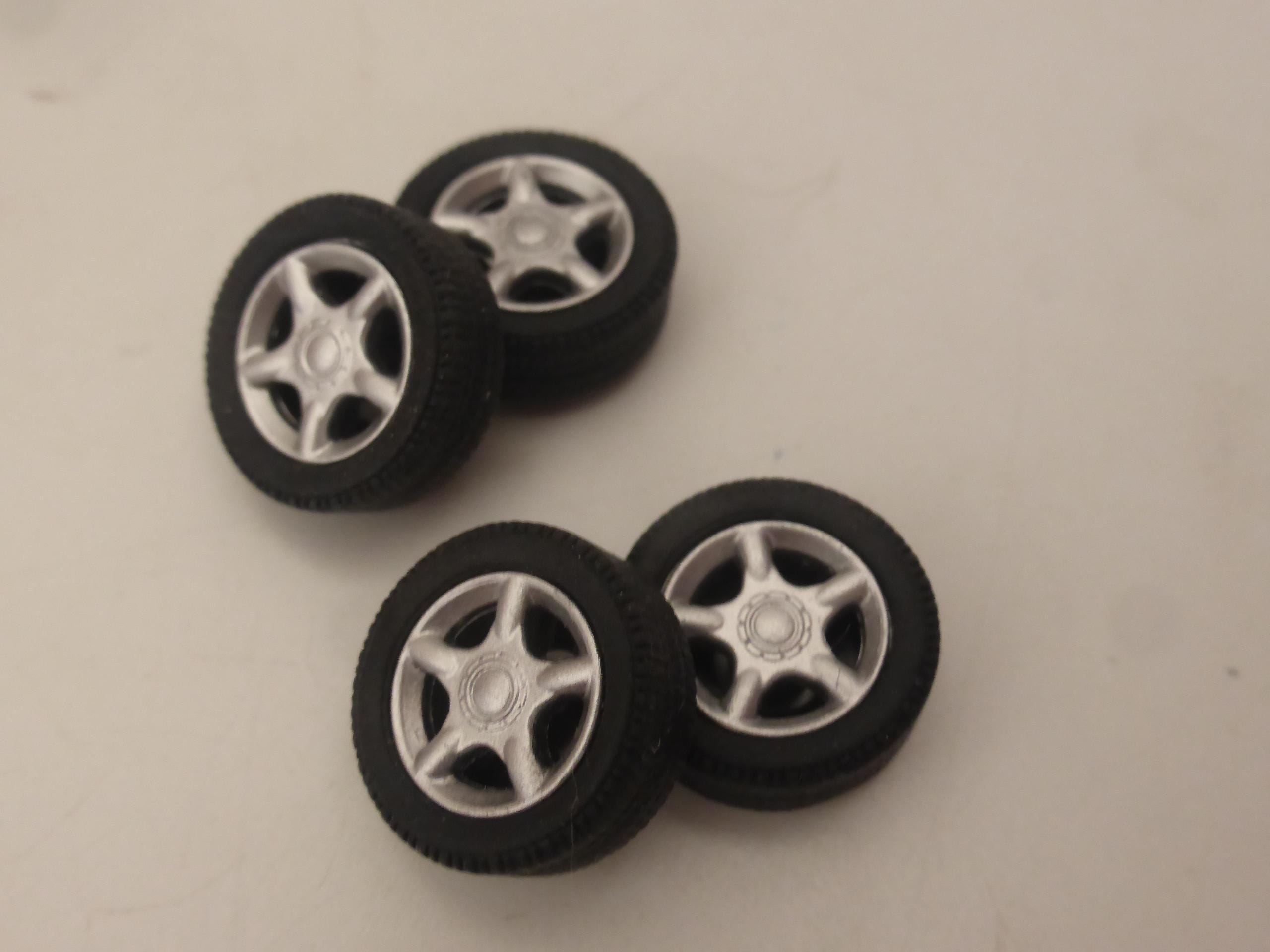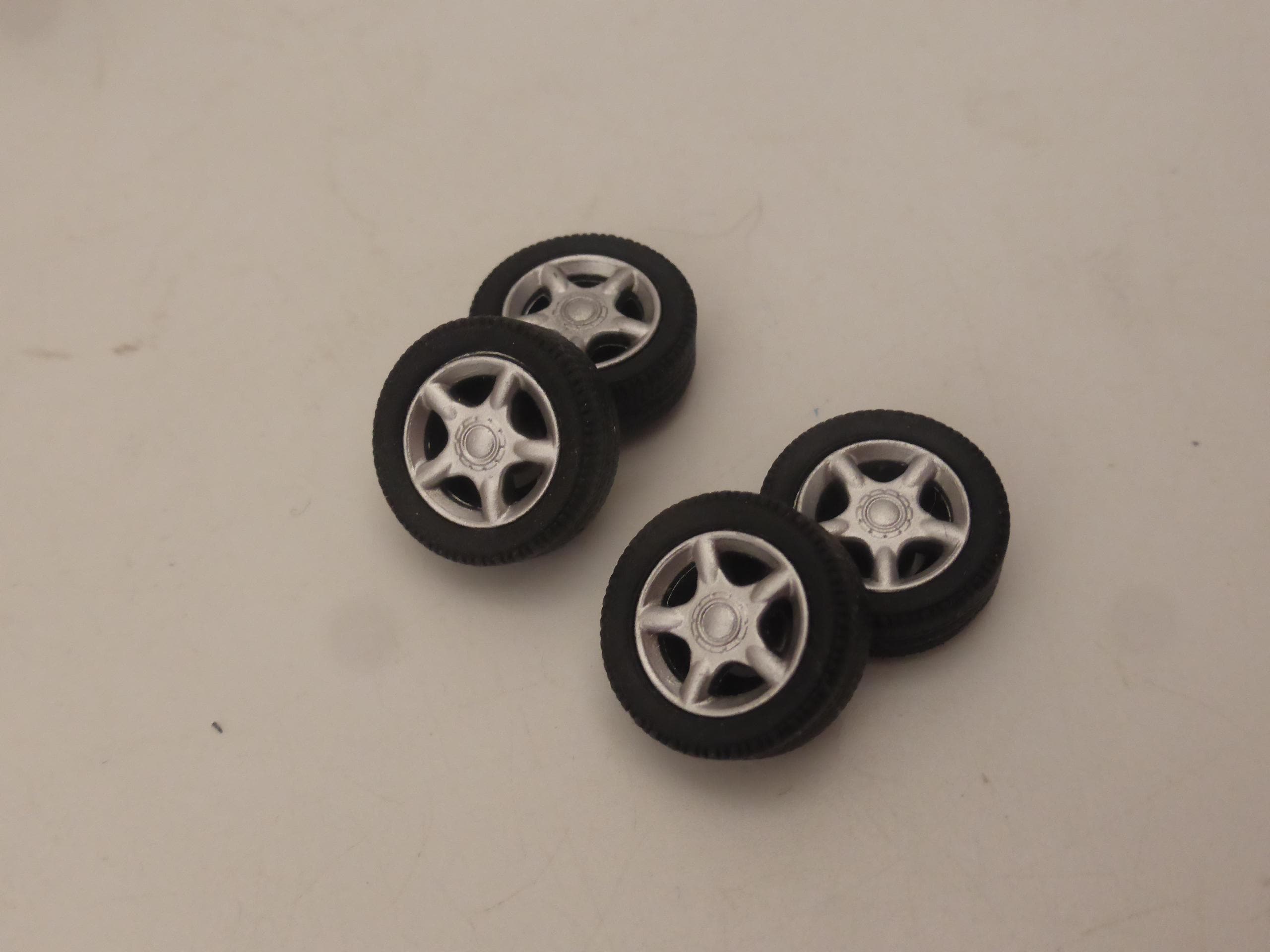1:43 scale plastic rims with rubber treaded tires.