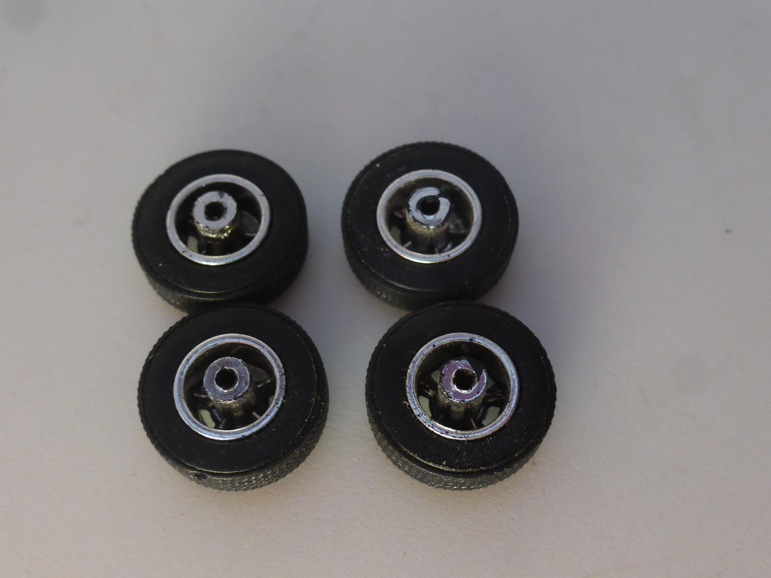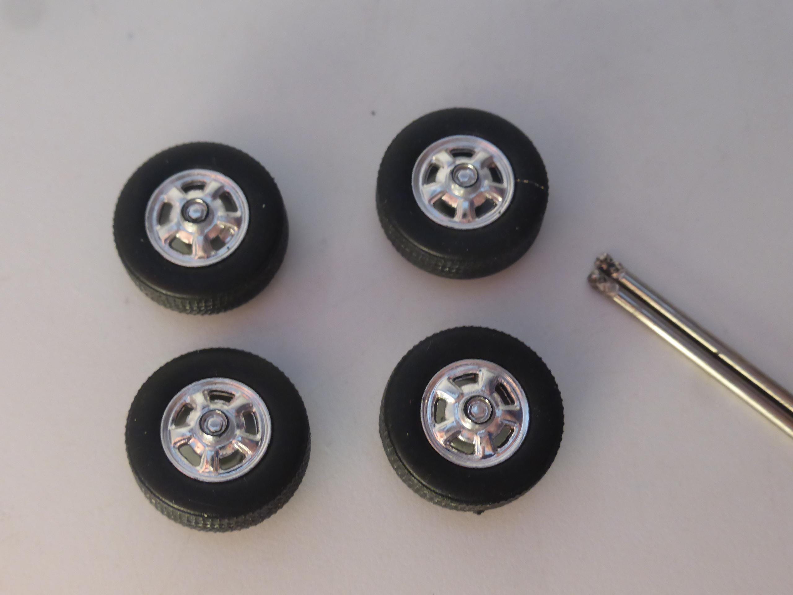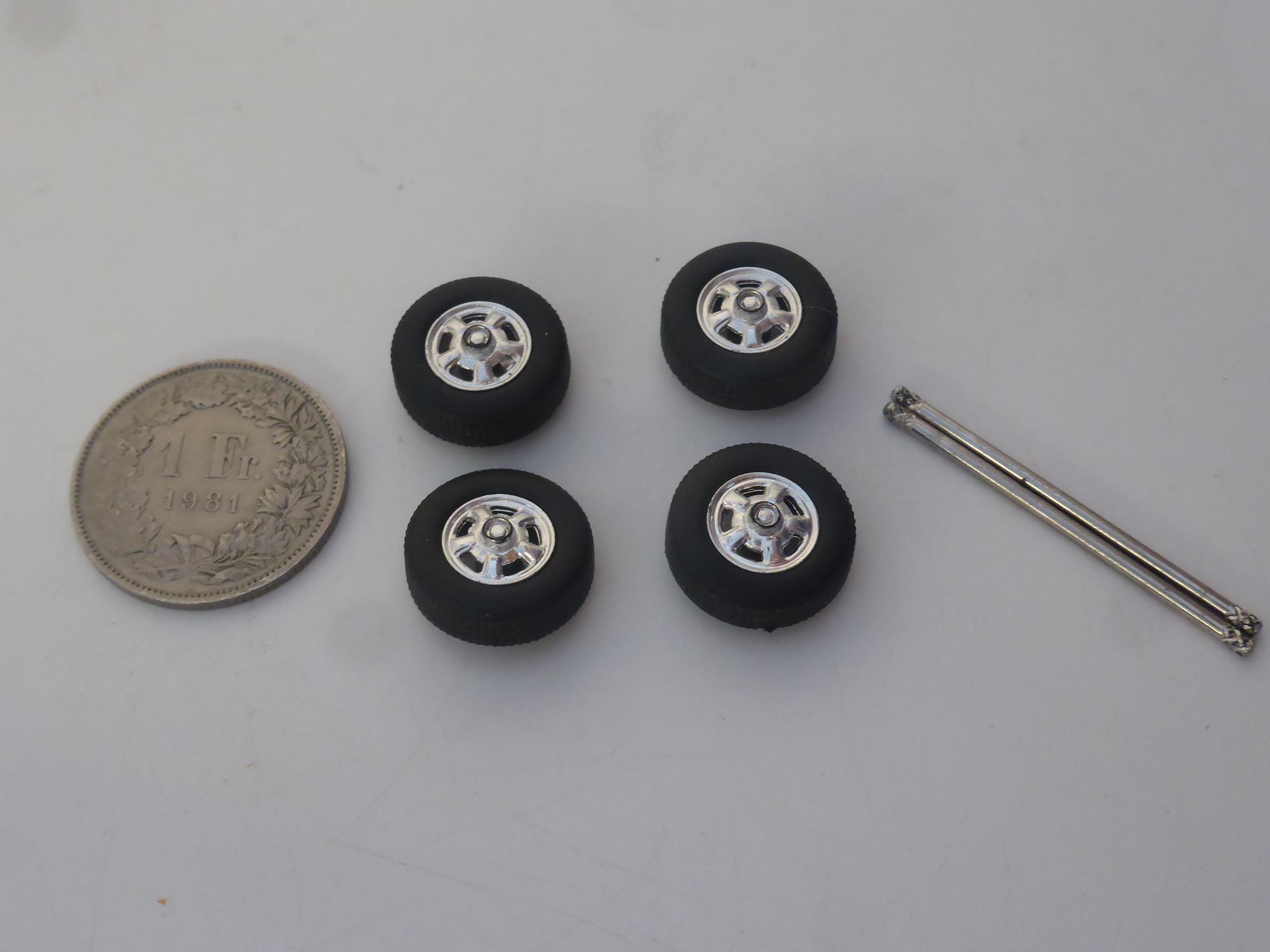 1:43 scale chromed plastic rims with rubber treaded tires. Two metal axles included.