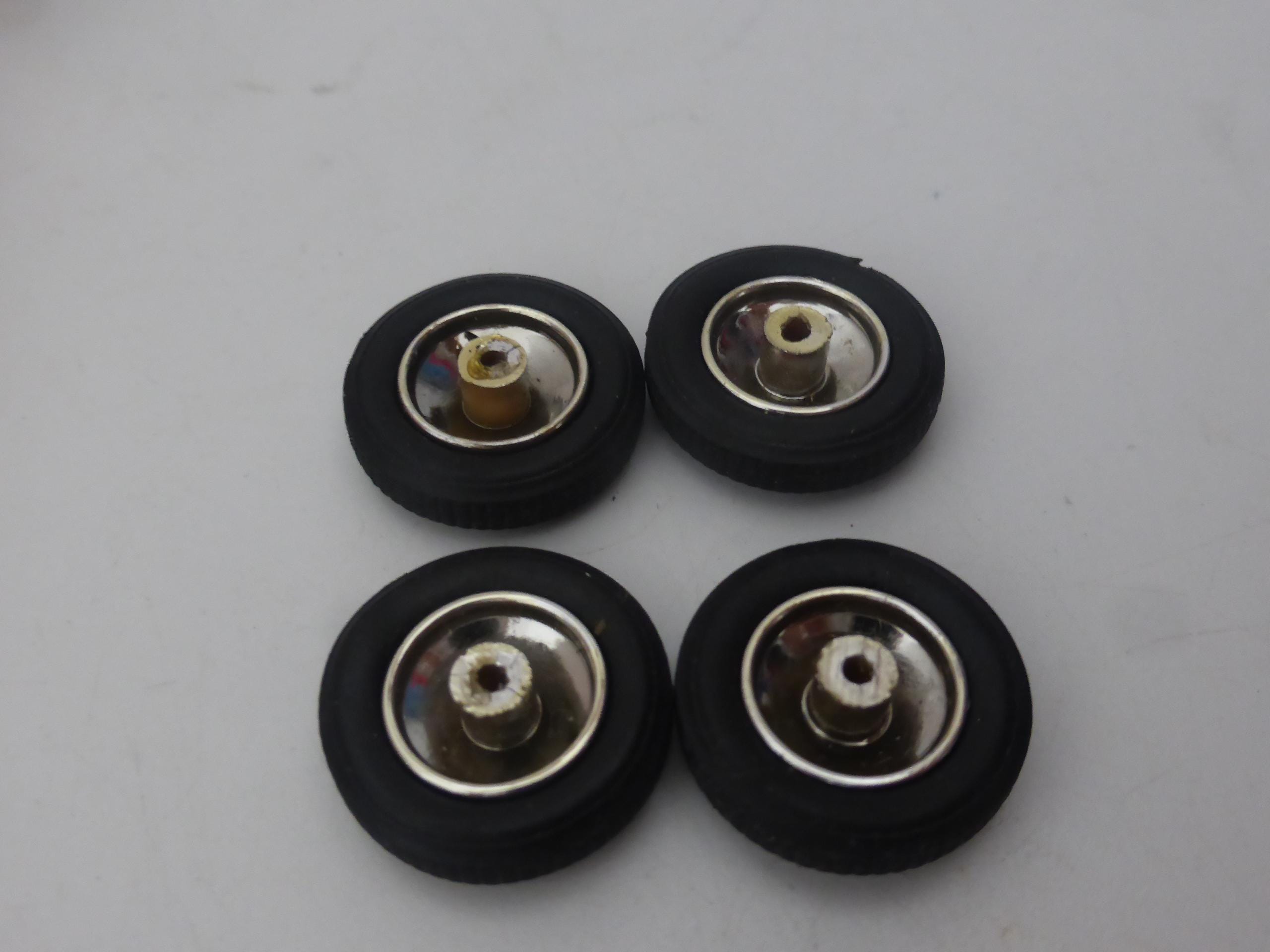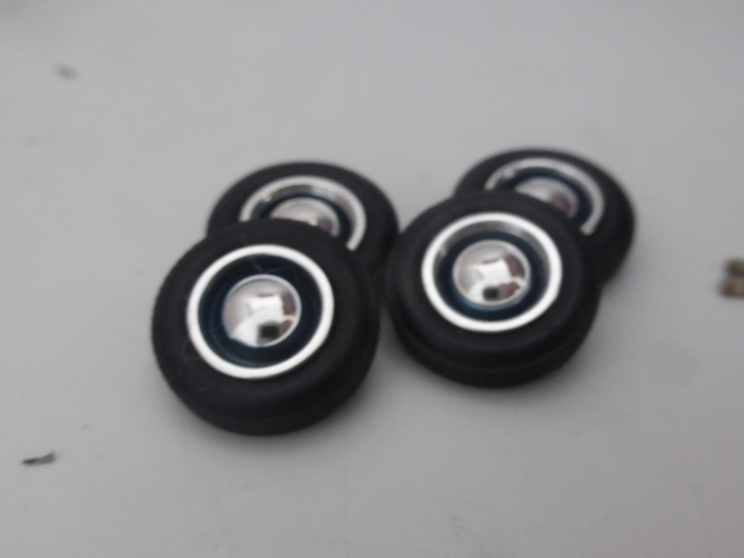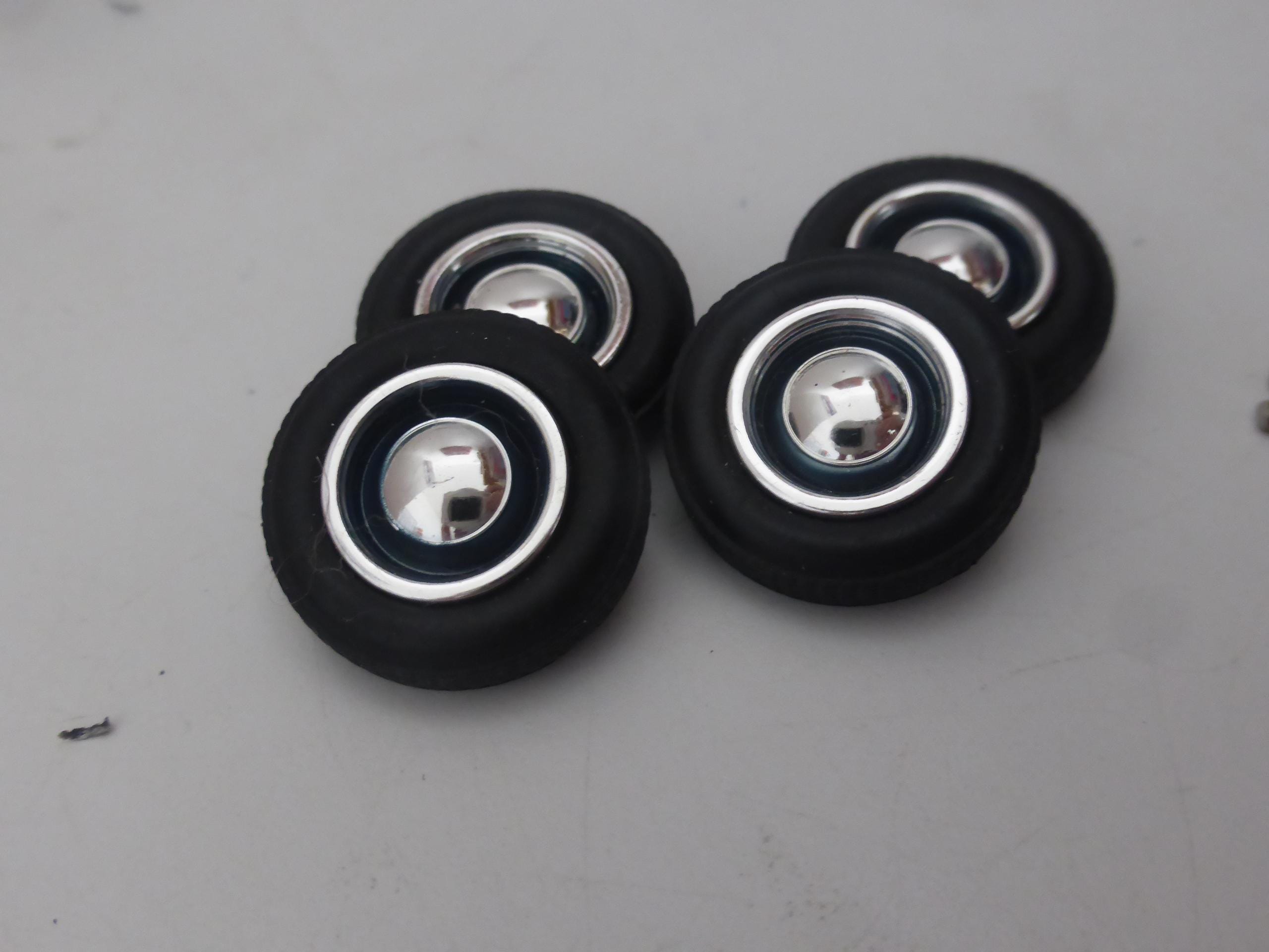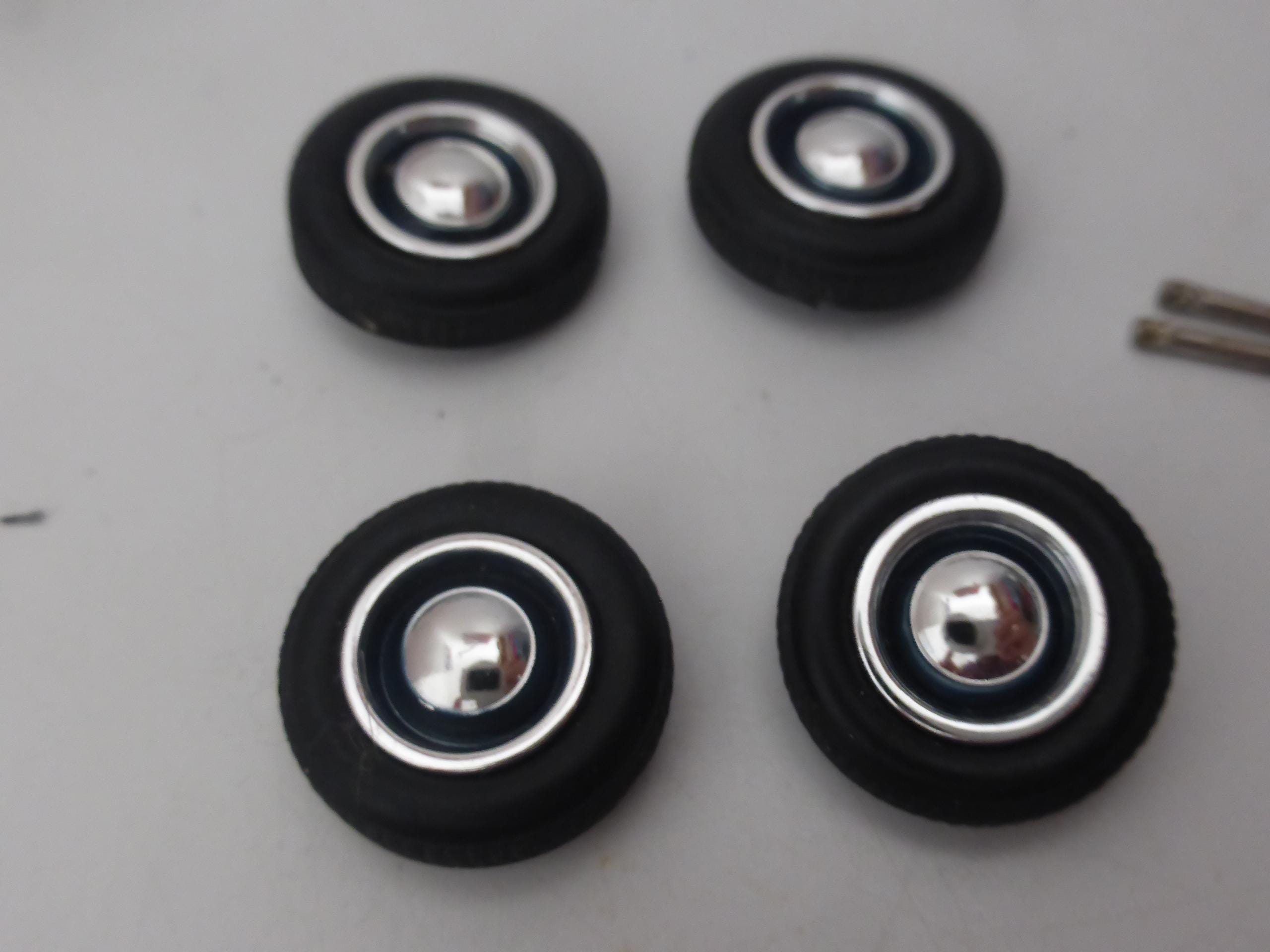 1:43 scale chromed plastic rims with rubber treaded tires. Two metal axles included.