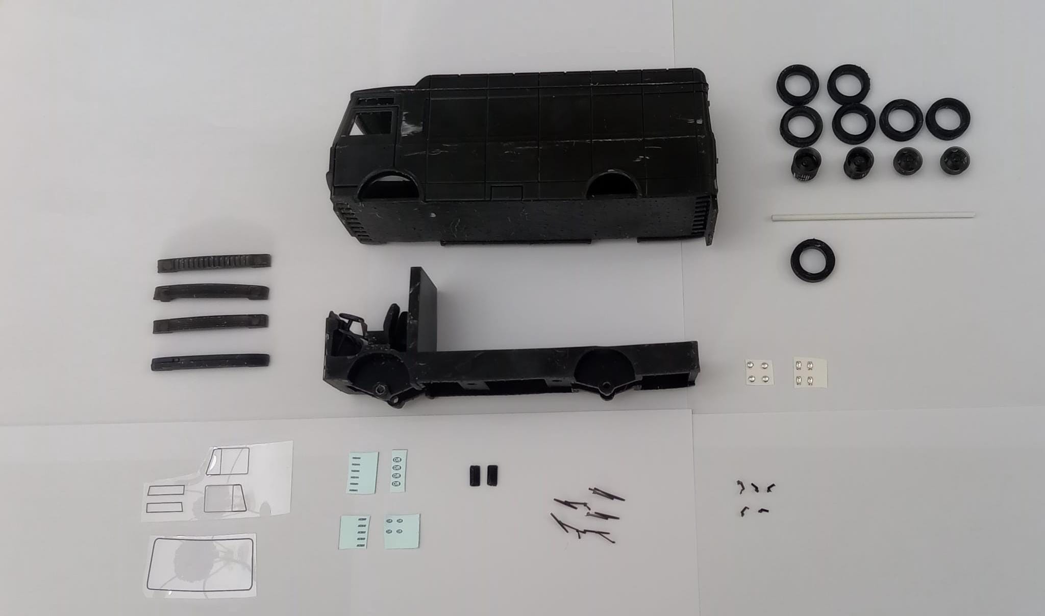 A simple but well detailed kit with all the basic elements, including optical lights, windows (to cut and to glue), decals with logos and so on.