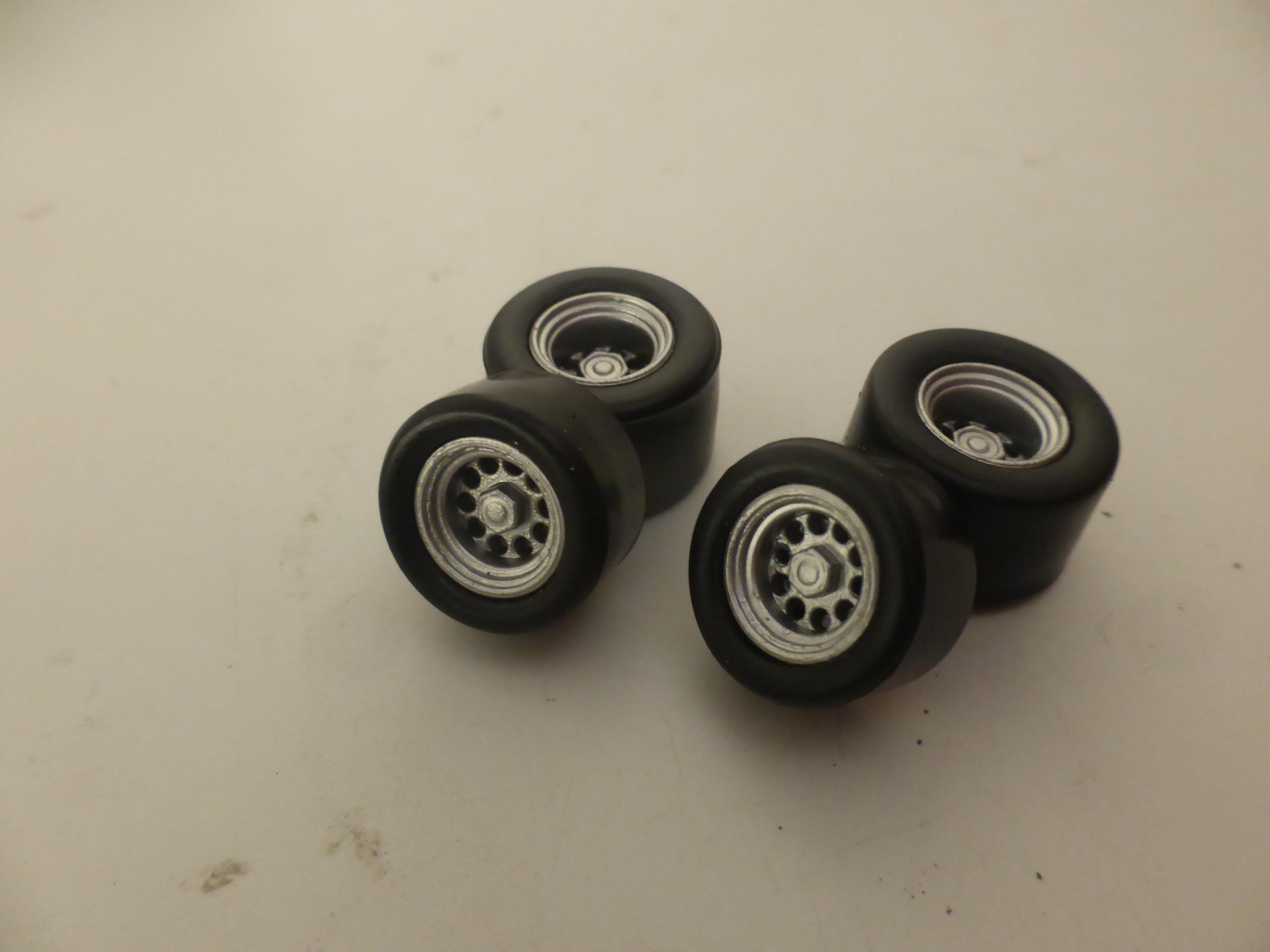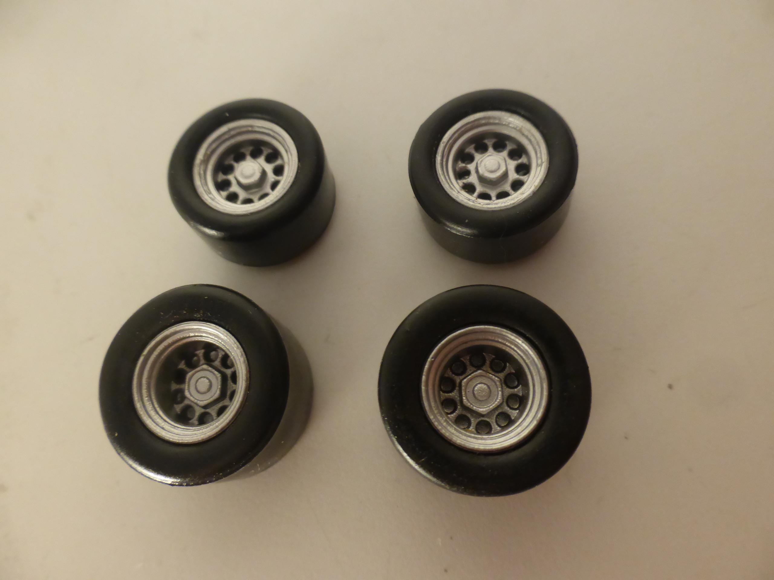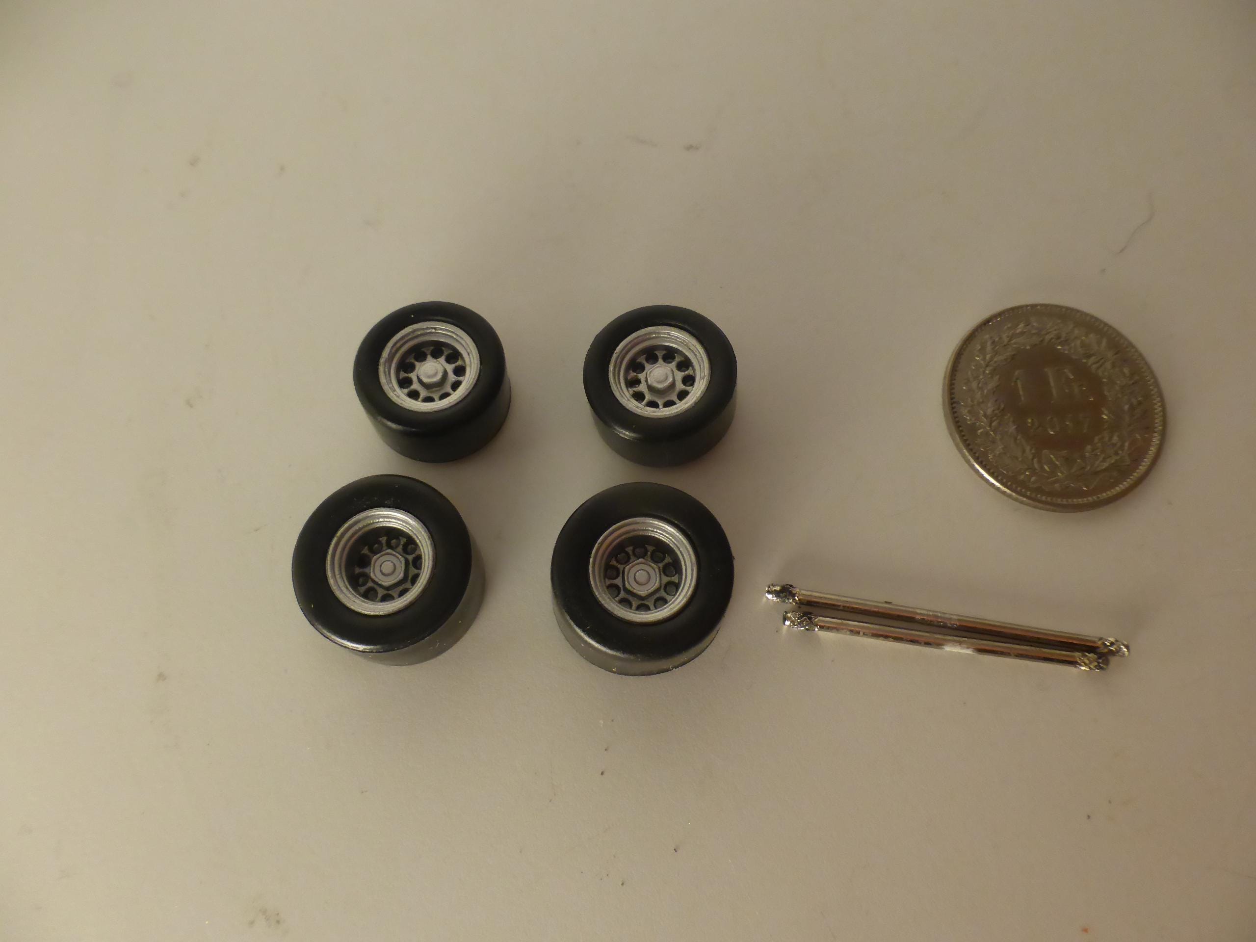 1:43 scale plastic rims with tires (slick). Two metal axles included.