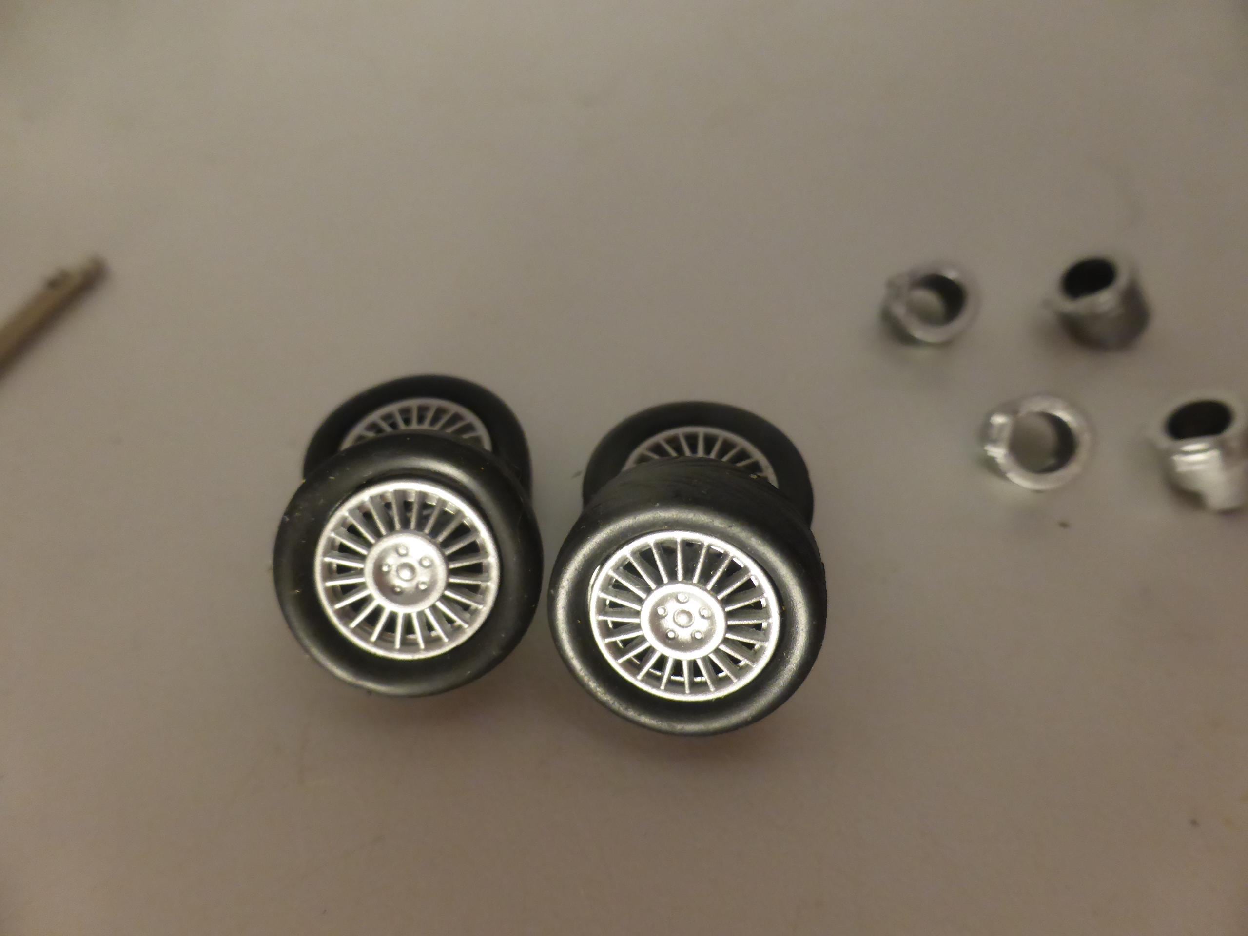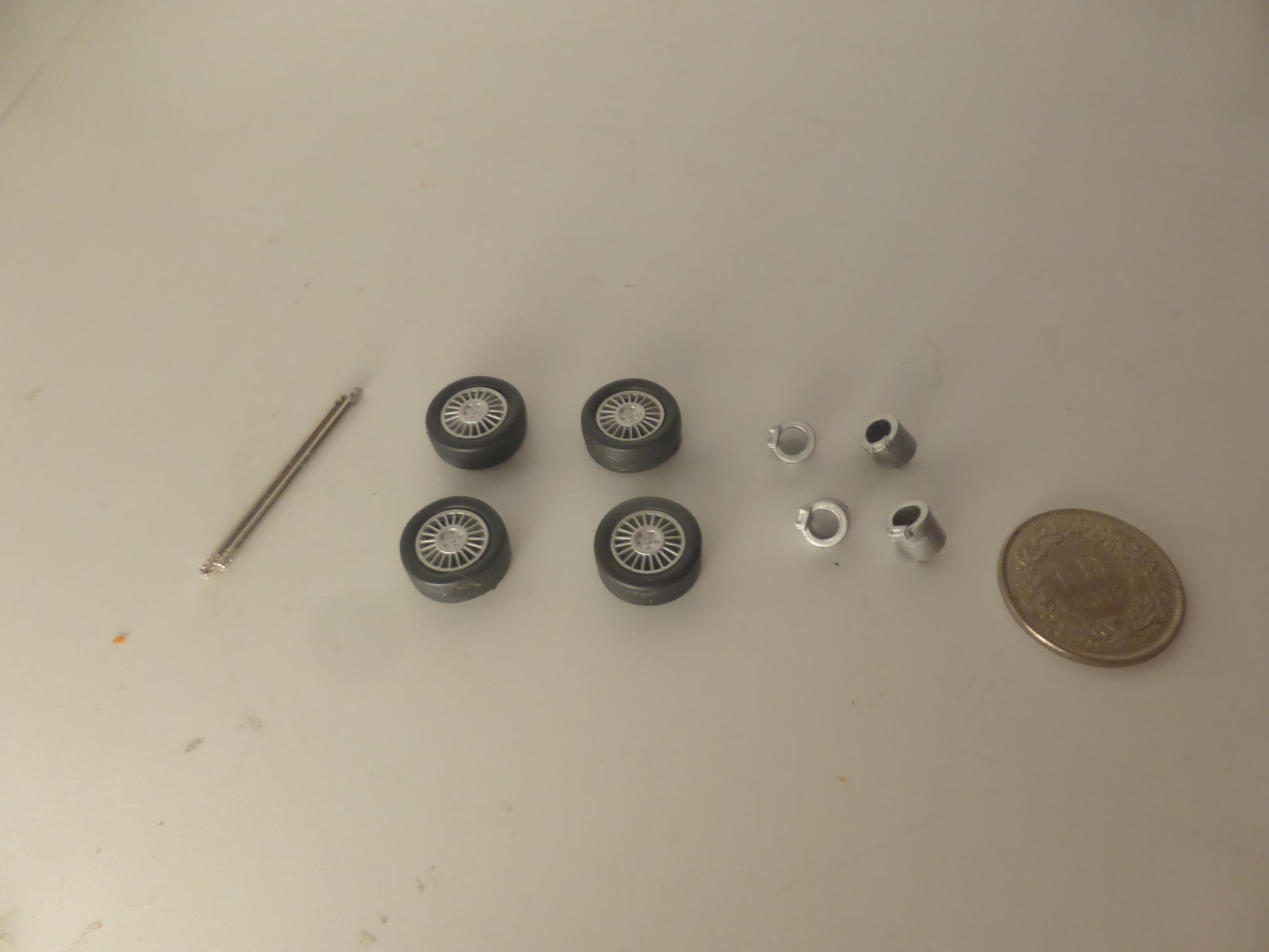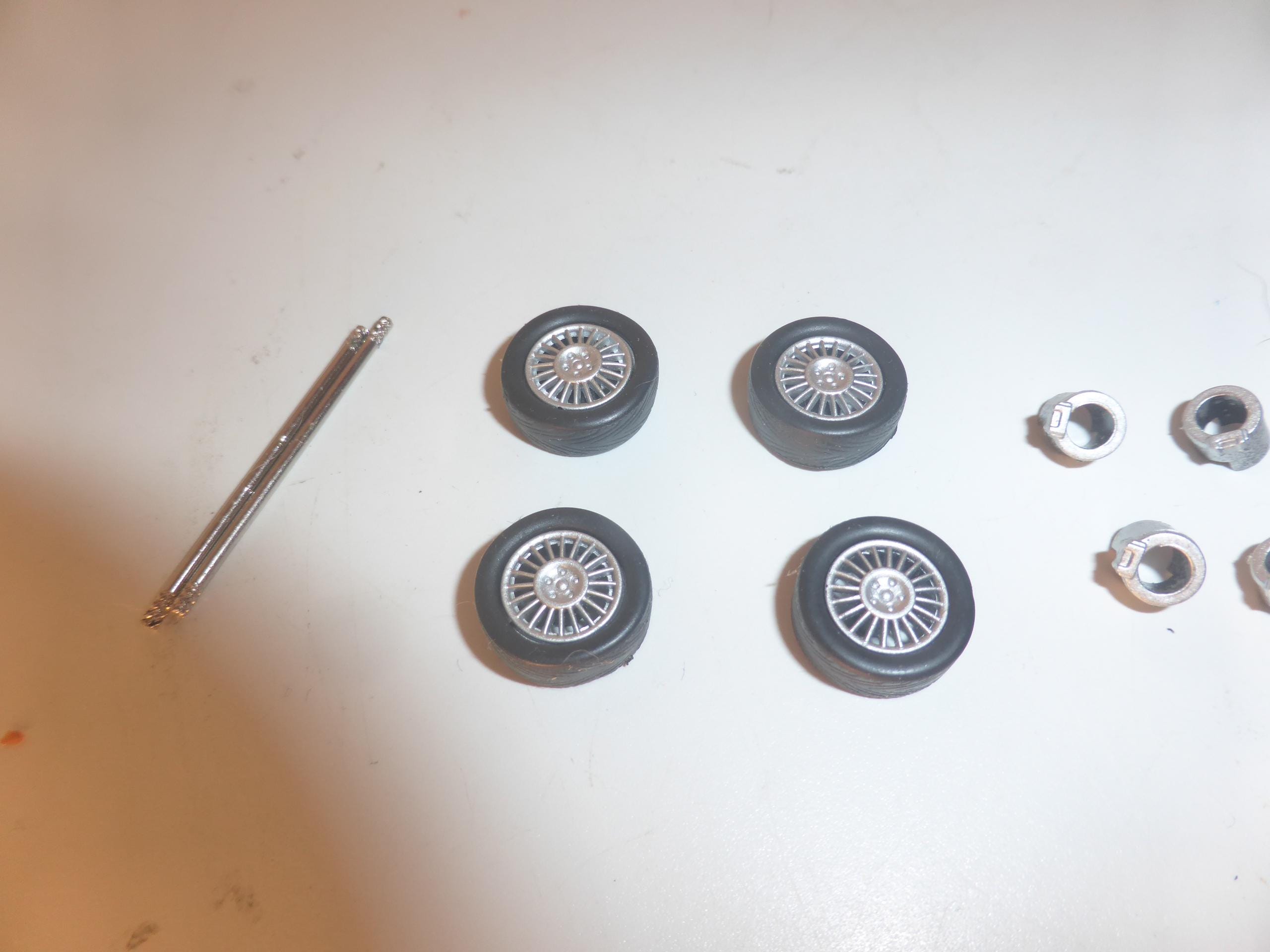 1:43 scale plastic rims with tires. Two metal axles and brake disks included.