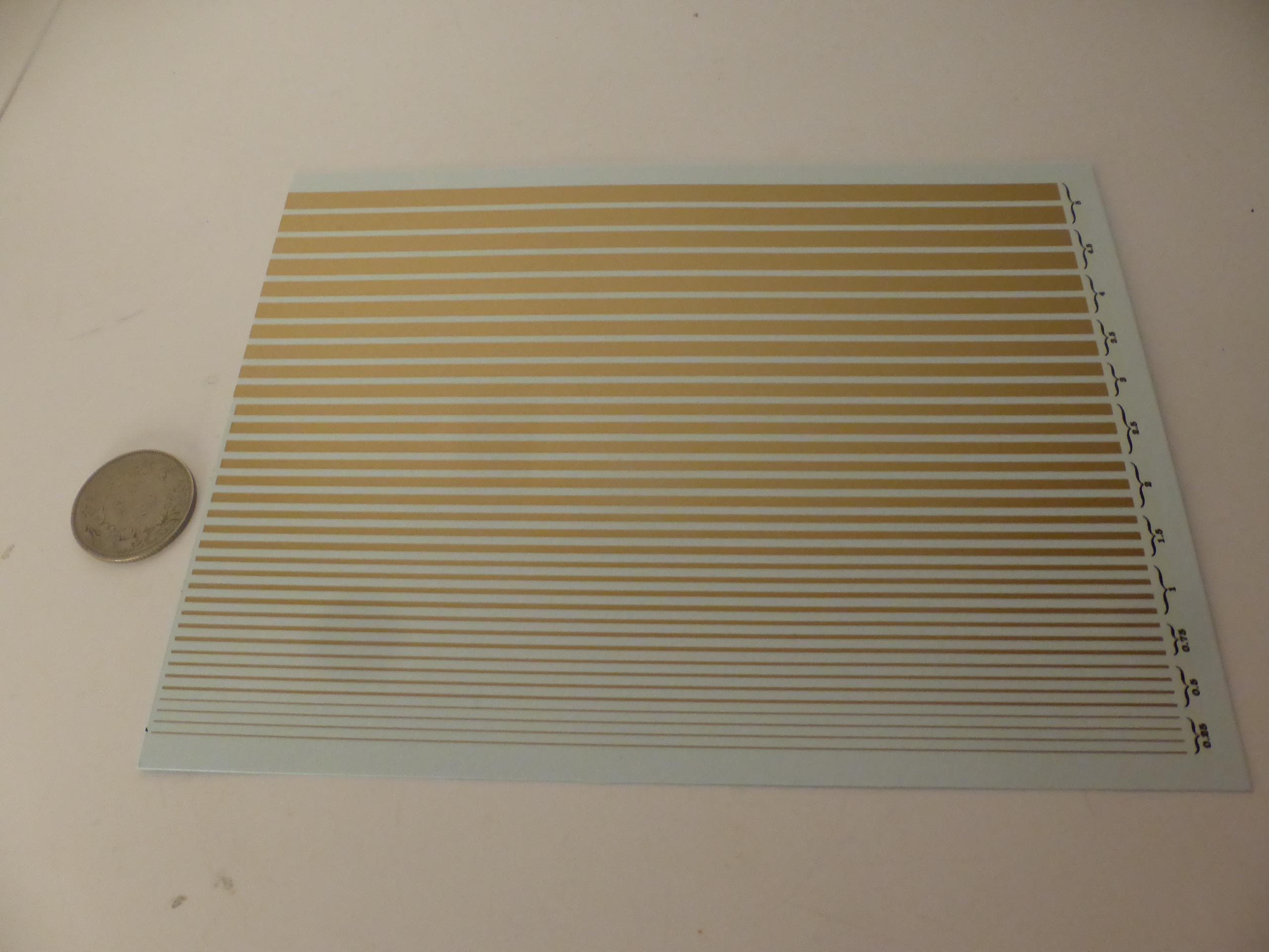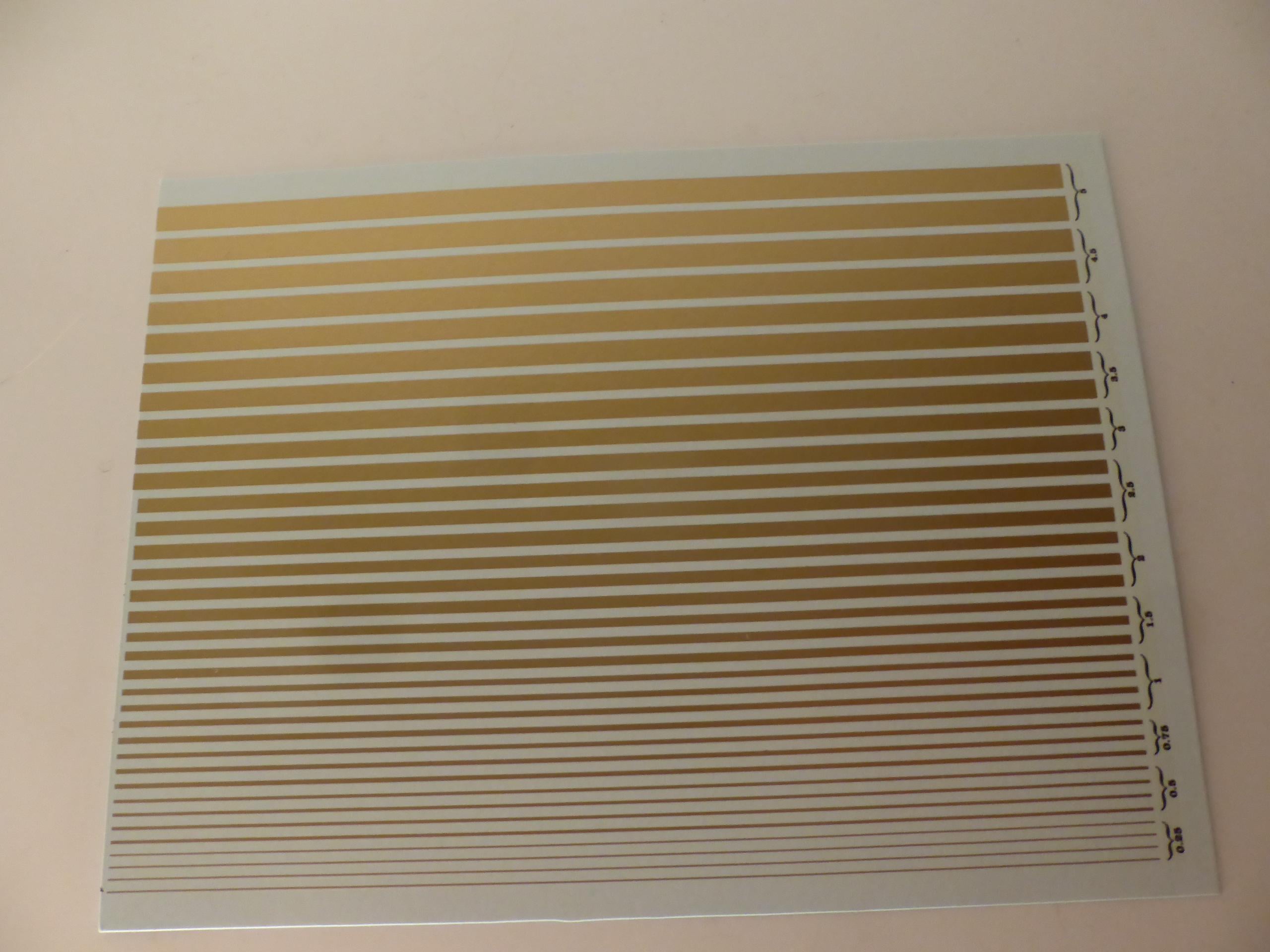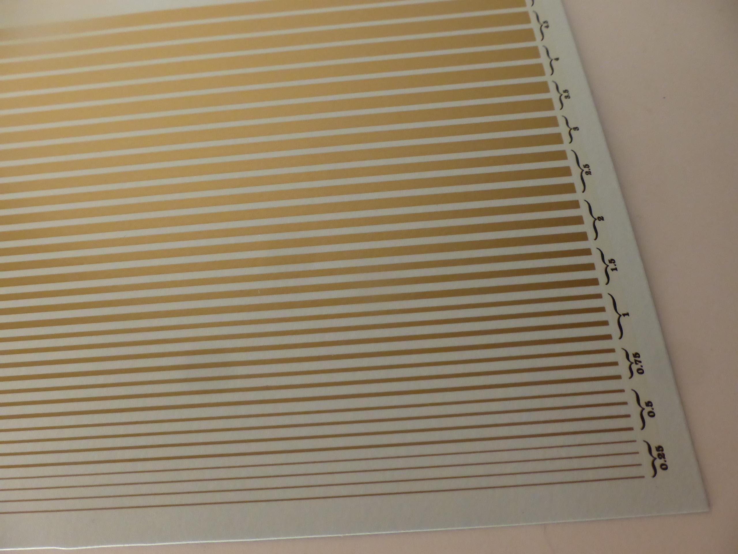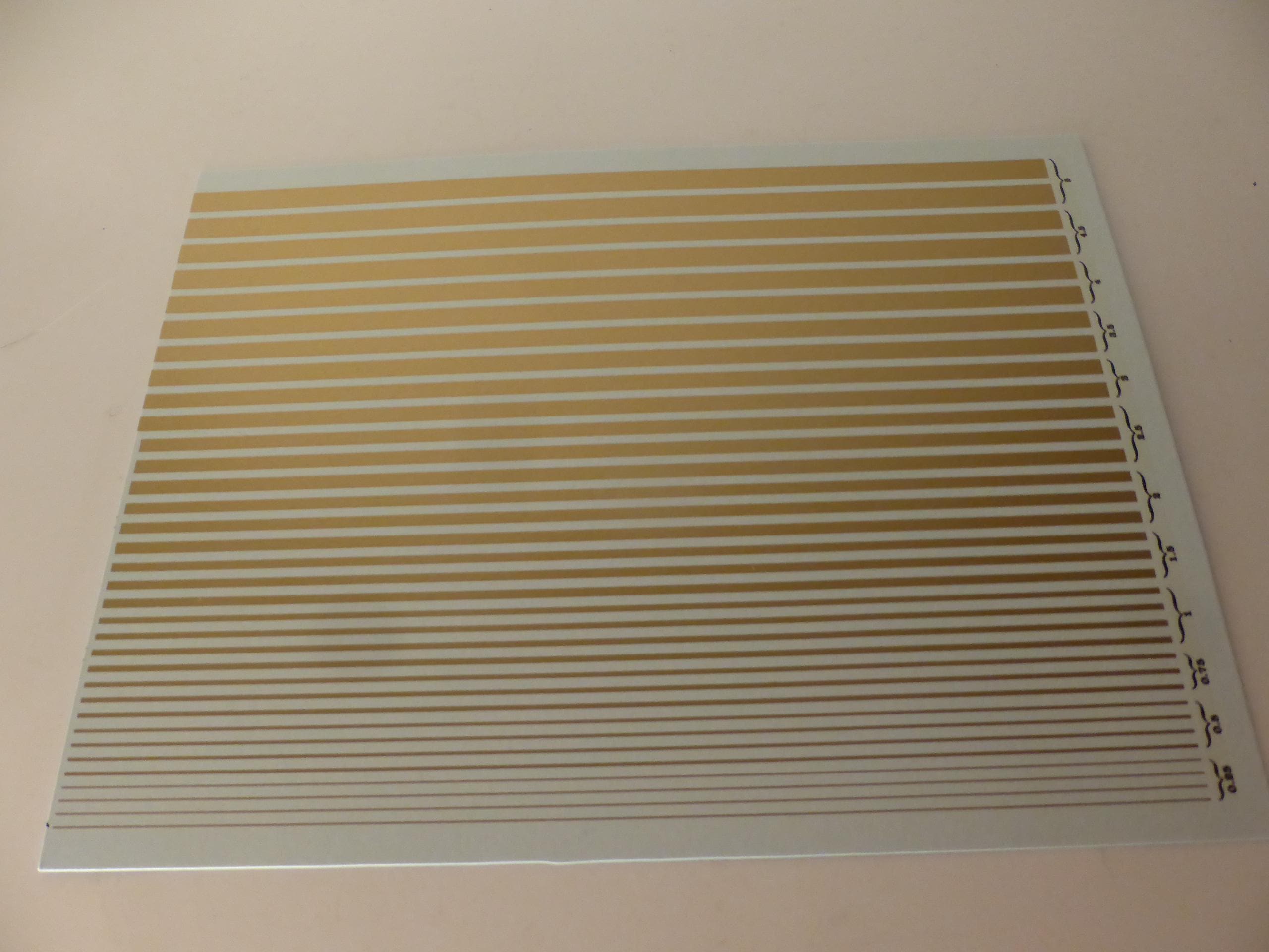 First quality waterslide decals sheet, 1:43, gold colour stripes of the following widths: mm 0.25 / 0.5 / 0.75 / 1.00 / 1.5 / 2.0 / 2.5 / 3.0 / 3.5 / 4 / 4.5 / 5.0.