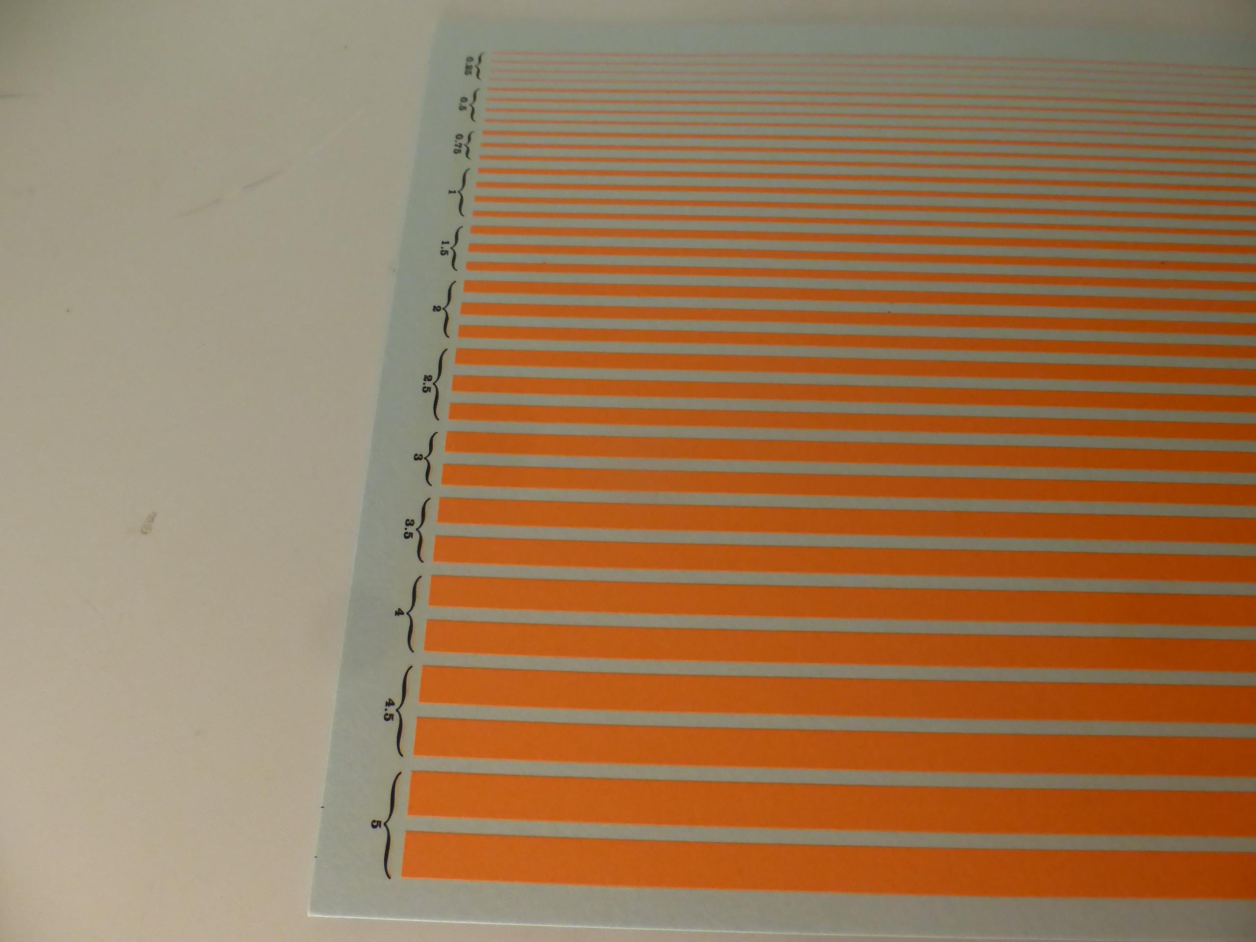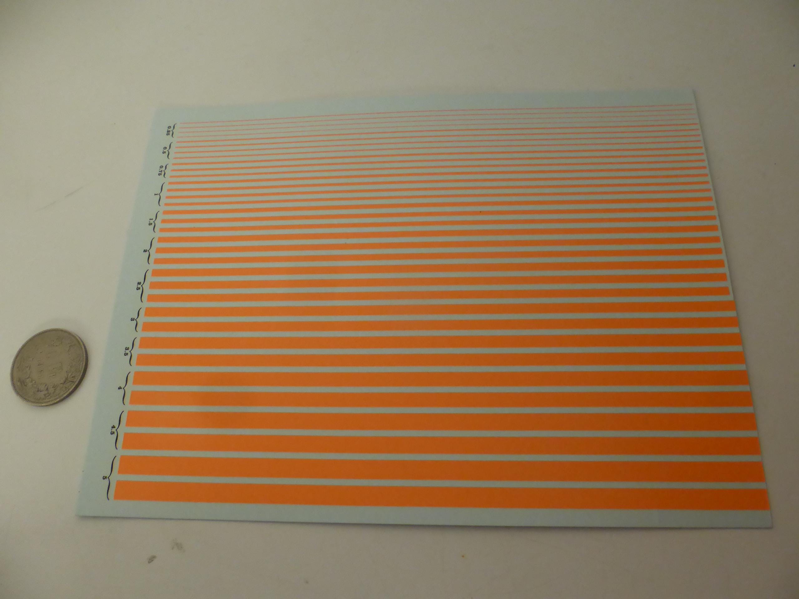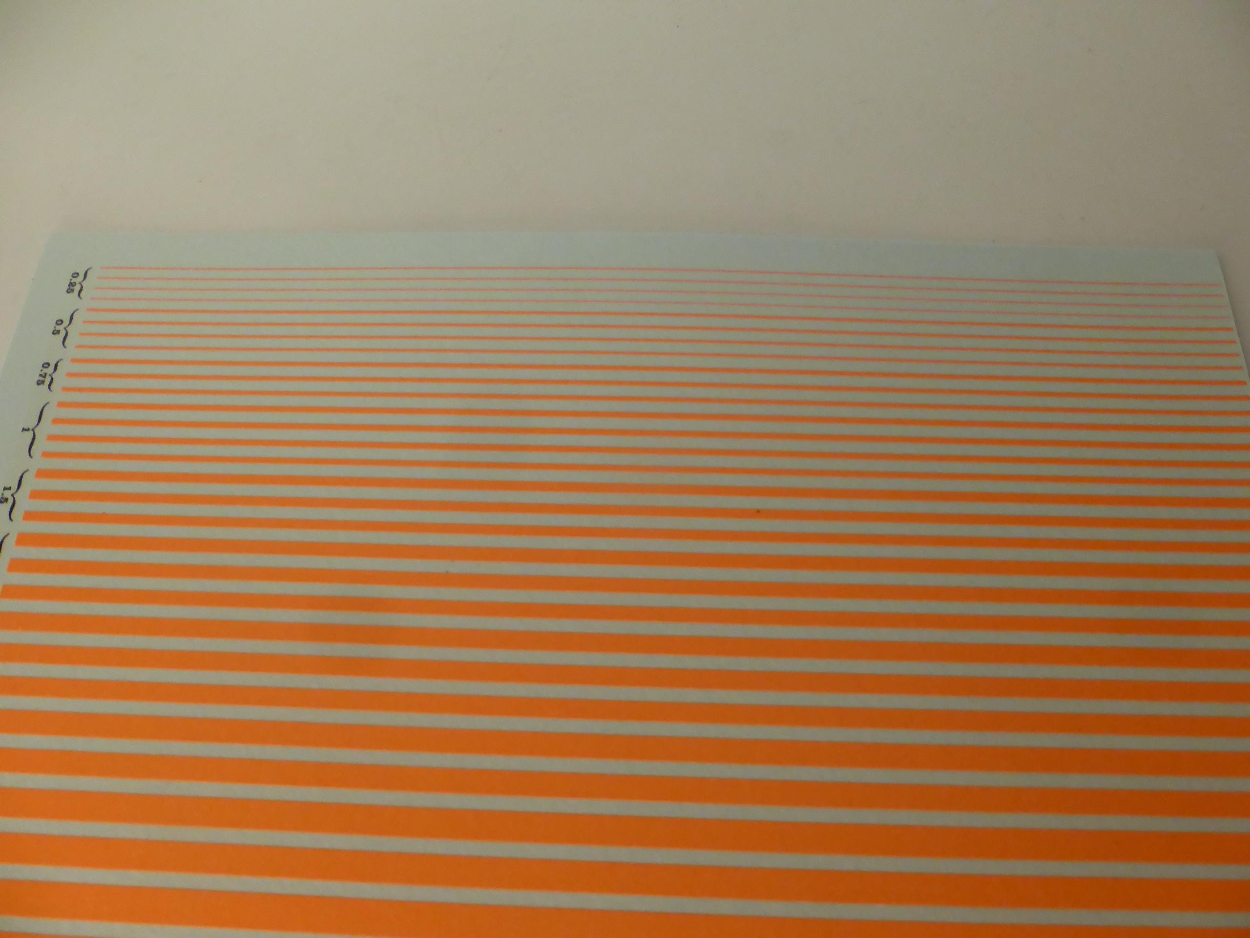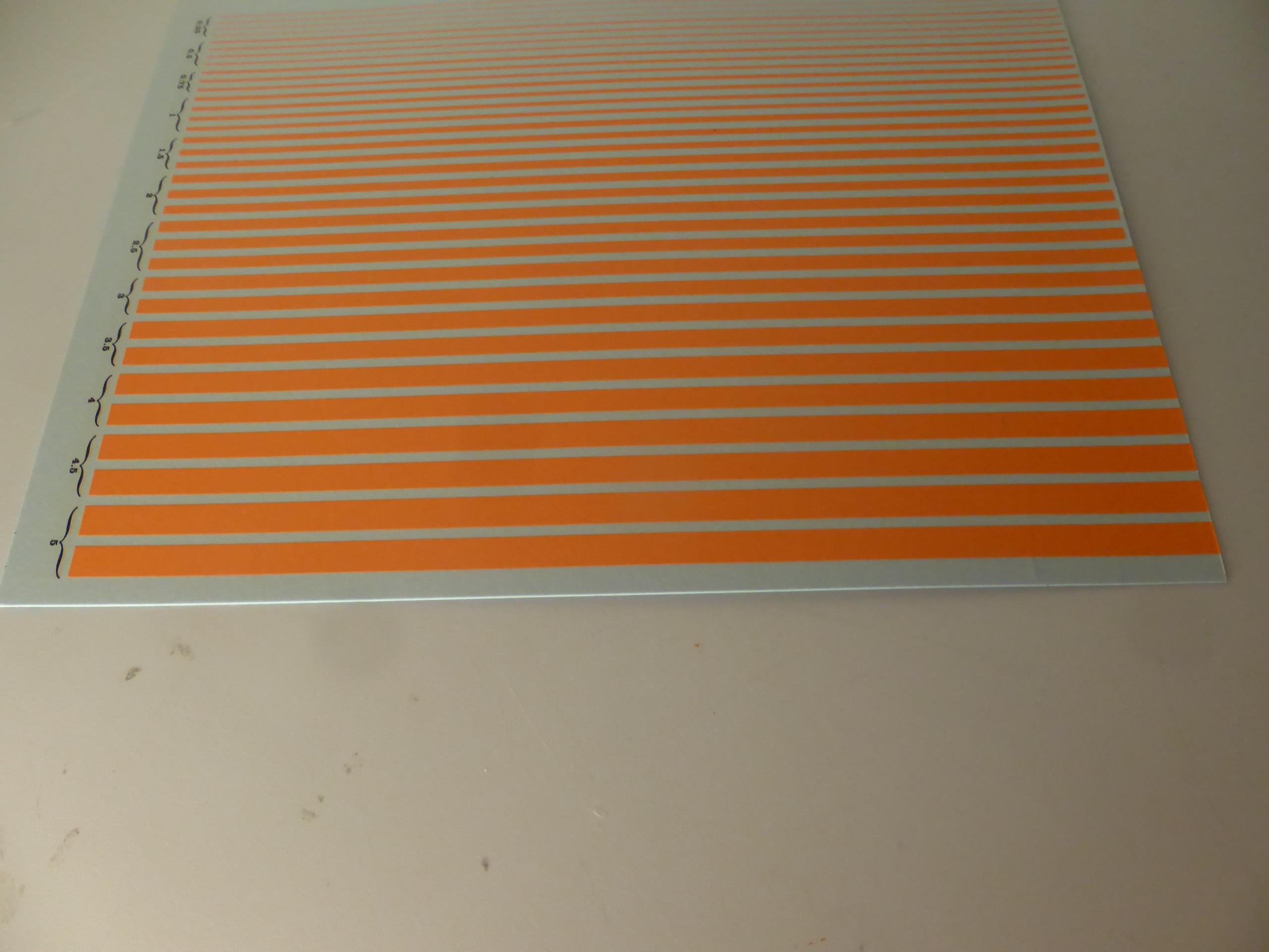 First quality waterslide decals sheet, 1:43, dayglo matt orange colour stripes of the following widths: mm 0.25 / 0.5 / 0.75 / 1.00 / 1.5 / 2.0 / 2.5 / 3.0 / 3.5 / 4 / 4.5 / 5.0.