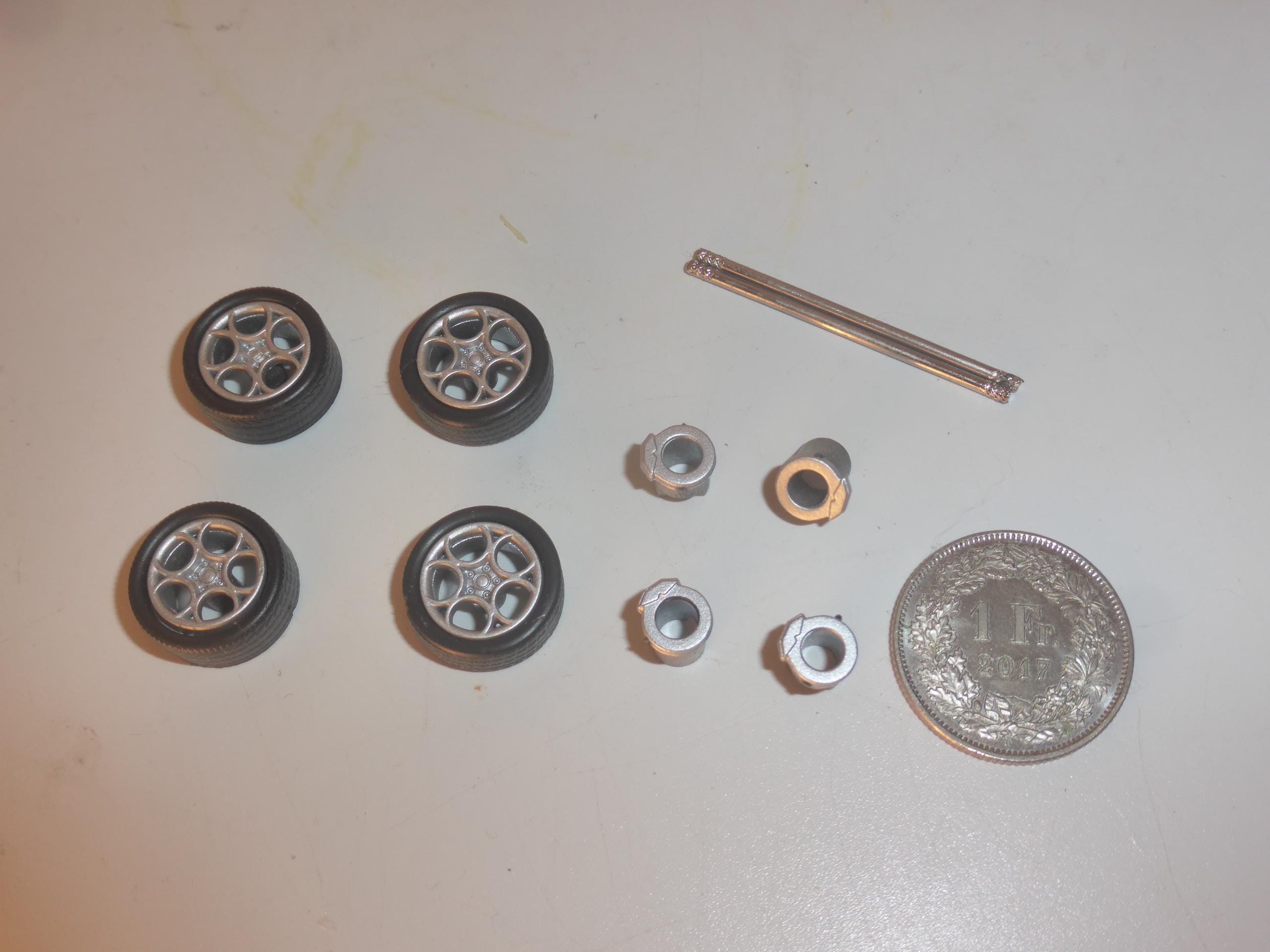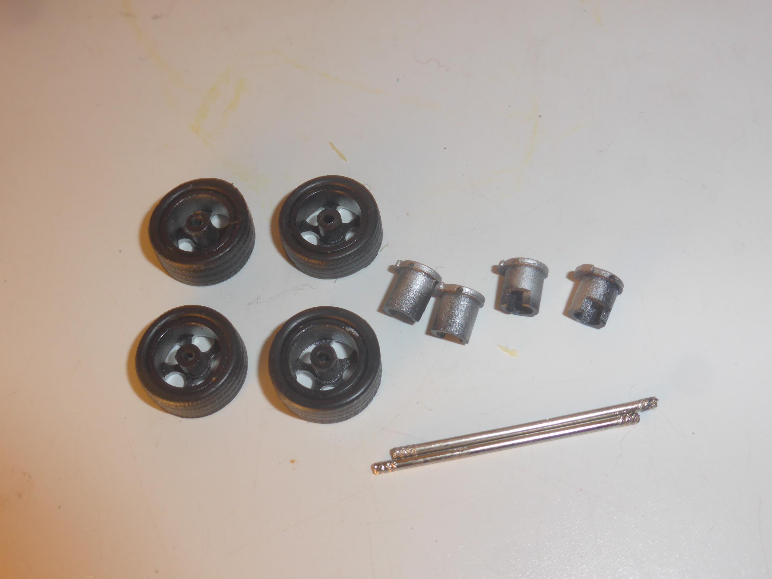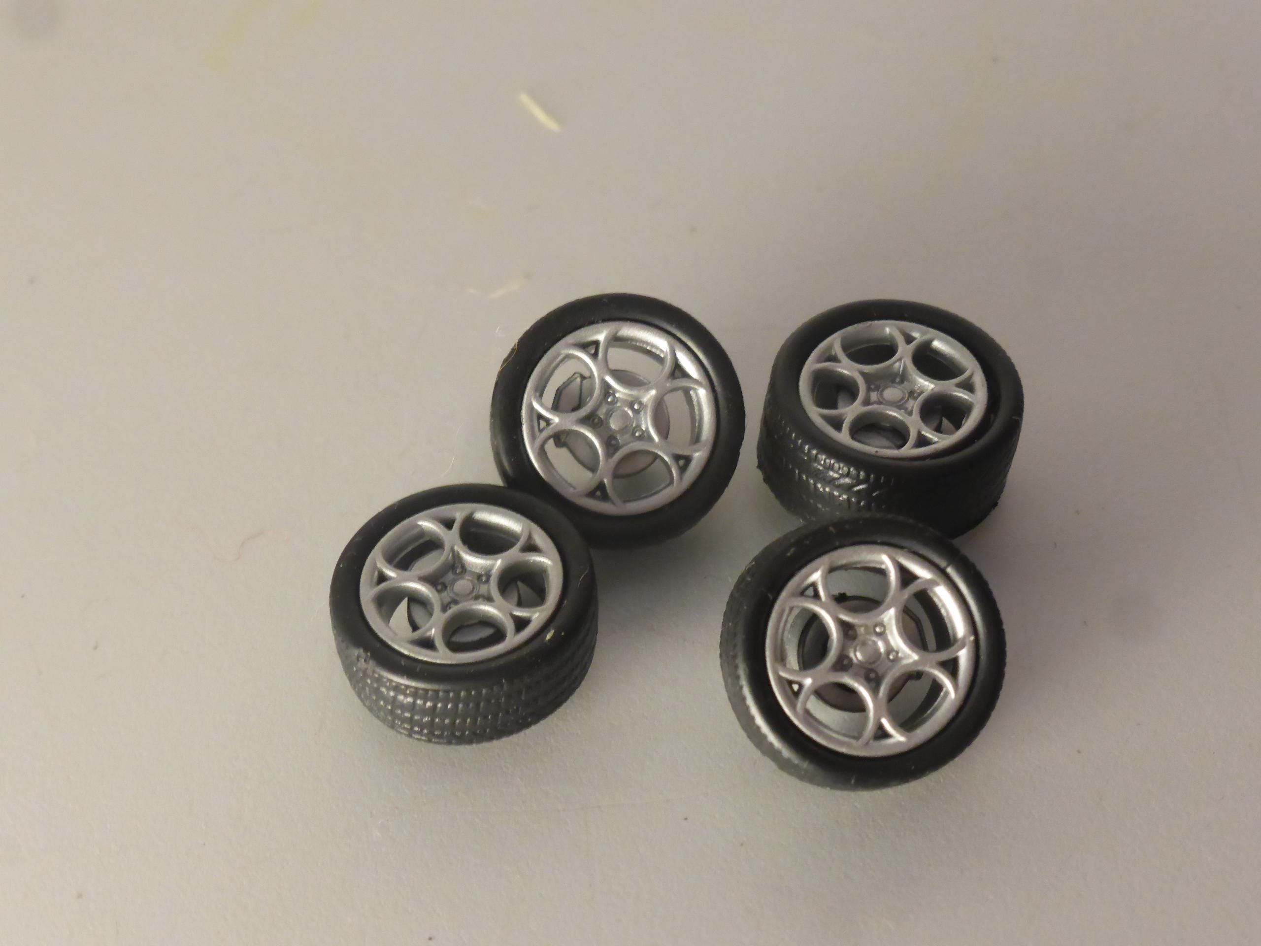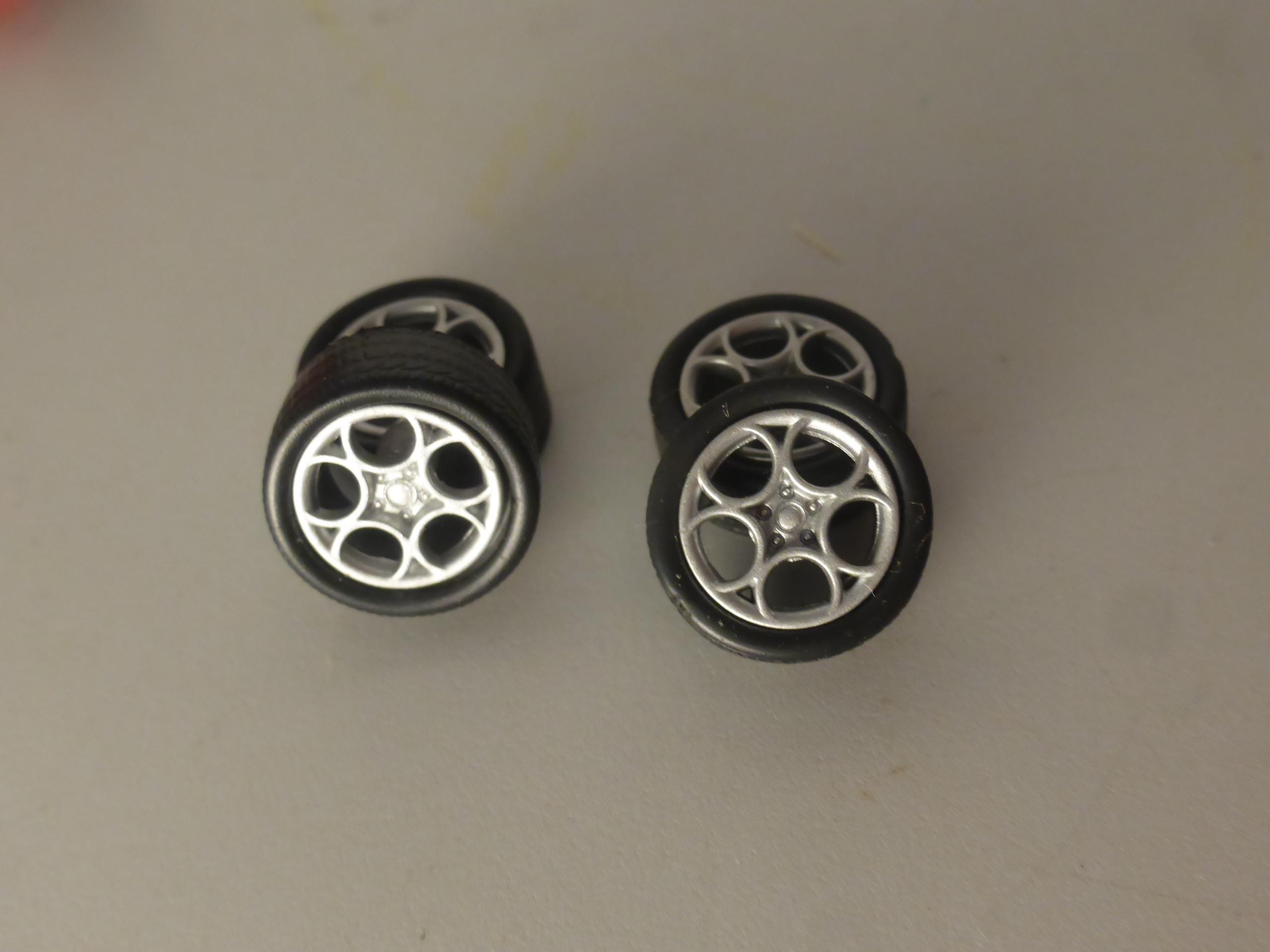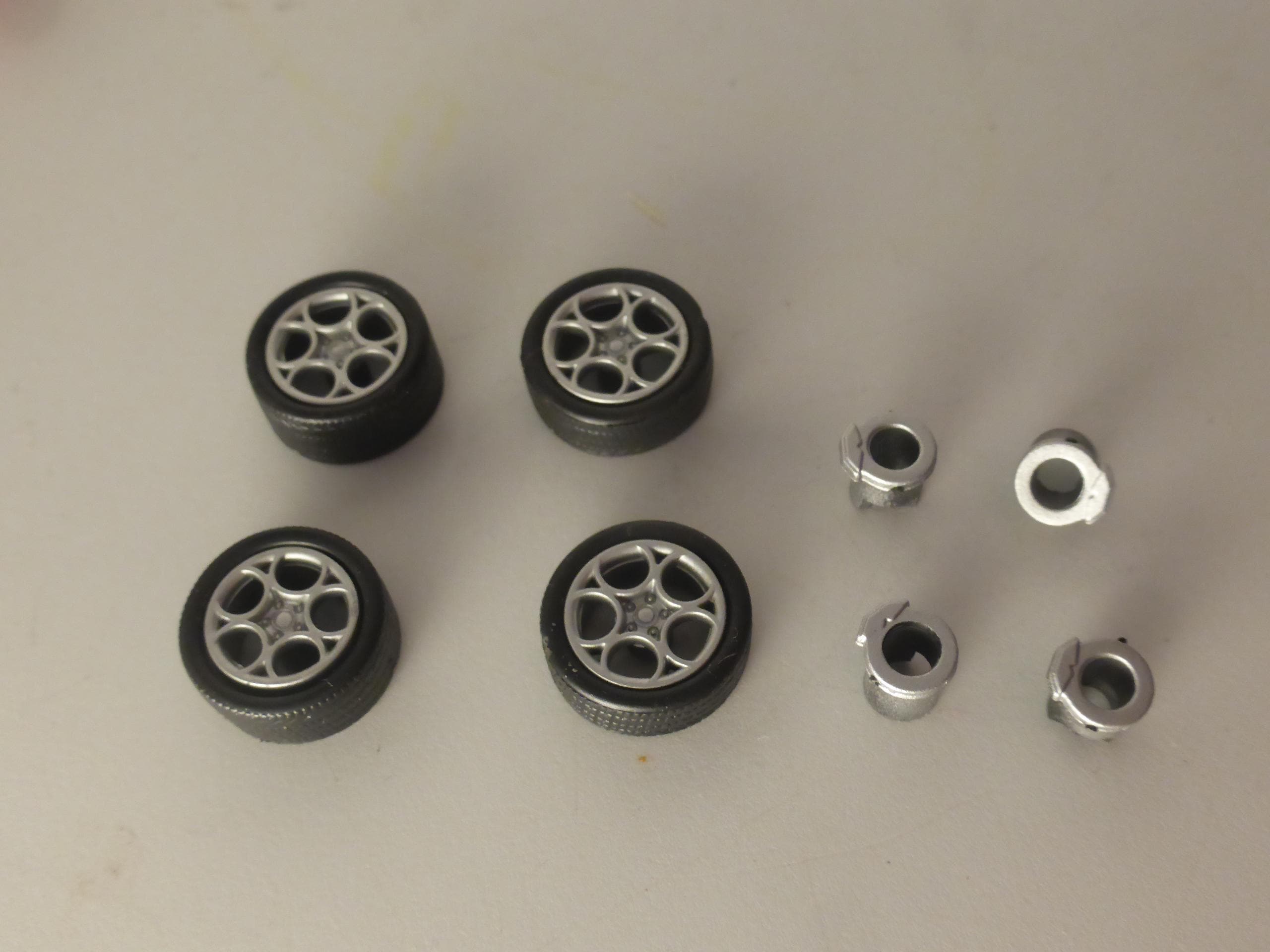 1:43 scale plastic rims with treaded tires. Brake disks and 2x fitting metal axles are included.