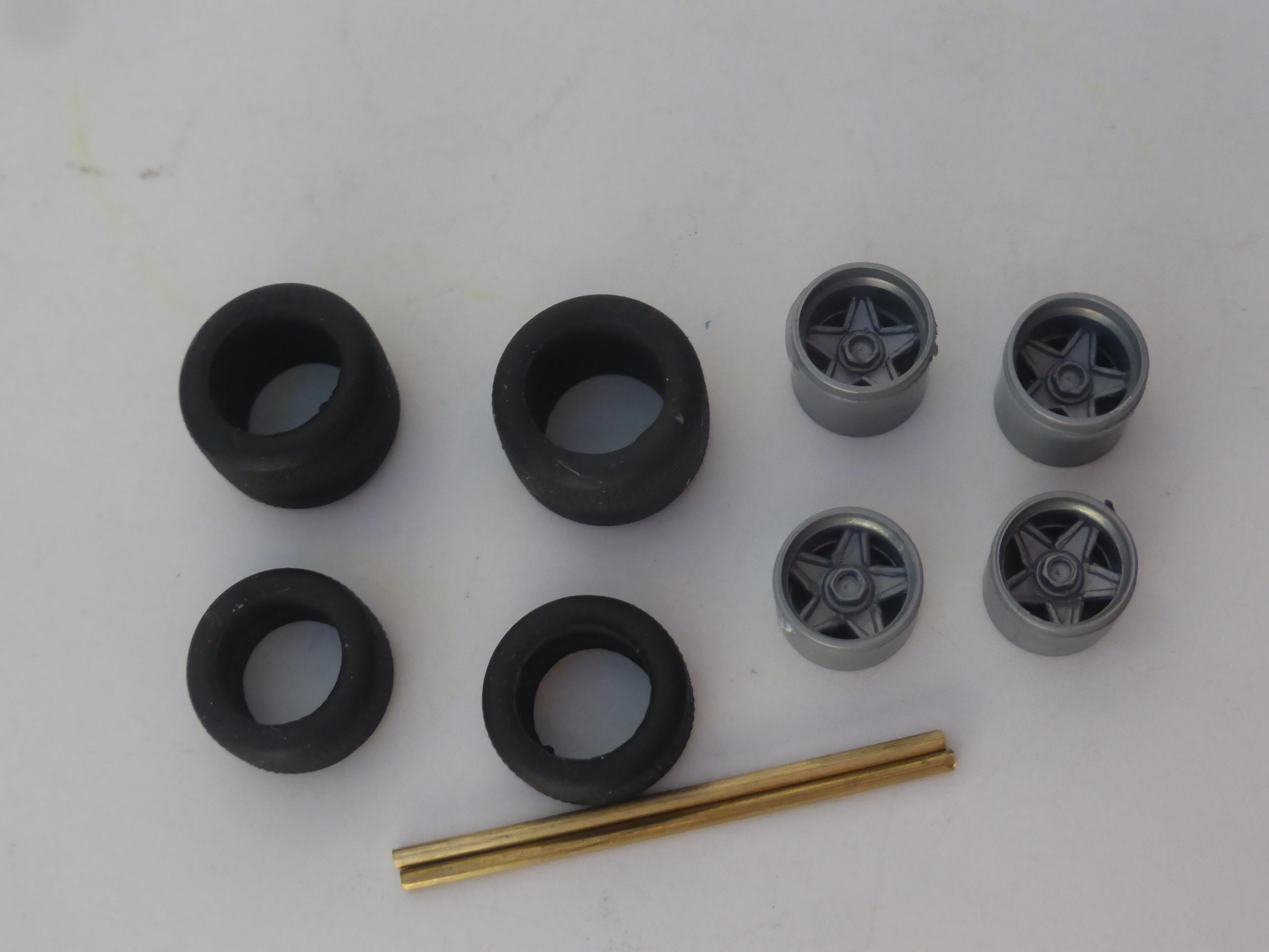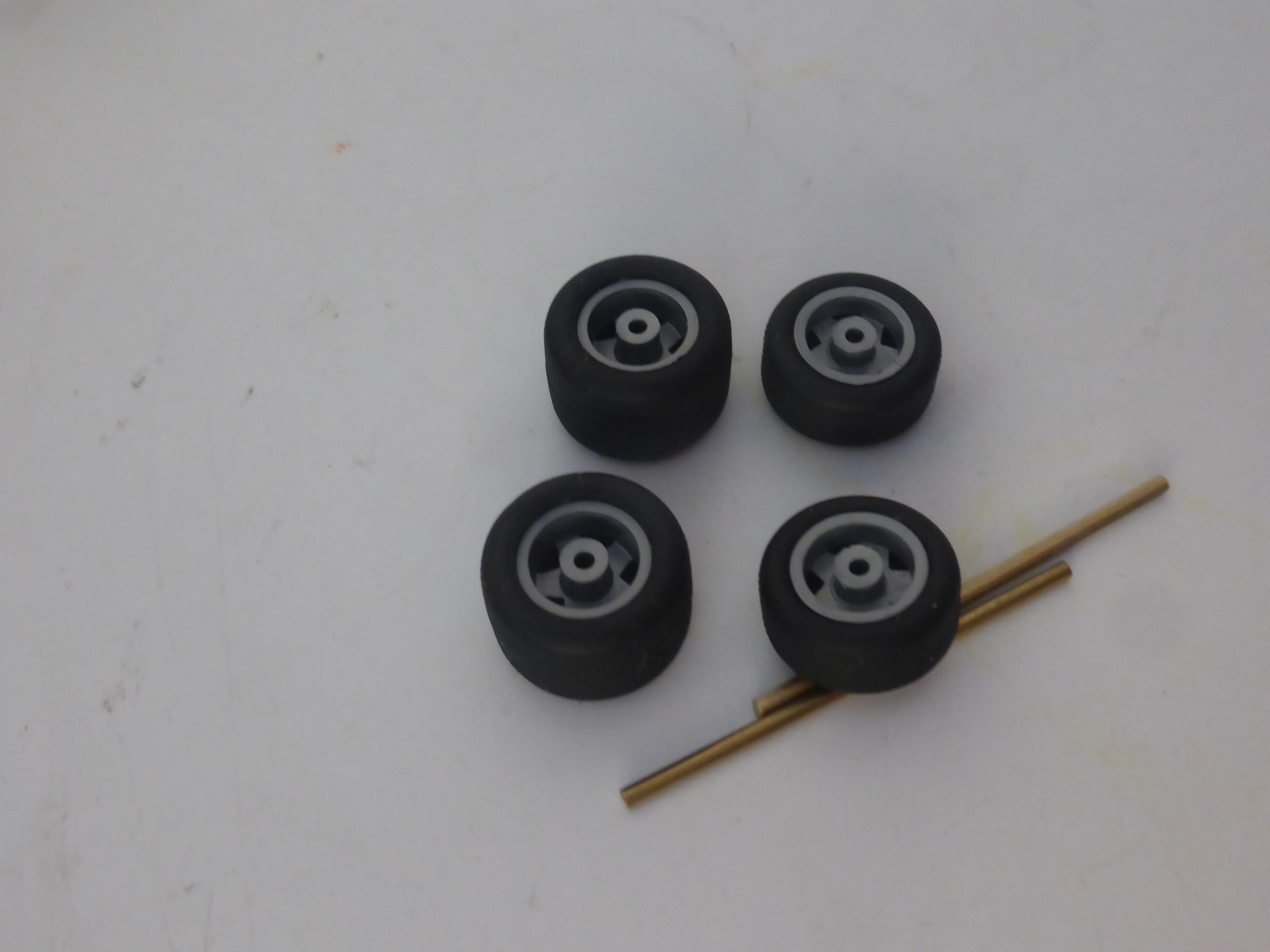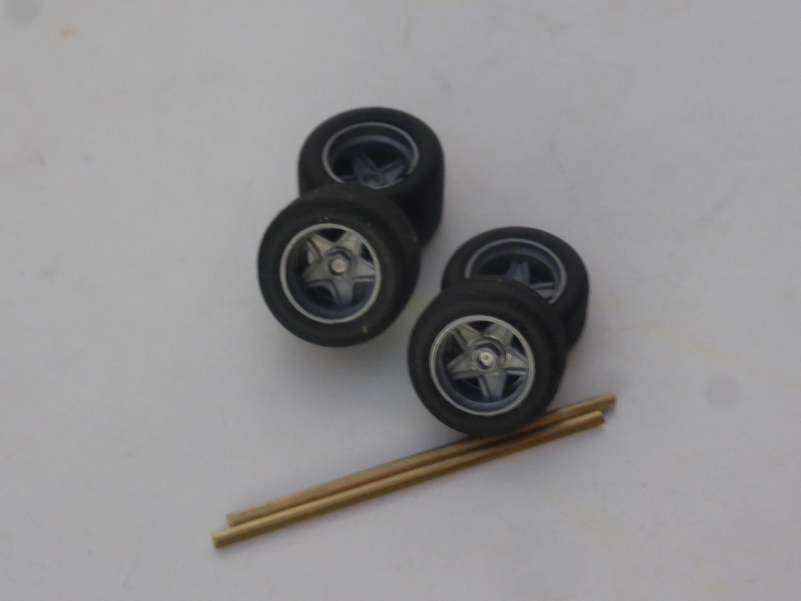 High definition plastic rims with first quality treaded rubber tires. To paint.
