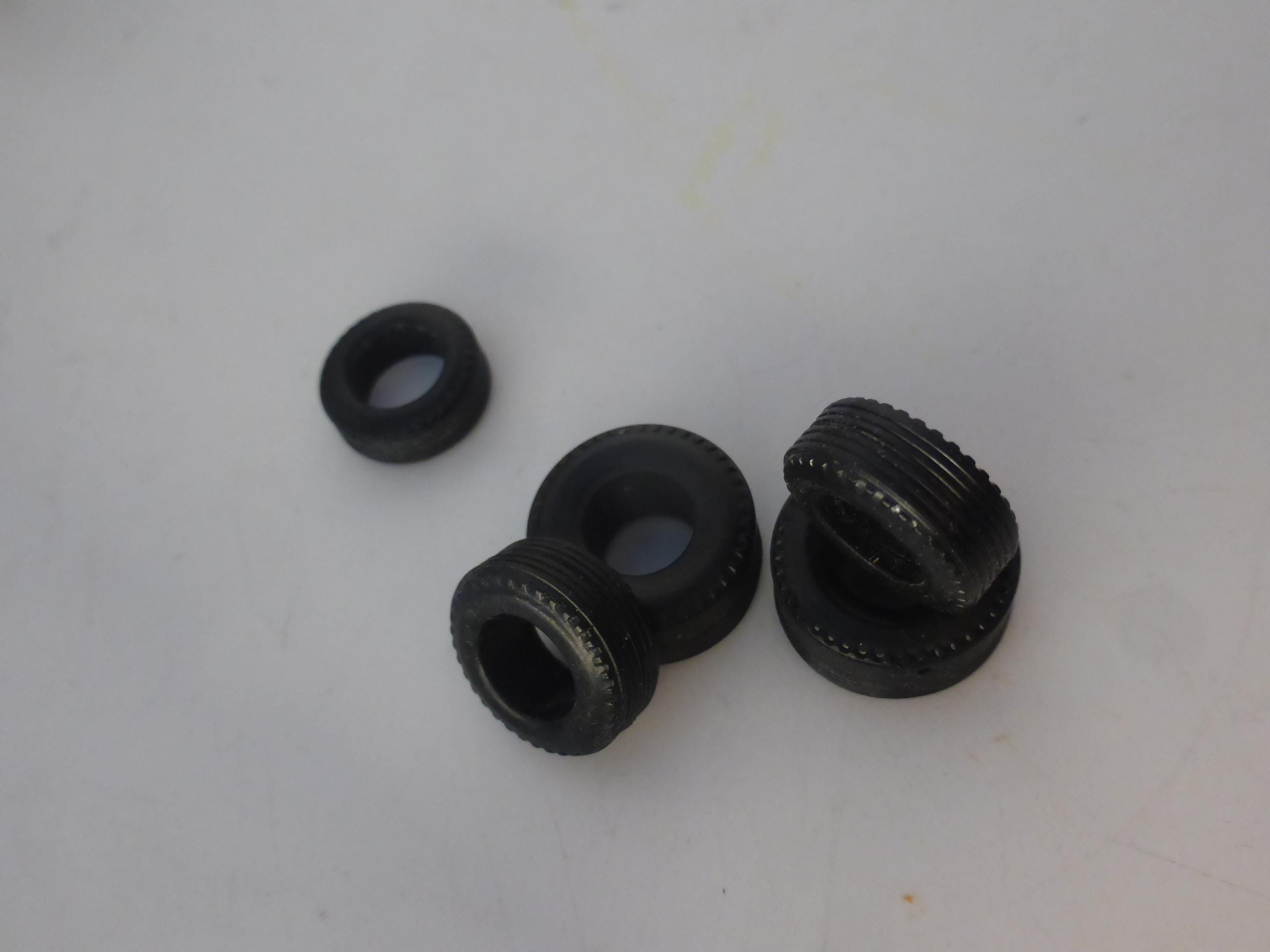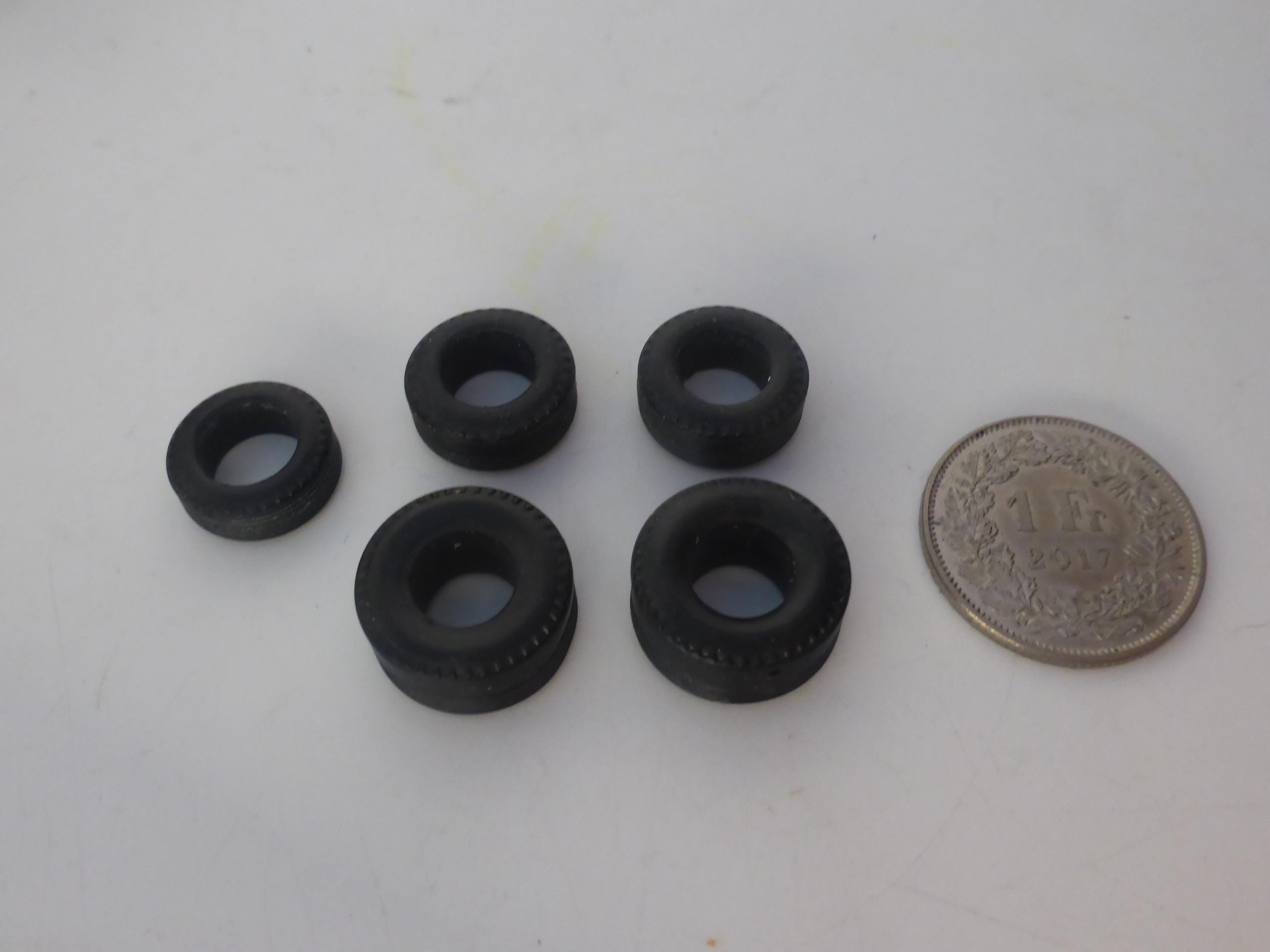 Set of 5 tires (including small spare tire to me mounted on the rear of the car), rubber. Treaded (see photos).